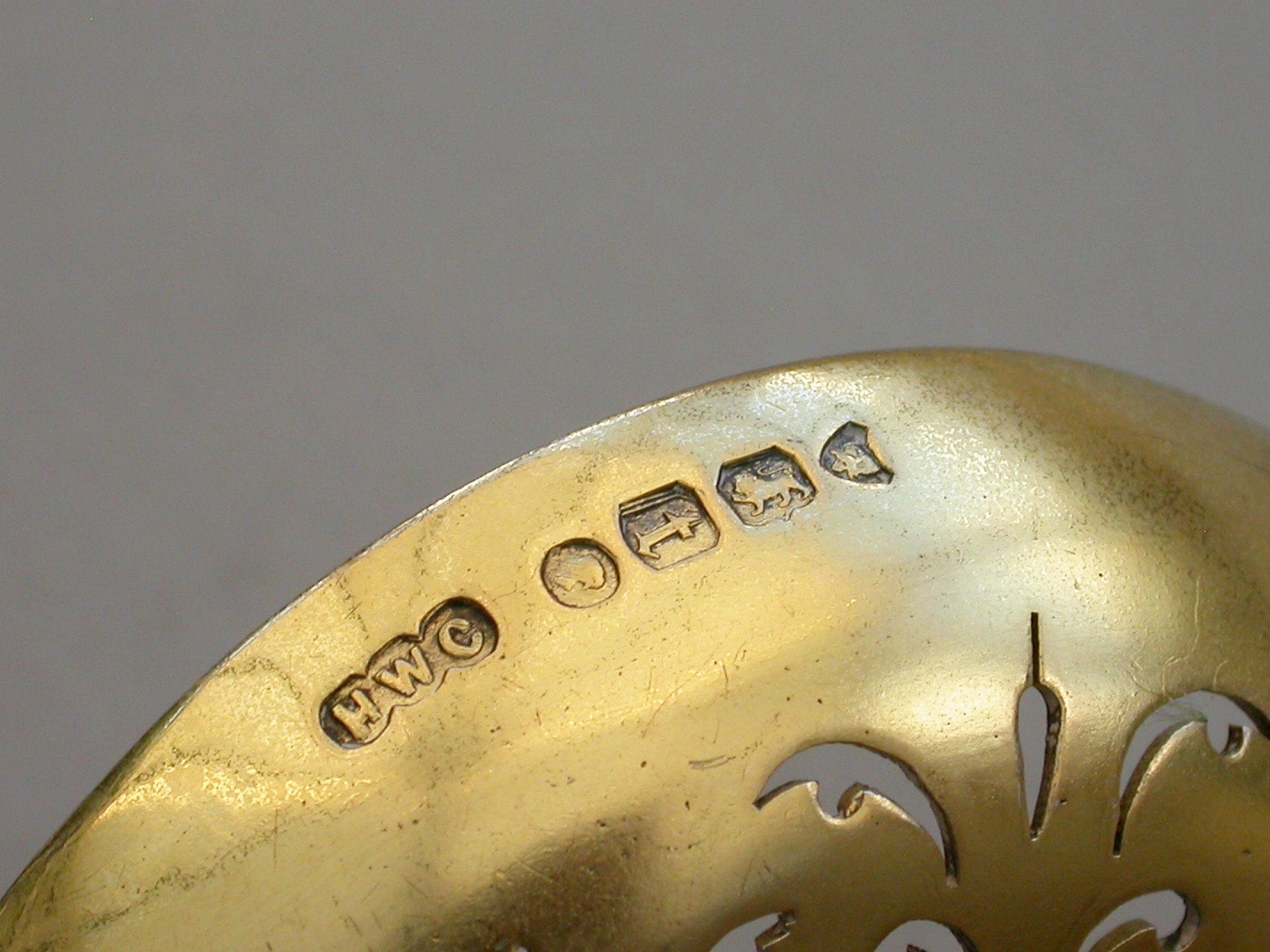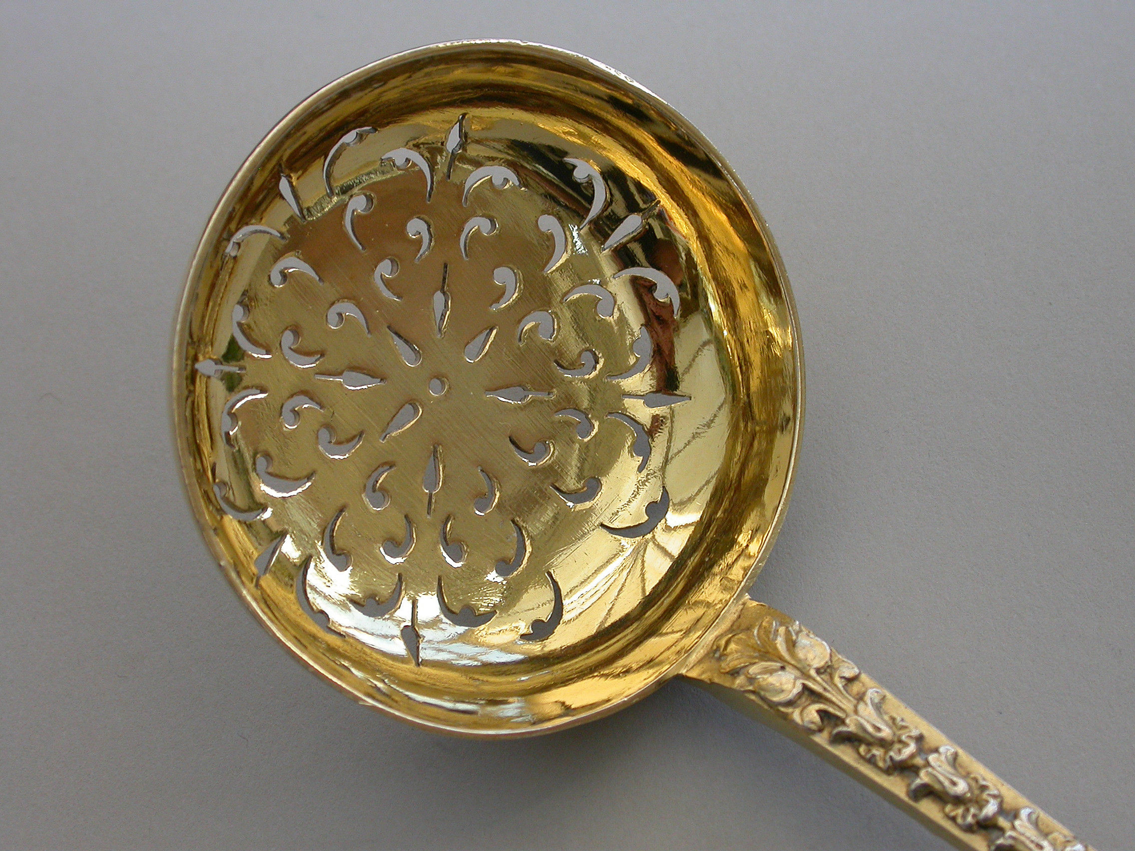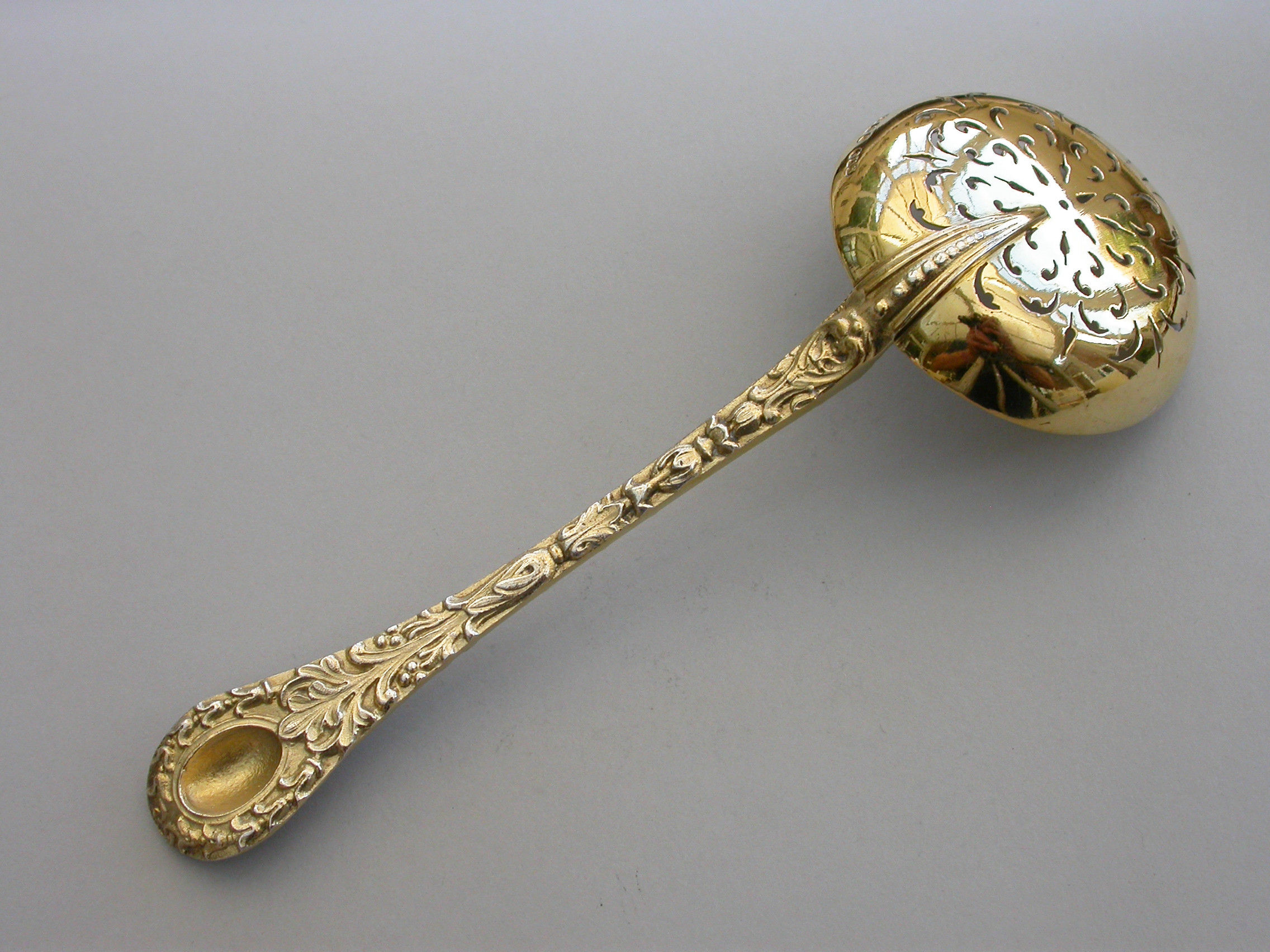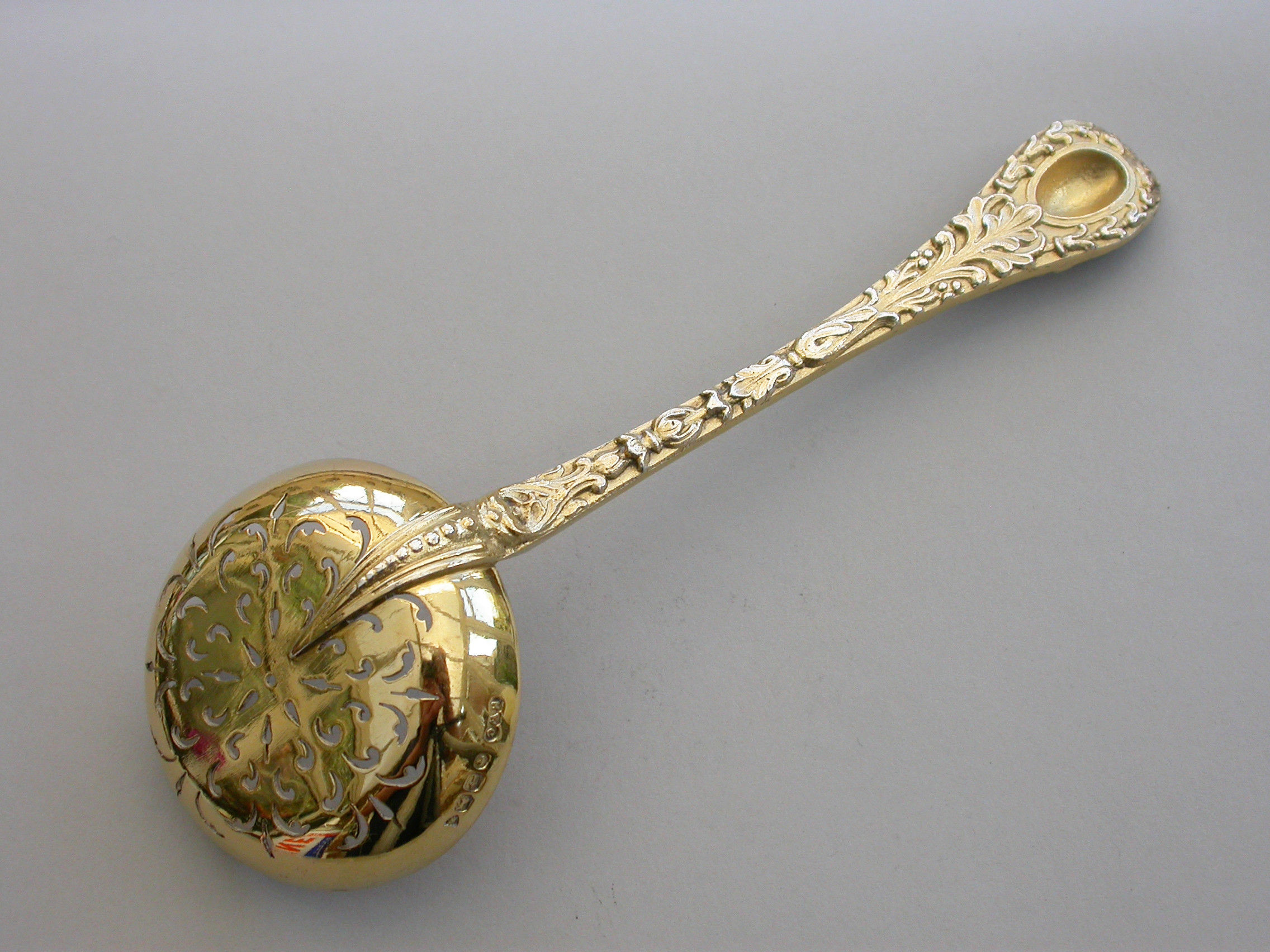 A very fine quality Victorian cast silver gilt Sugar Sifter Ladle with plain circular pierced bowl, the heavy gauge handle chased with harebell flowerheads and leaves, a female mask head terminal with oval concave back.