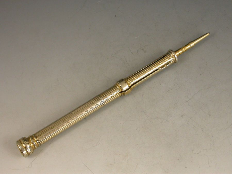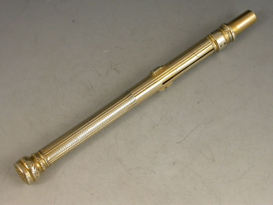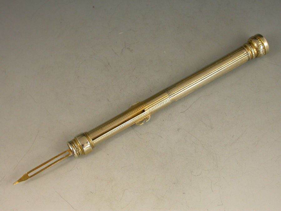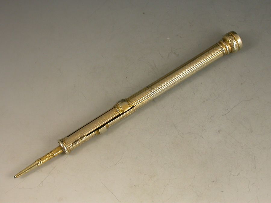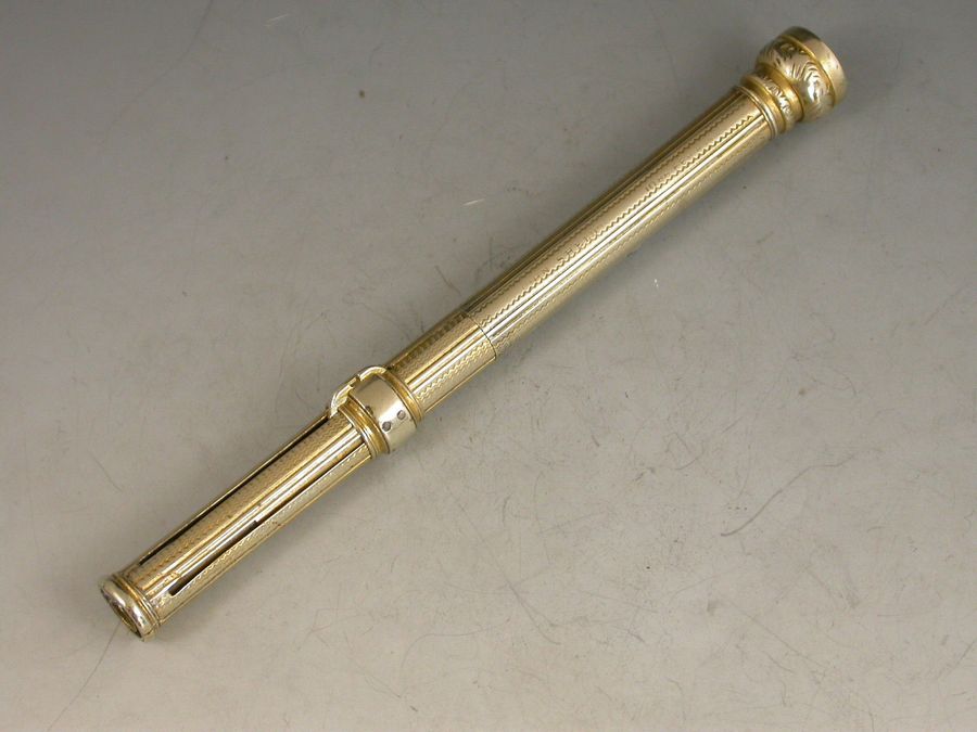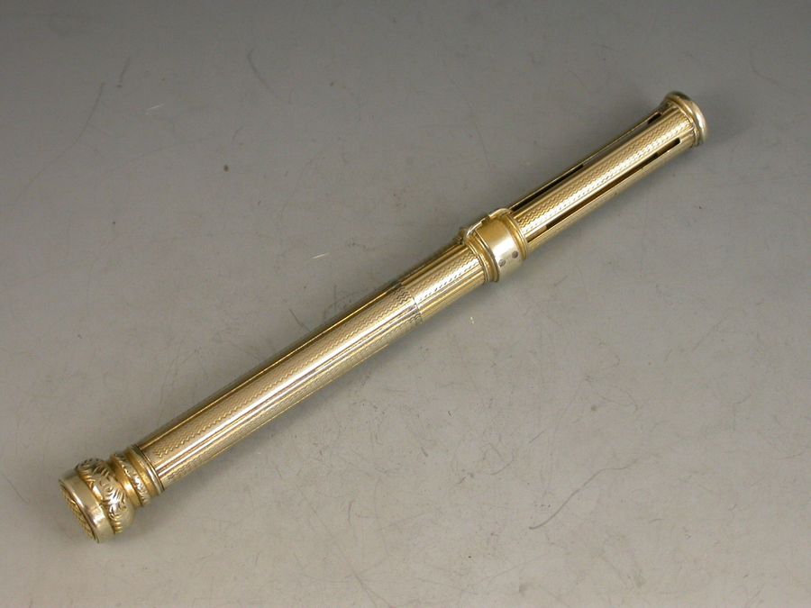 A rare Victorian German silver or possibly silver gilt ""Improved Unique Patent Pocket Companion"" with engine turned decoration to the body. The pocket companion comprises at one end, a slide out pen holder, a pencil and toothpick combined with a half sovereign gauge. At the opposite end the hobnail cut seal terminal unscrews to reveal a lead reservoir. The case also unscrews at the centre to reveal the letter and coin balance which is graduated 1D to 4D and 1/2 ounce to 2 ounce.