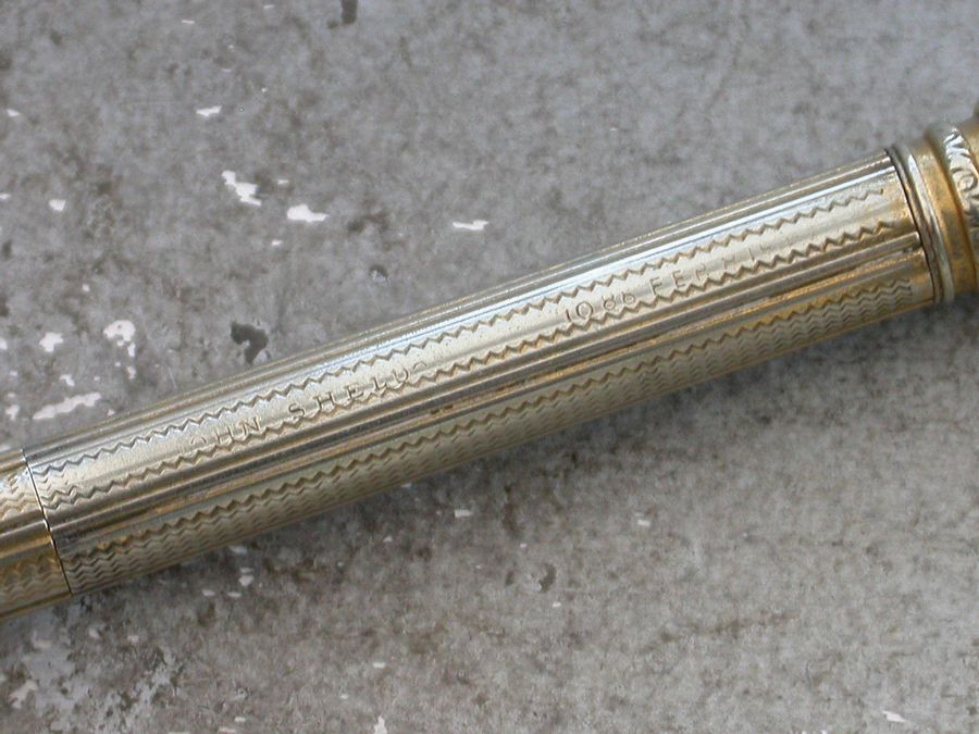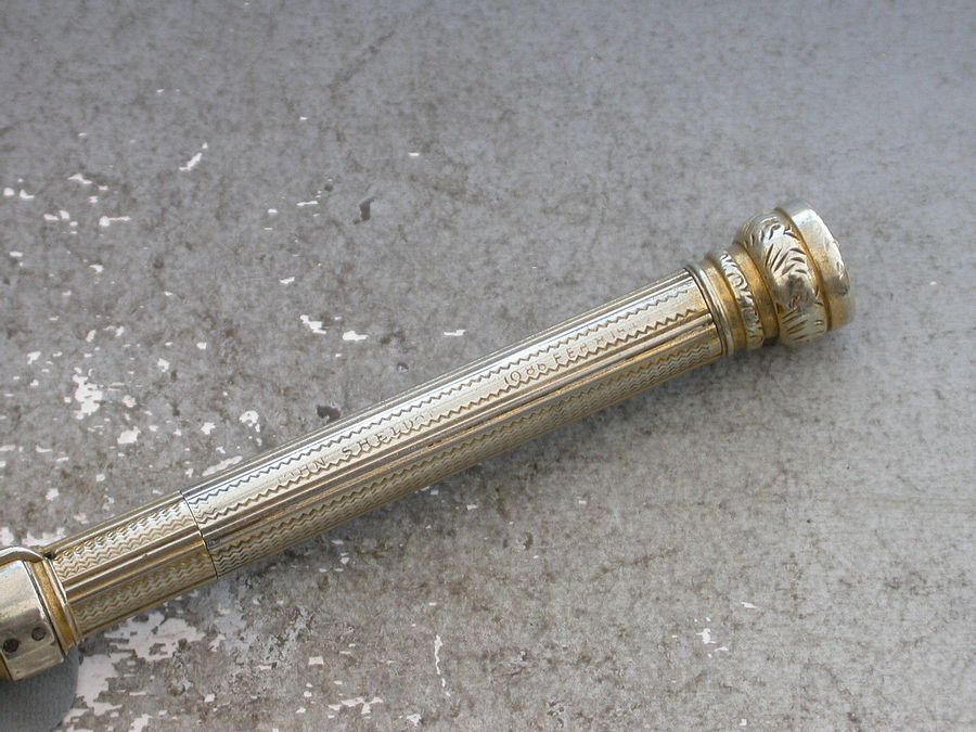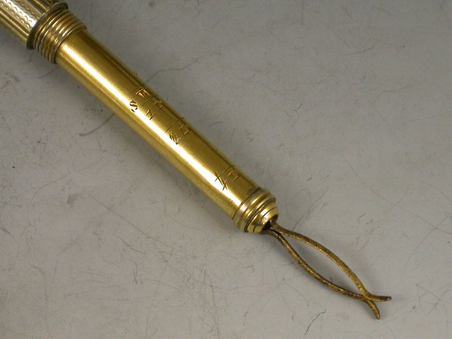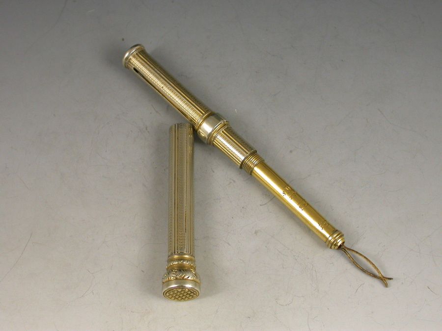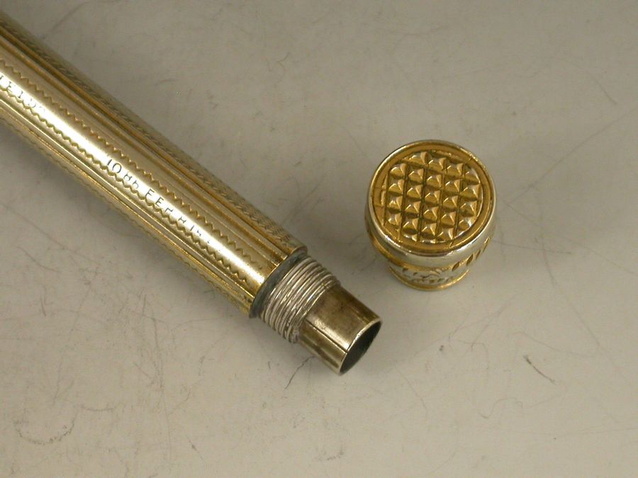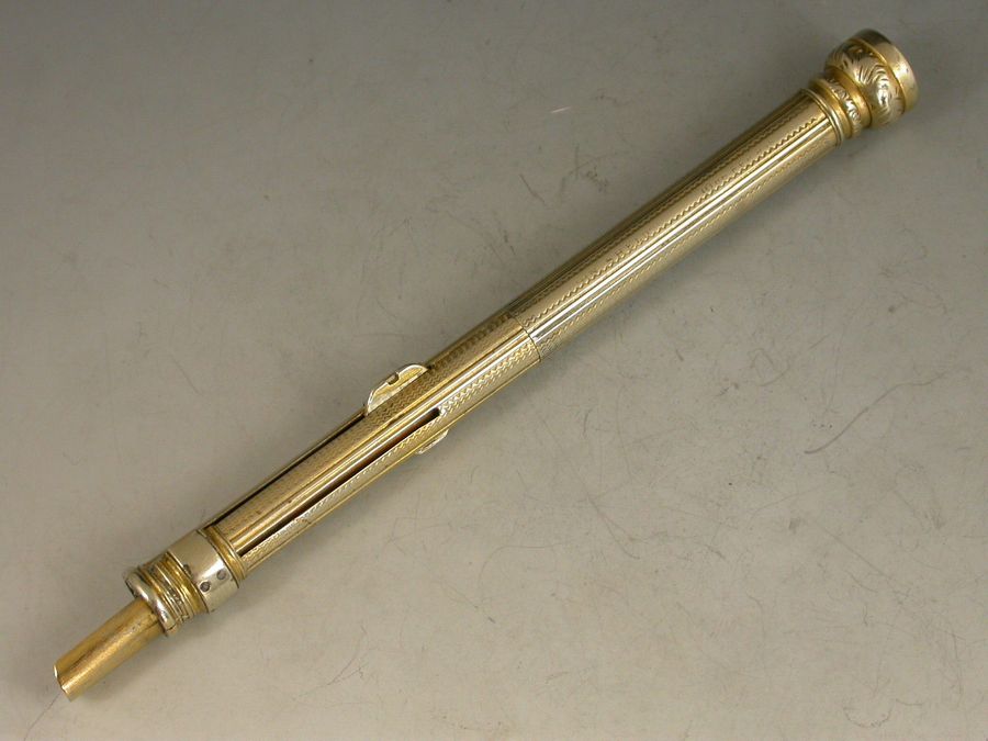 A rare Victorian German silver or possibly silver gilt ""Improved Unique Patent Pocket Companion"" with engine turned decoration to the body. The pocket companion comprises at one end, a slide out pen holder, a pencil and toothpick combined with a half sovereign gauge. At the opposite end the hobnail cut seal terminal unscrews to reveal a lead reservoir. The case also unscrews at the centre to reveal the letter and coin balance which is graduated 1D to 4D and 1/2 ounce to 2 ounce.