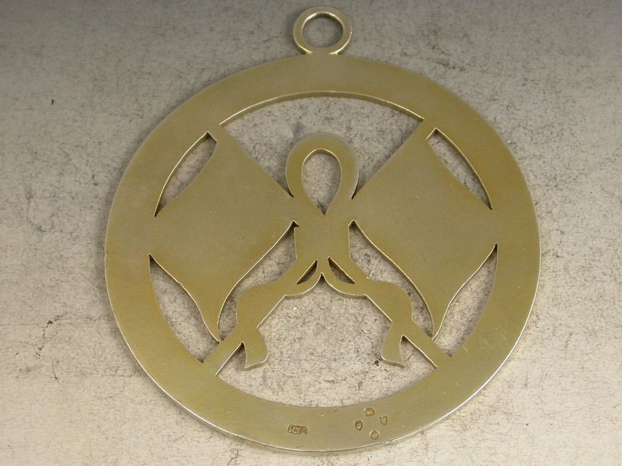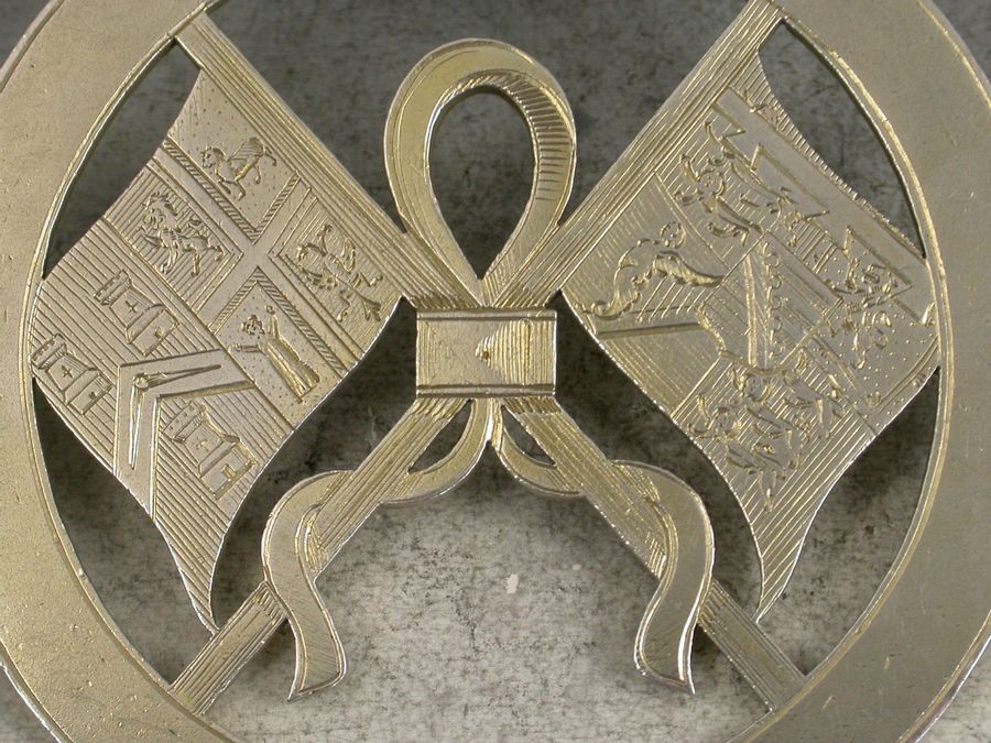 A Victorian silver gilt Masonic Badge / Medal of pierced circular form depicting two flags joined together with a ribbon, one flag is that of United Grand Lodge of England, the other is the Royal flag of Queen Victoria.