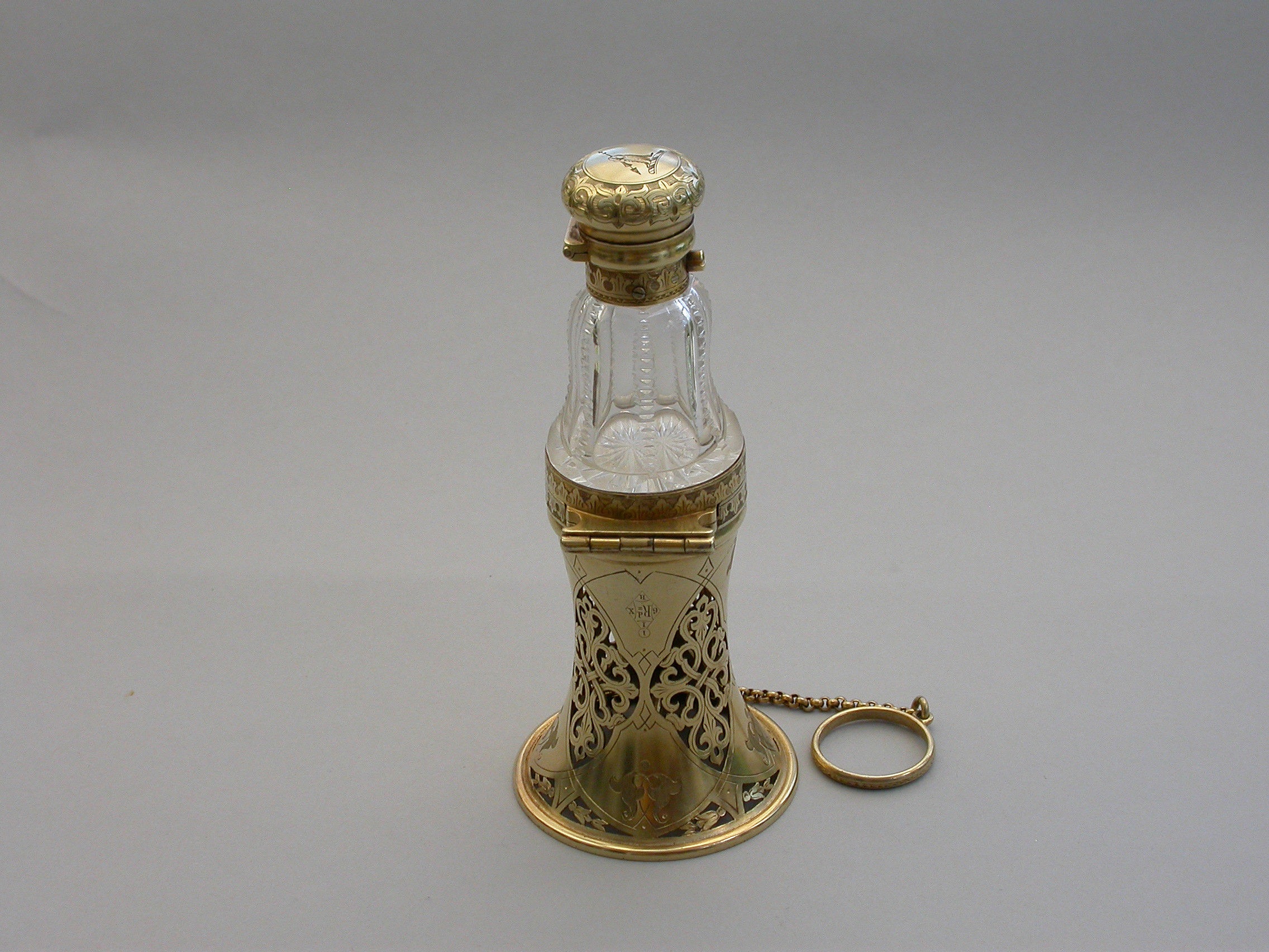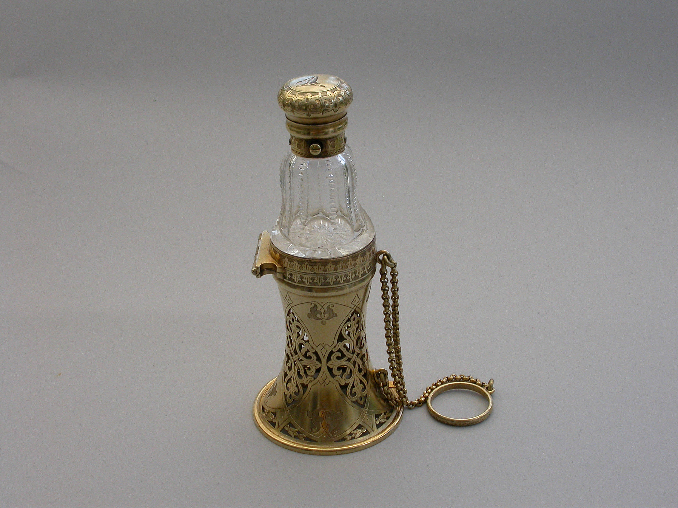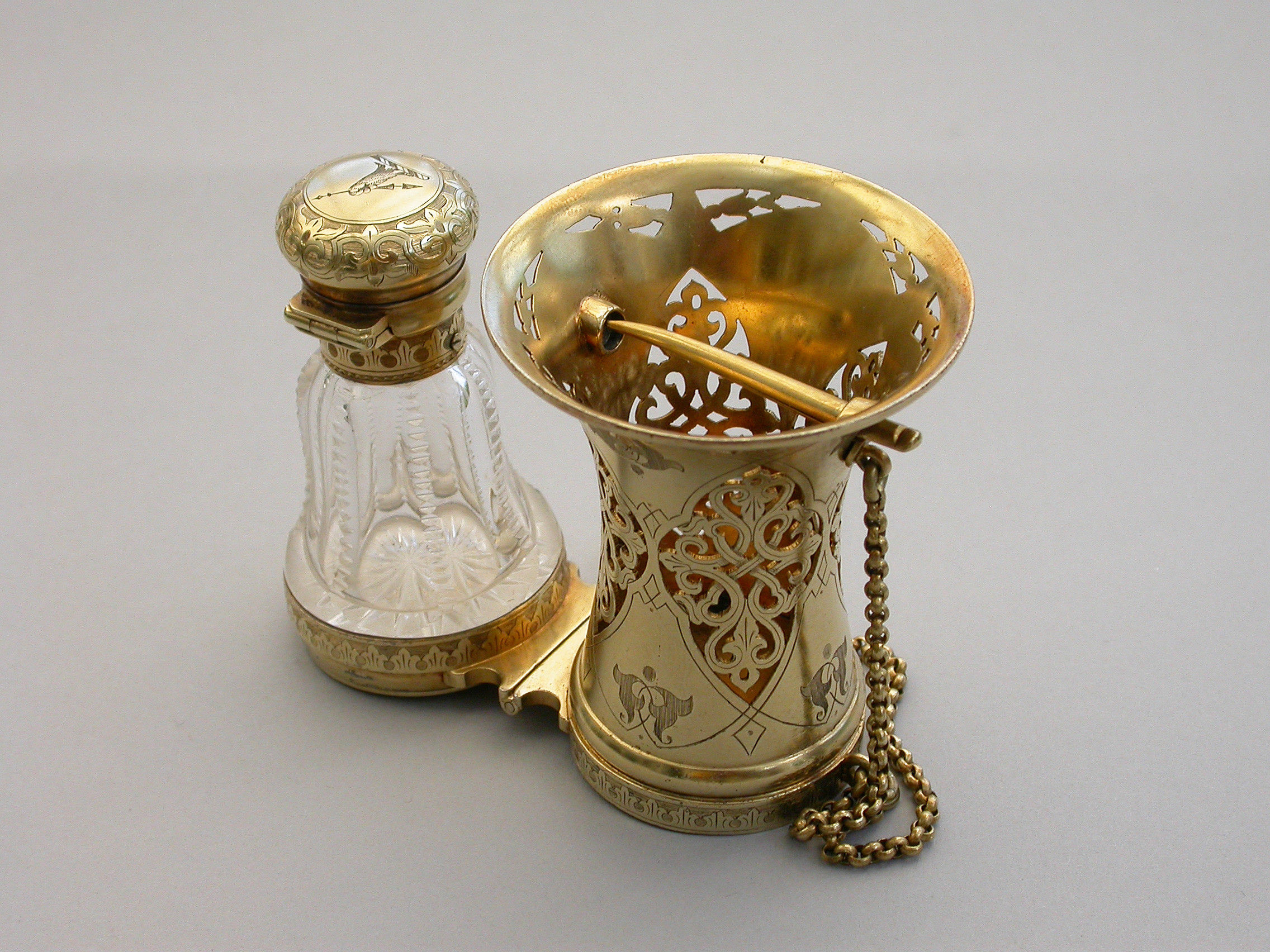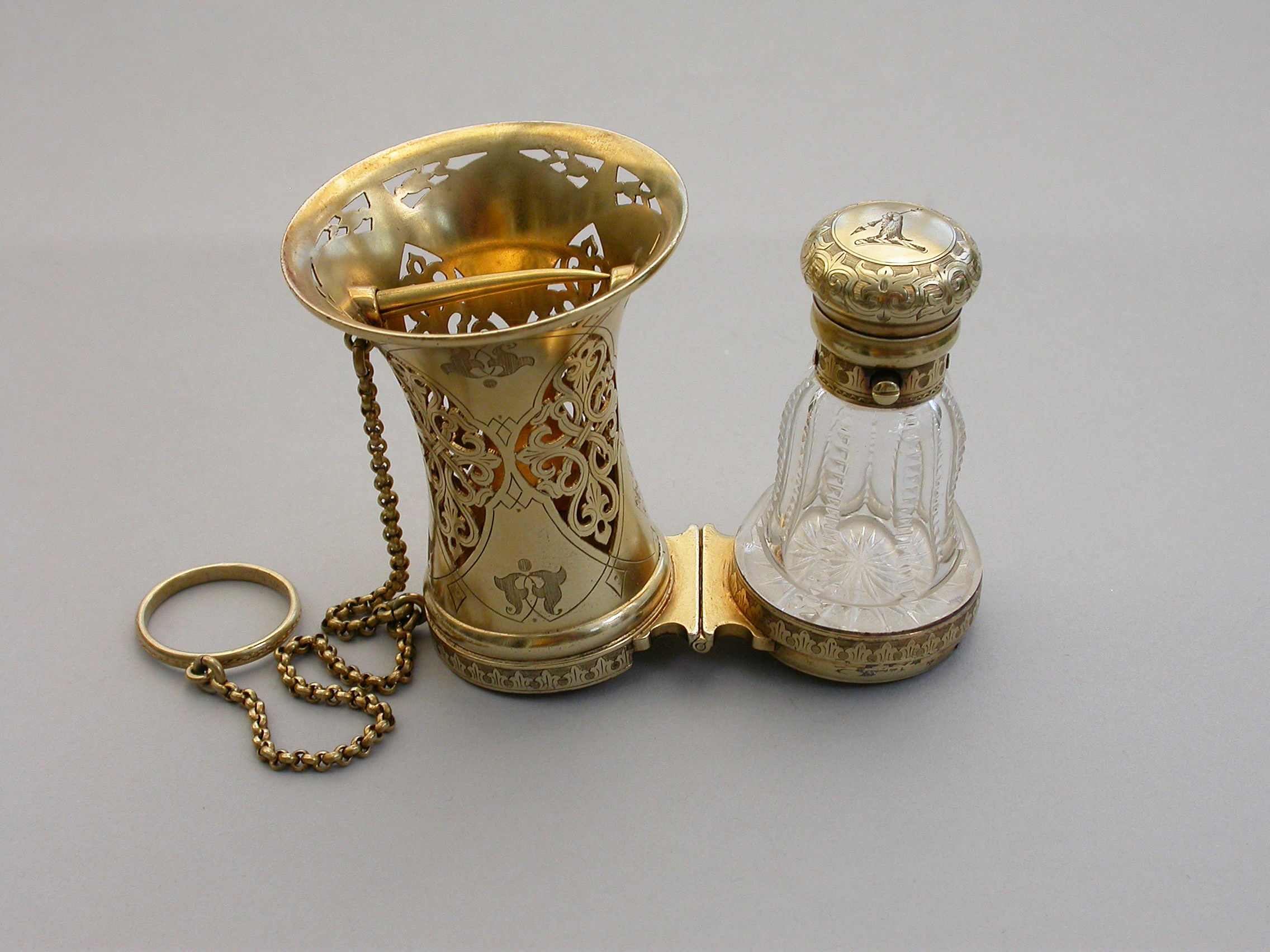 A very fine quality Victorian silver gilt mounted combined Posy Holder, Vinaigrette and Scent Bottle, the trumpet-shaped flower receptacle with pierced and engraved geometric patterns. The shaped cut glass Scent Bottle with push-button sprung hinged lid engraved with an Armorial crest. The whole hinging at the centre and revealing a further compartment and a hidden hinged Vinaigrette engraved with similar geometric patterns. Attached chain and finger ring. Complete with original velvet lined fitted red leather retailer's case.