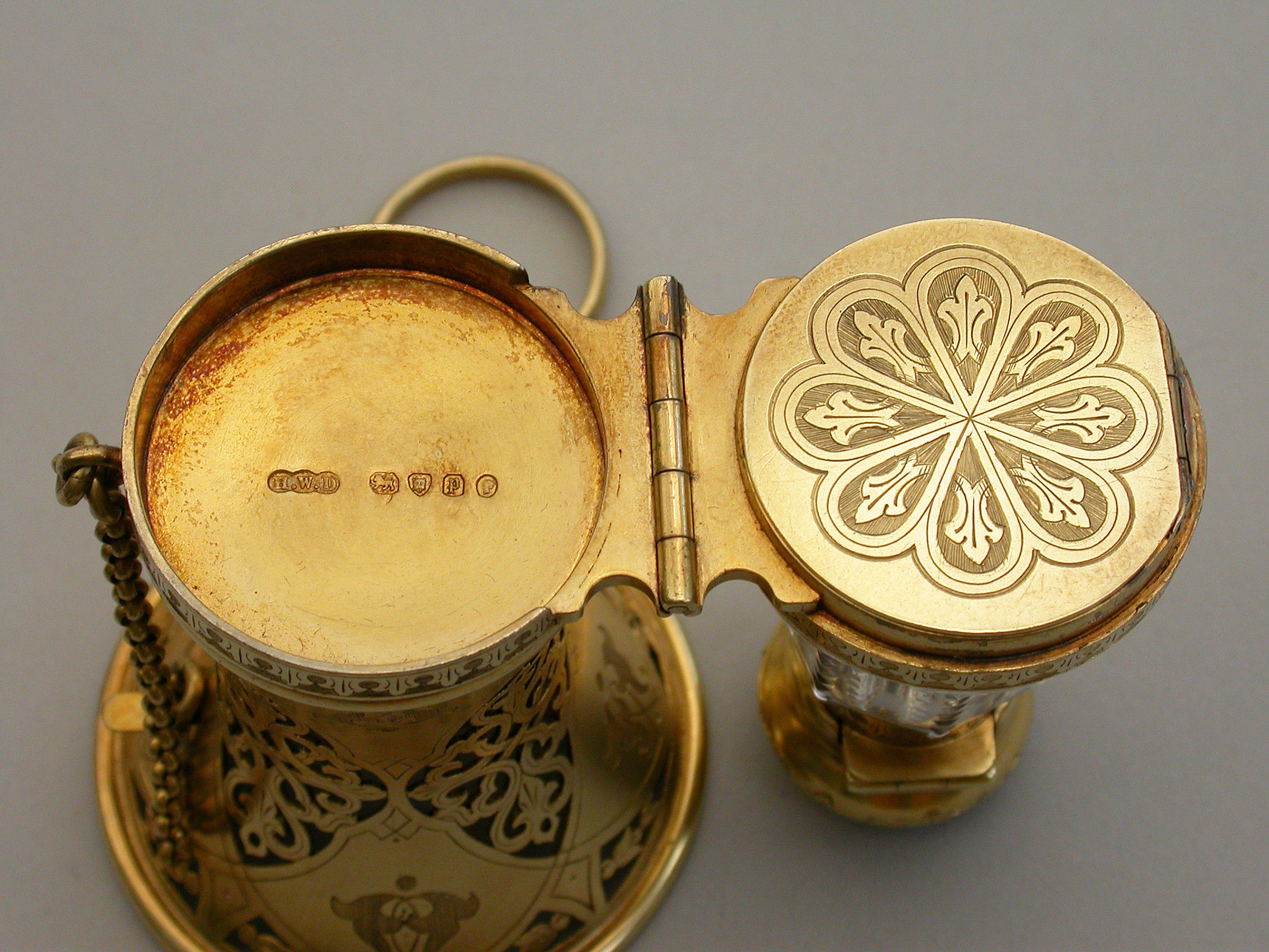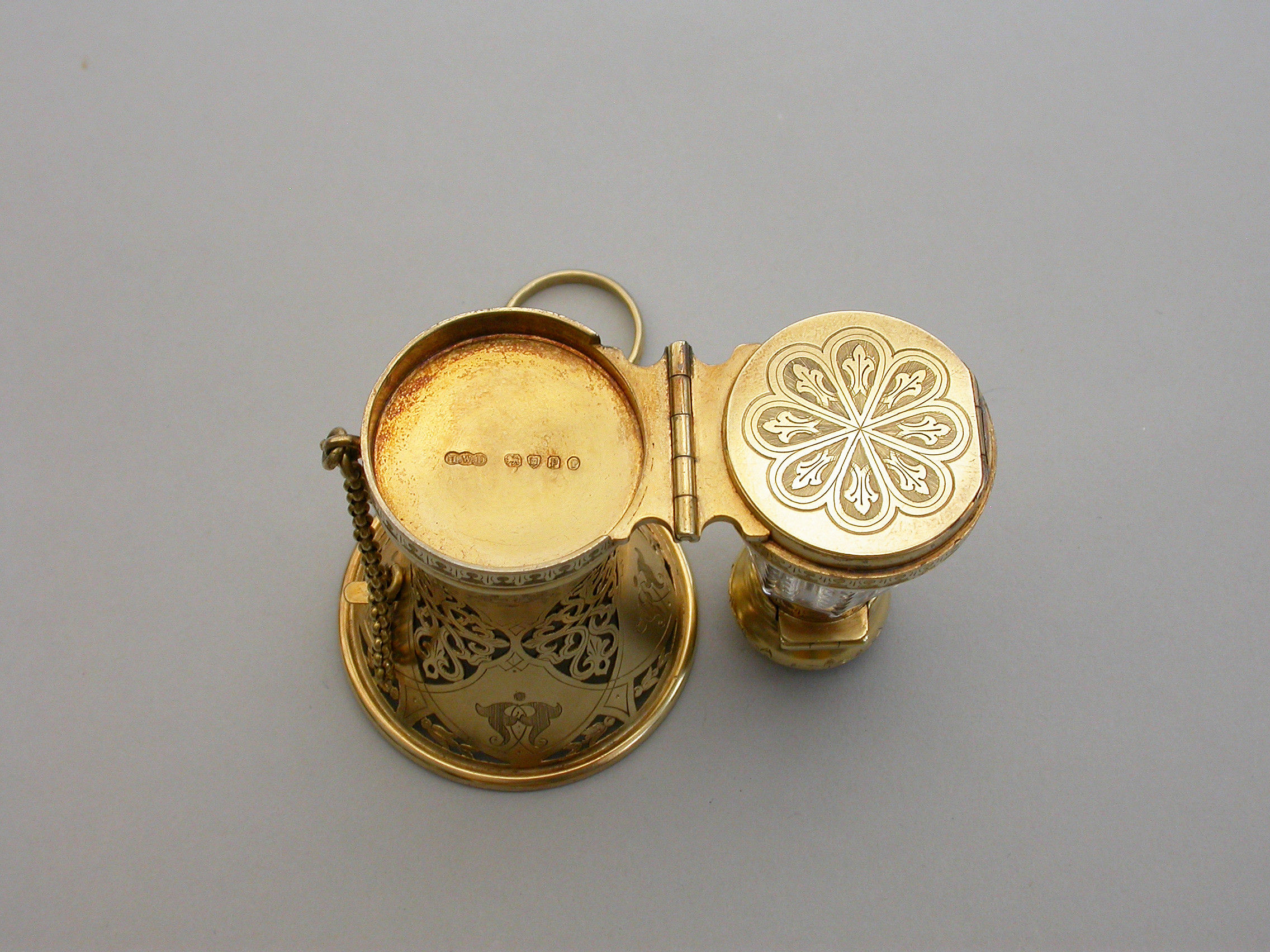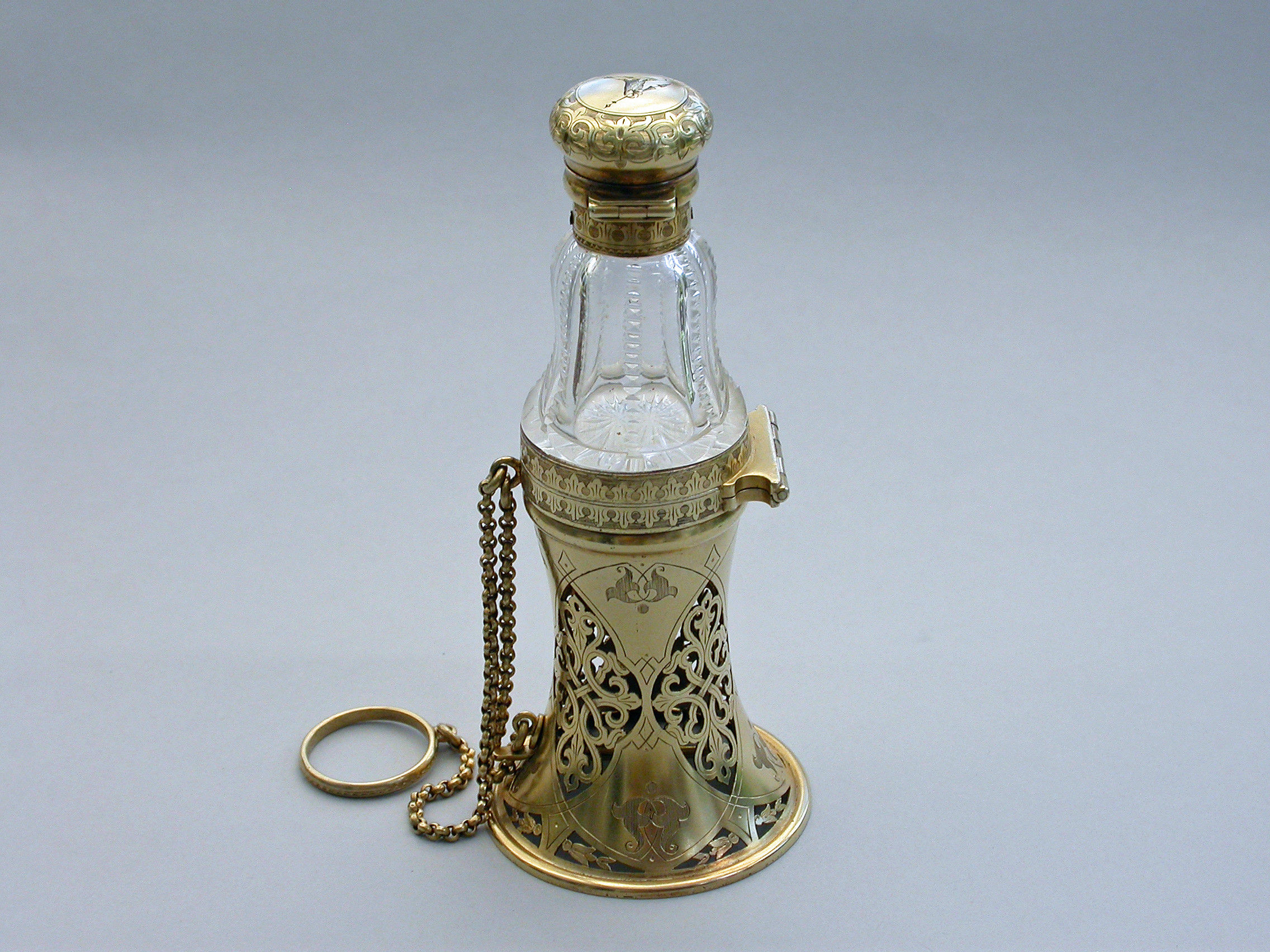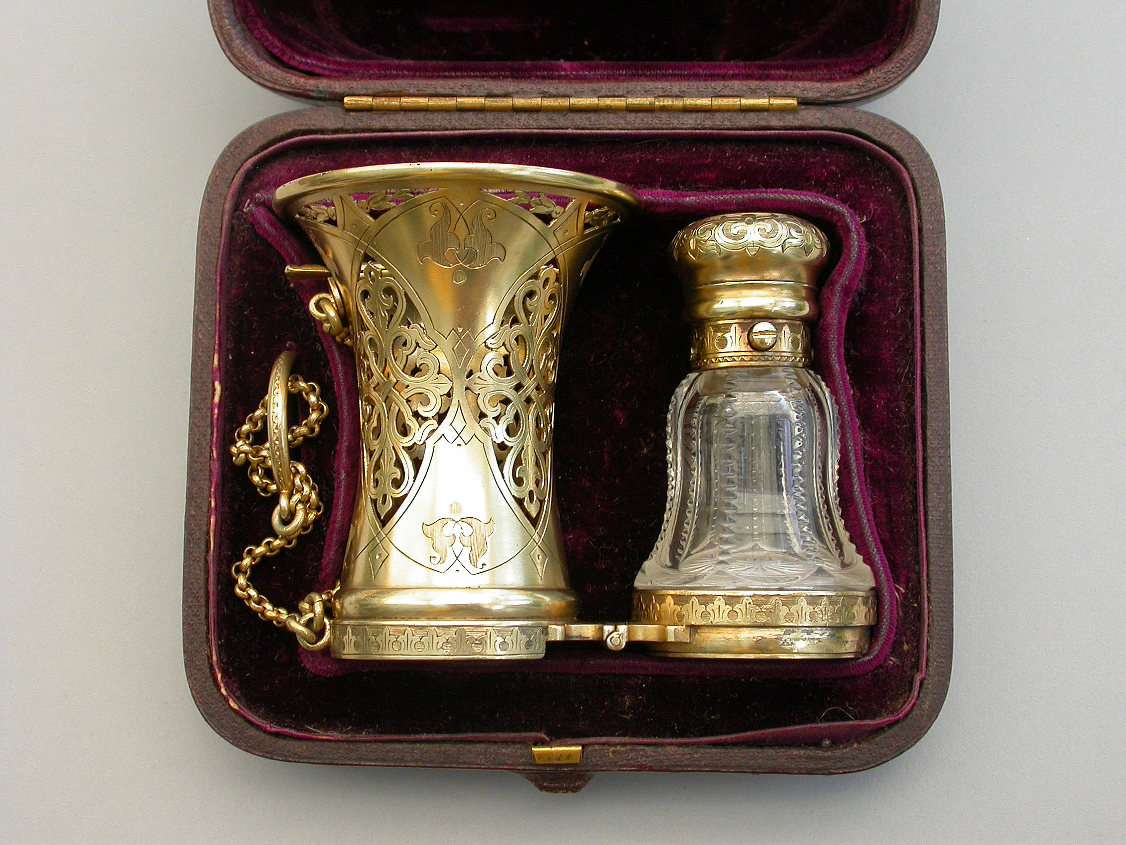 A very fine quality Victorian silver gilt mounted combined Posy Holder, Vinaigrette and Scent Bottle, the trumpet-shaped flower receptacle with pierced and engraved geometric patterns. The shaped cut glass Scent Bottle with push-button sprung hinged lid engraved with an Armorial crest. The whole hinging at the centre and revealing a further compartment and a hidden hinged Vinaigrette engraved with similar geometric patterns. Attached chain and finger ring. Complete with original velvet lined fitted red leather retailer's case.