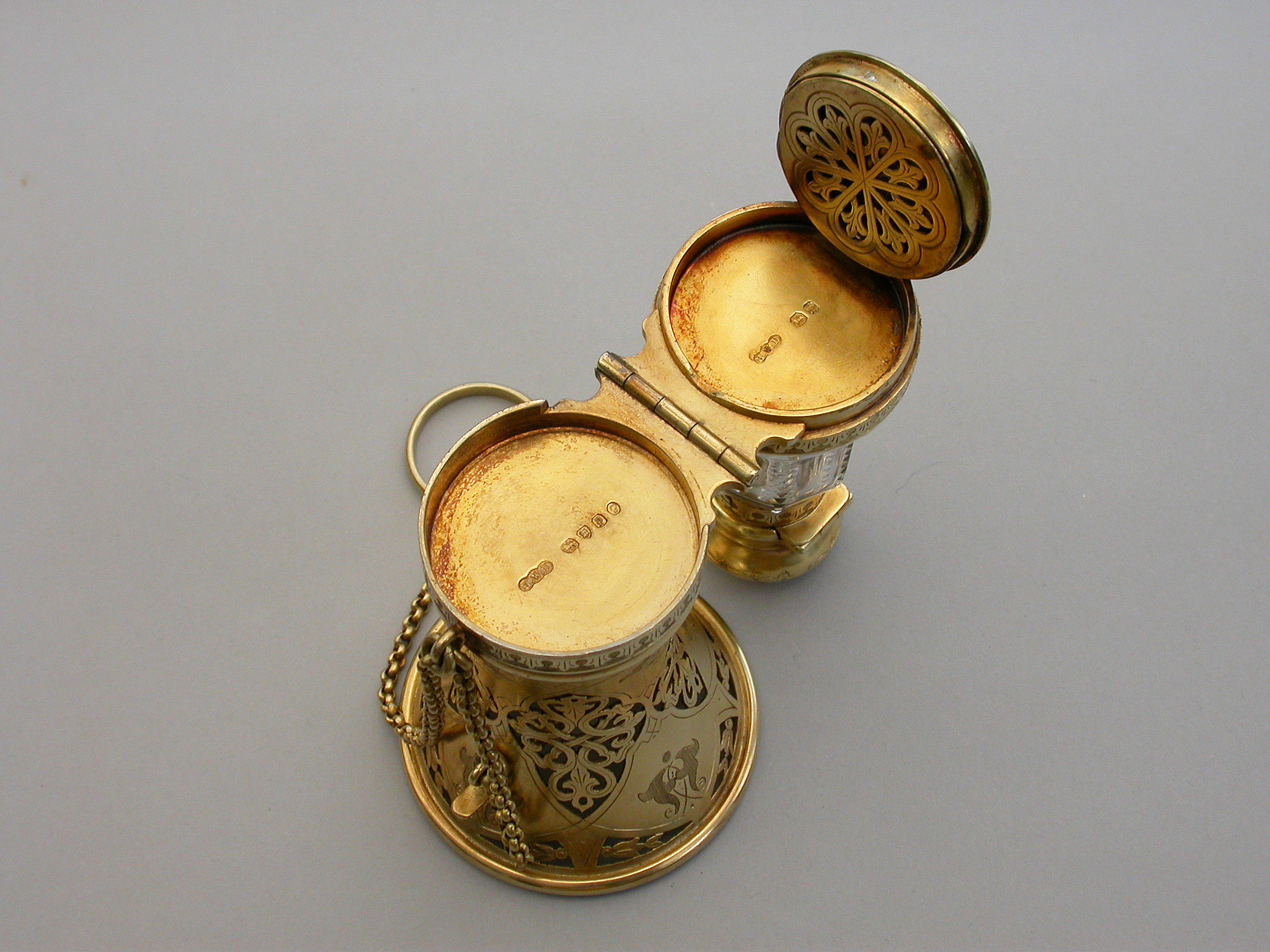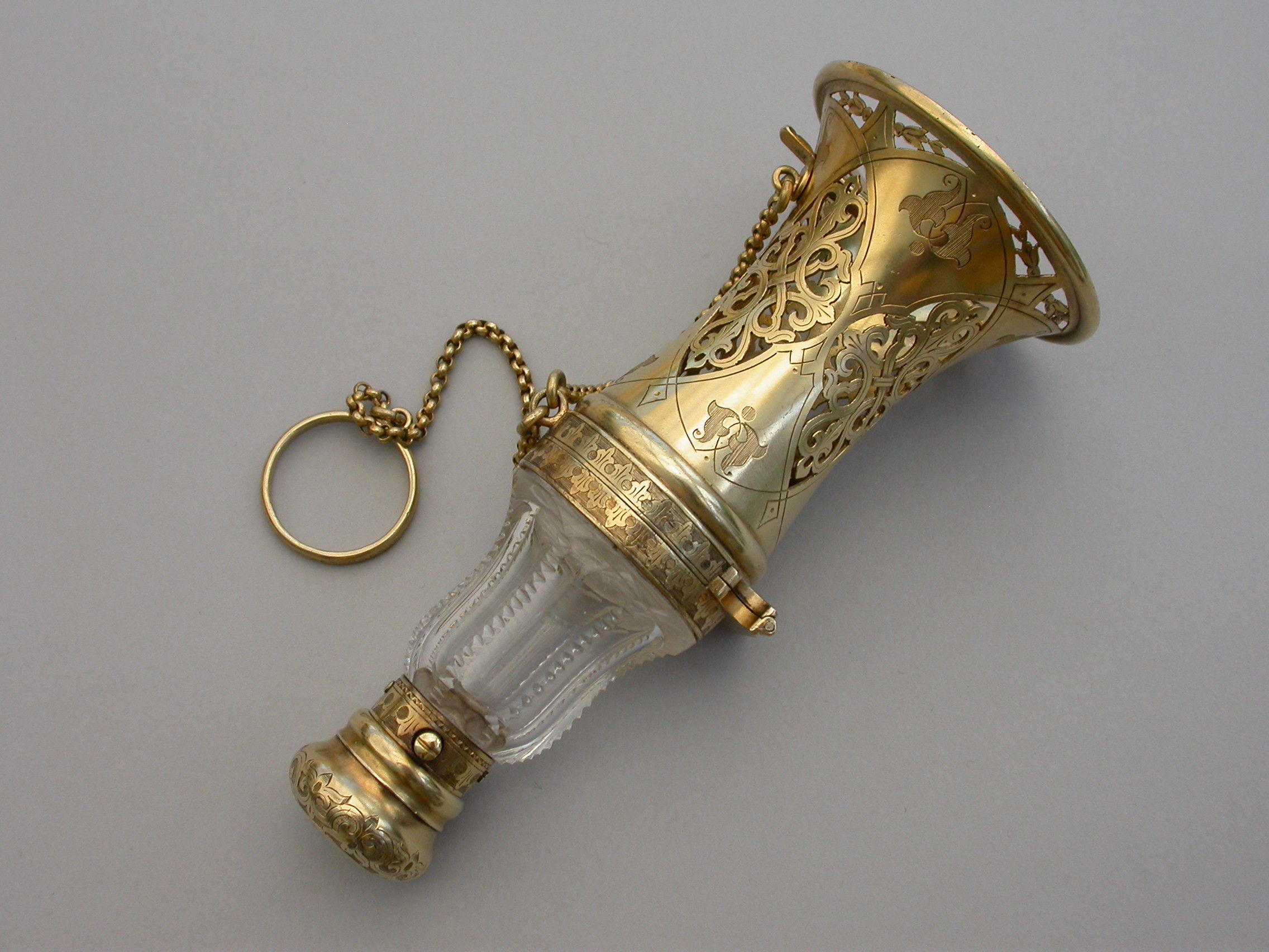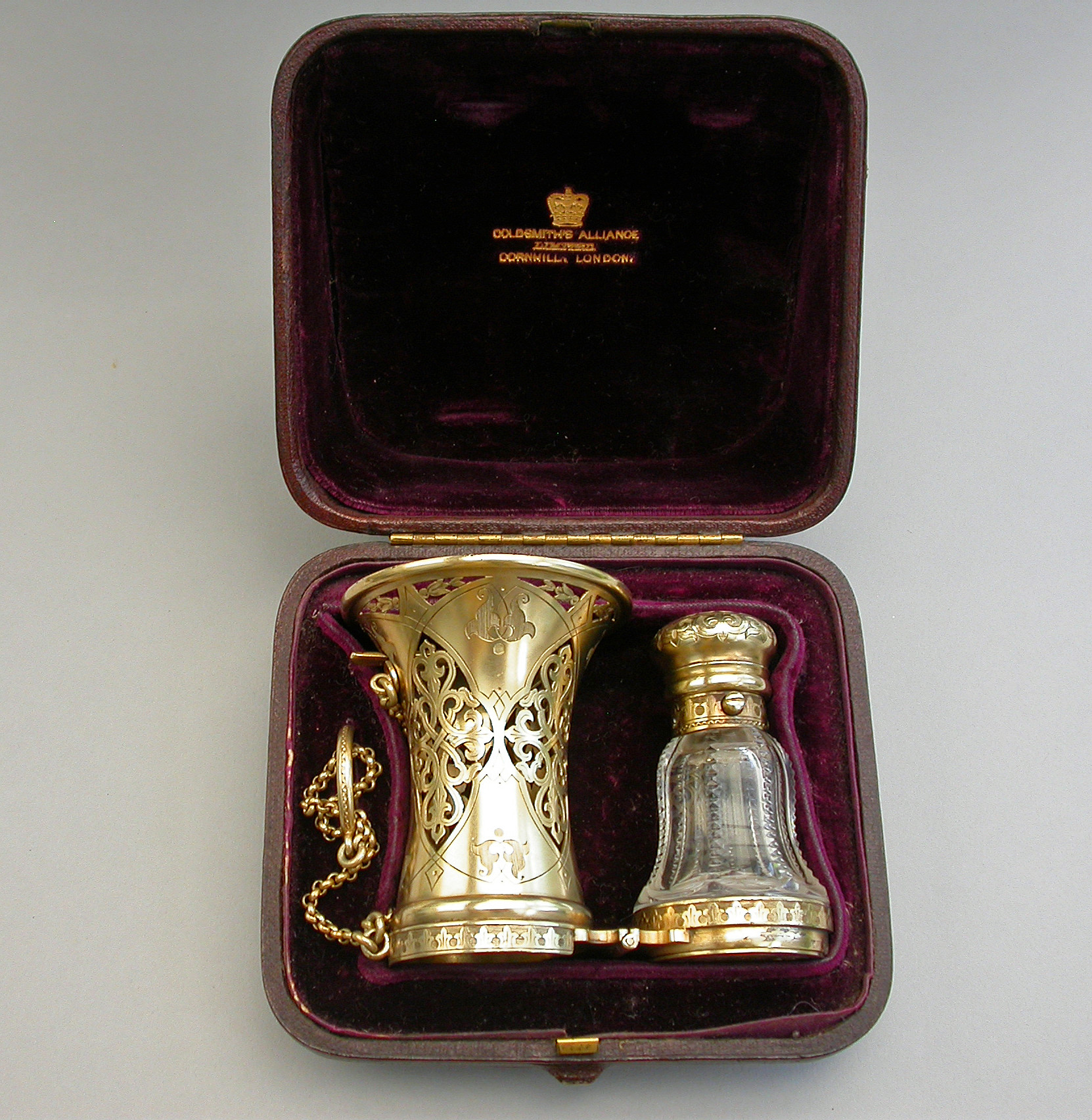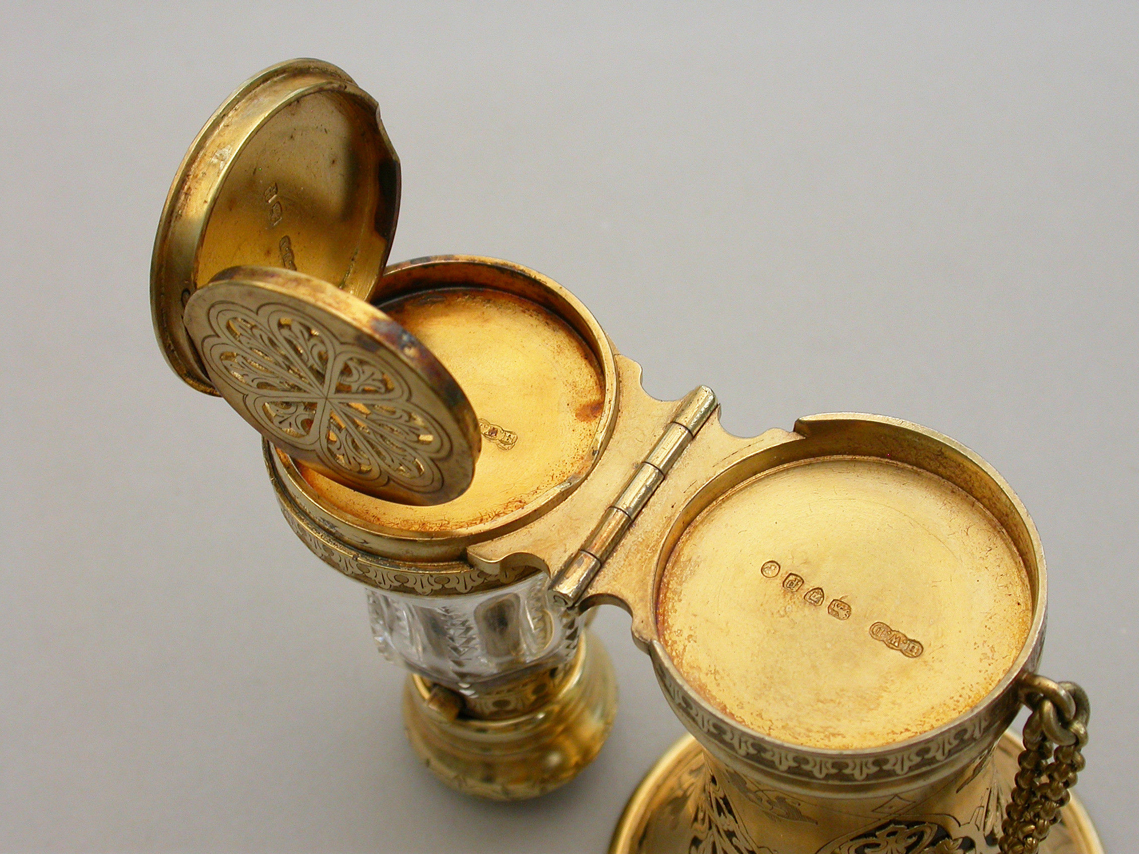 A very fine quality Victorian silver gilt mounted combined Posy Holder, Vinaigrette and Scent Bottle, the trumpet-shaped flower receptacle with pierced and engraved geometric patterns. The shaped cut glass Scent Bottle with push-button sprung hinged lid engraved with an Armorial crest. The whole hinging at the centre and revealing a further compartment and a hidden hinged Vinaigrette engraved with similar geometric patterns. Attached chain and finger ring. Complete with original velvet lined fitted red leather retailer's case.