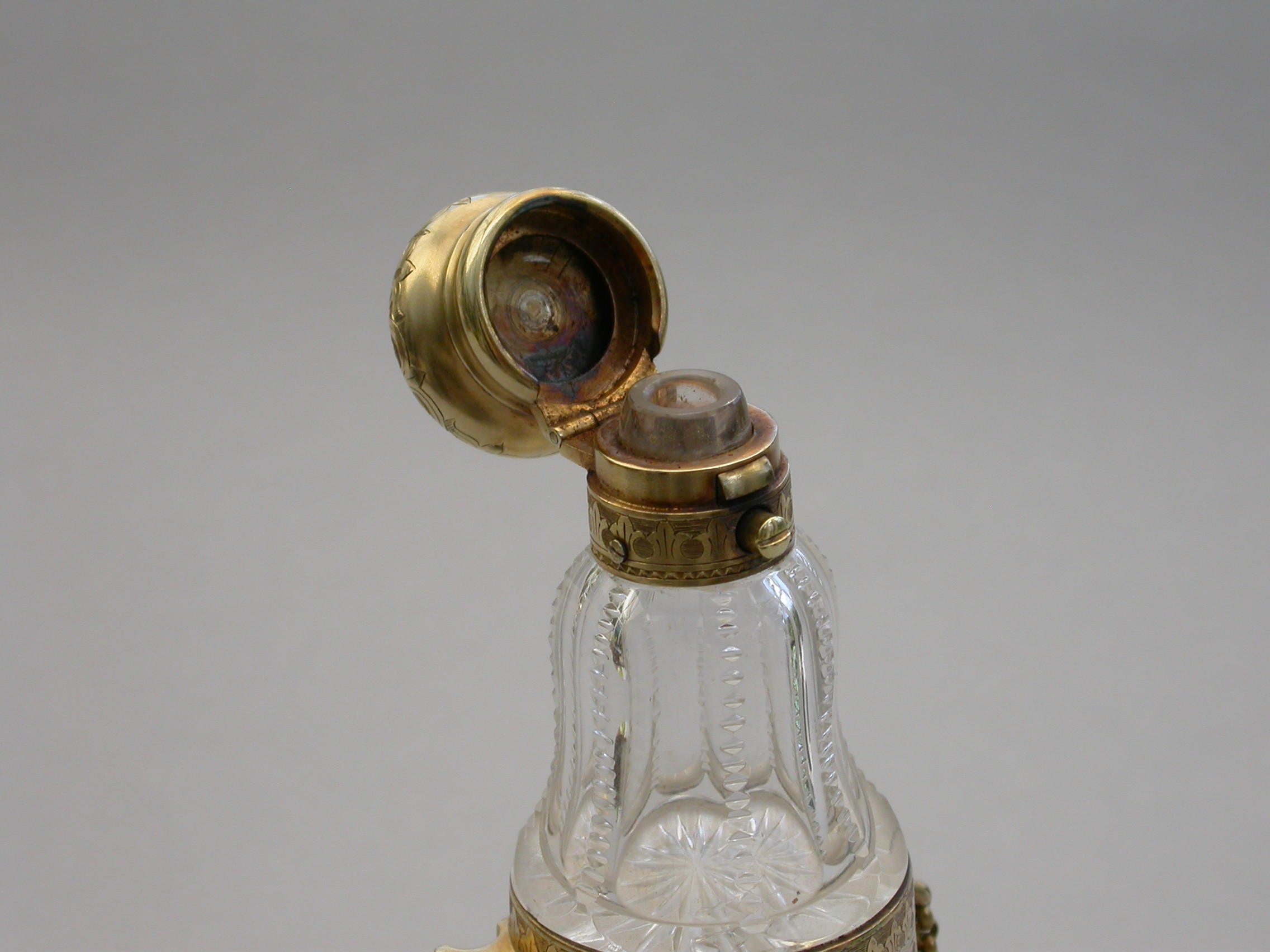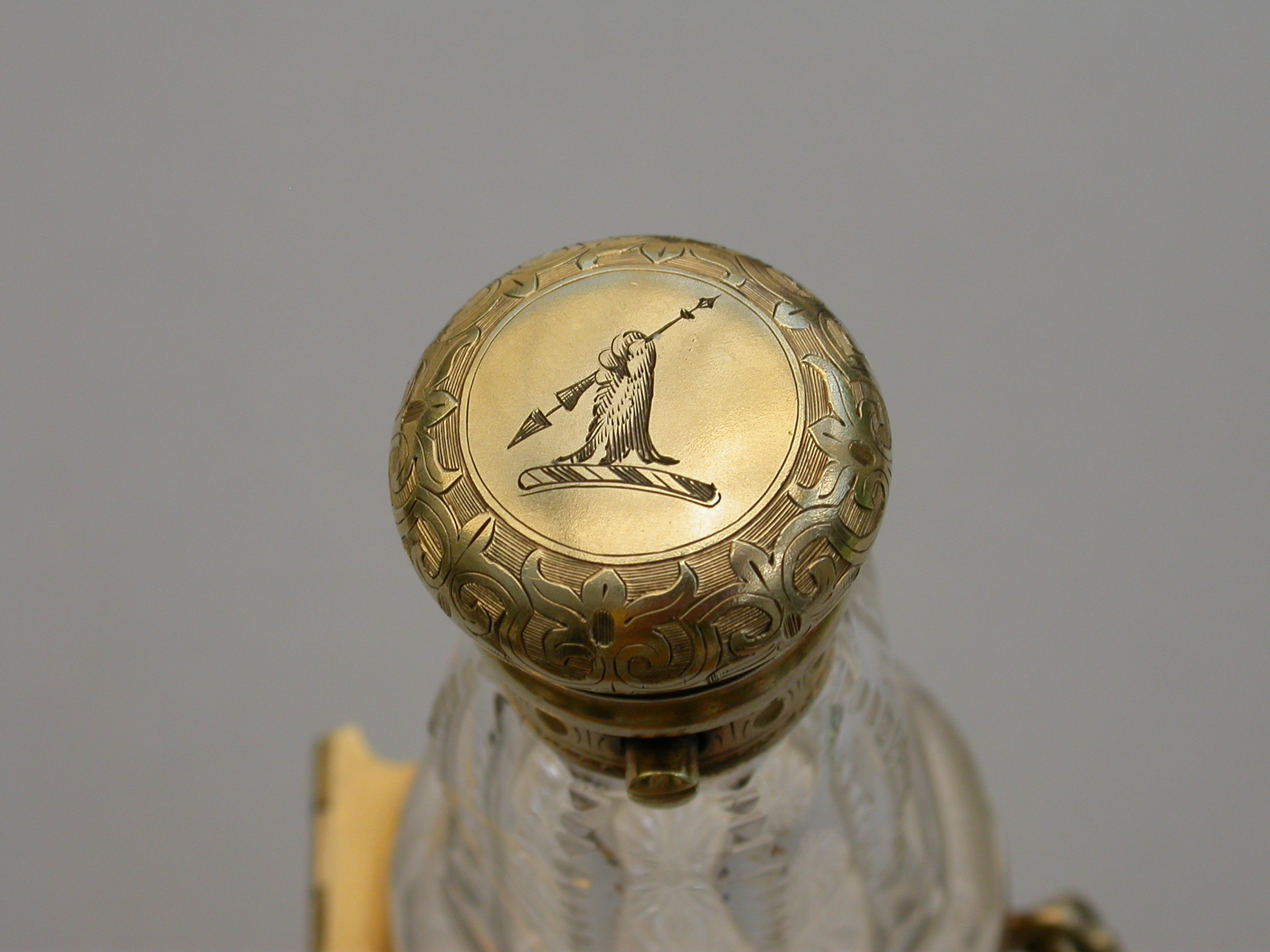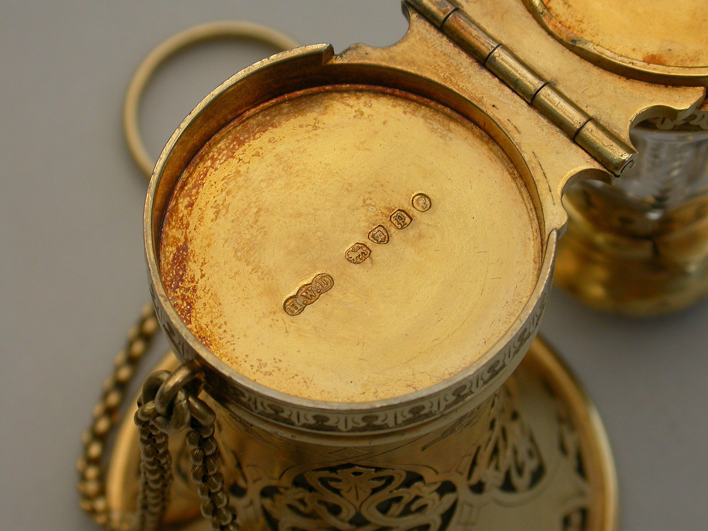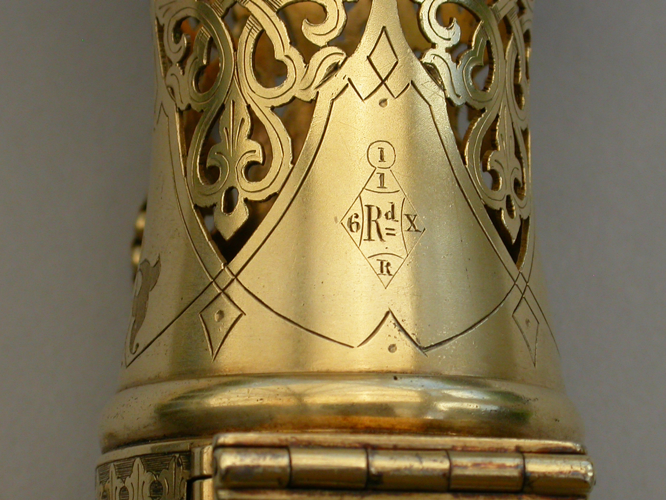 A very fine quality Victorian silver gilt mounted combined Posy Holder, Vinaigrette and Scent Bottle, the trumpet-shaped flower receptacle with pierced and engraved geometric patterns. The shaped cut glass Scent Bottle with push-button sprung hinged lid engraved with an Armorial crest. The whole hinging at the centre and revealing a further compartment and a hidden hinged Vinaigrette engraved with similar geometric patterns. Attached chain and finger ring. Complete with original velvet lined fitted red leather retailer's case.