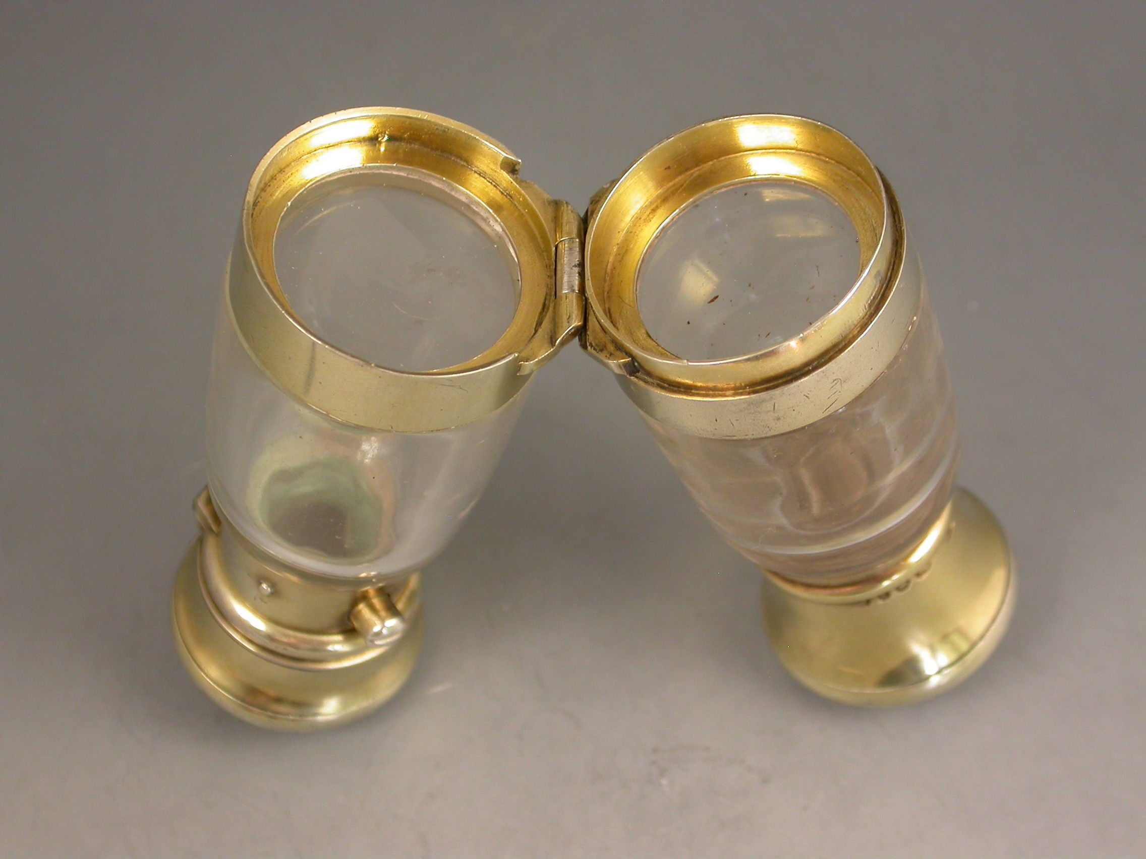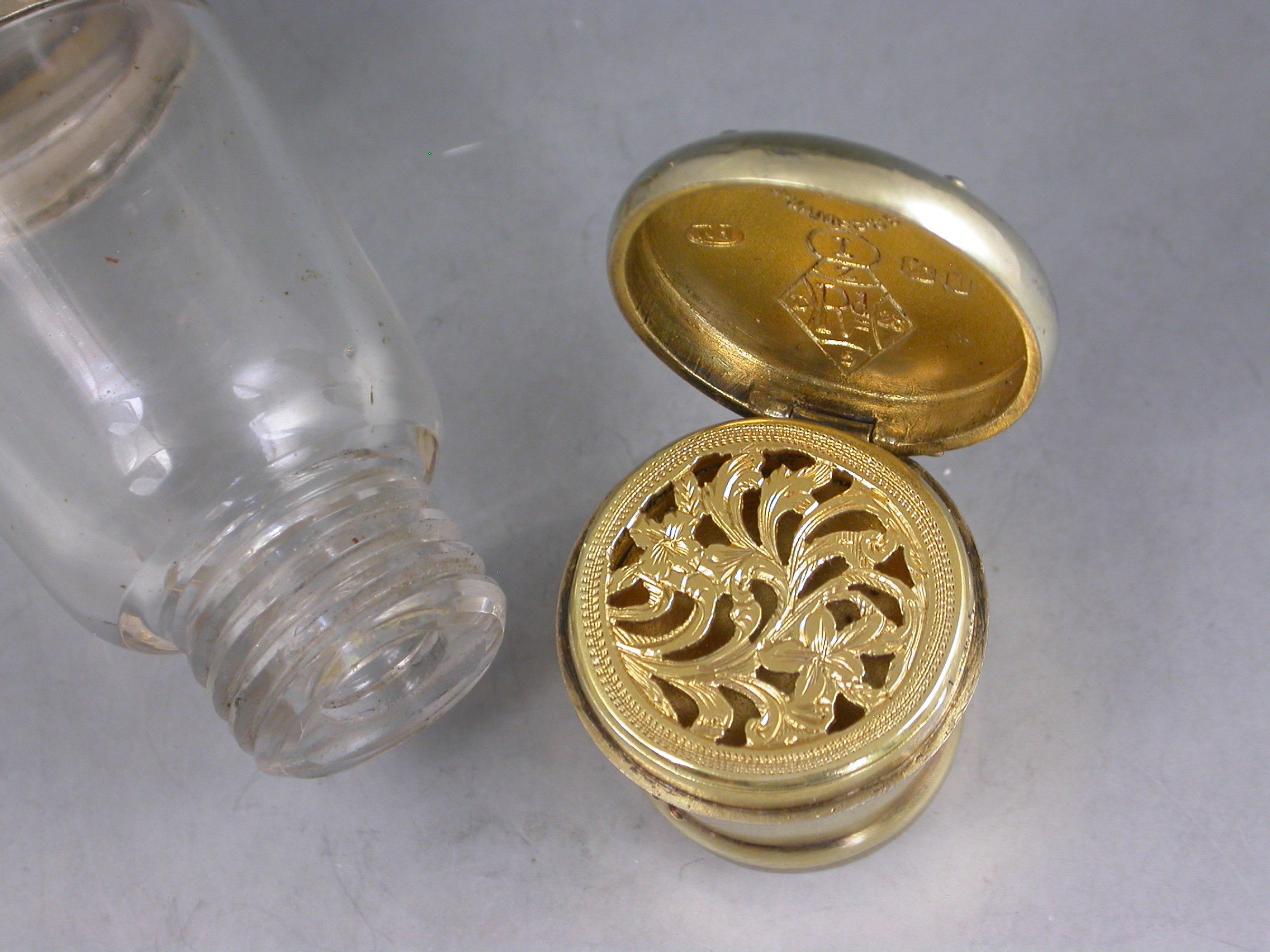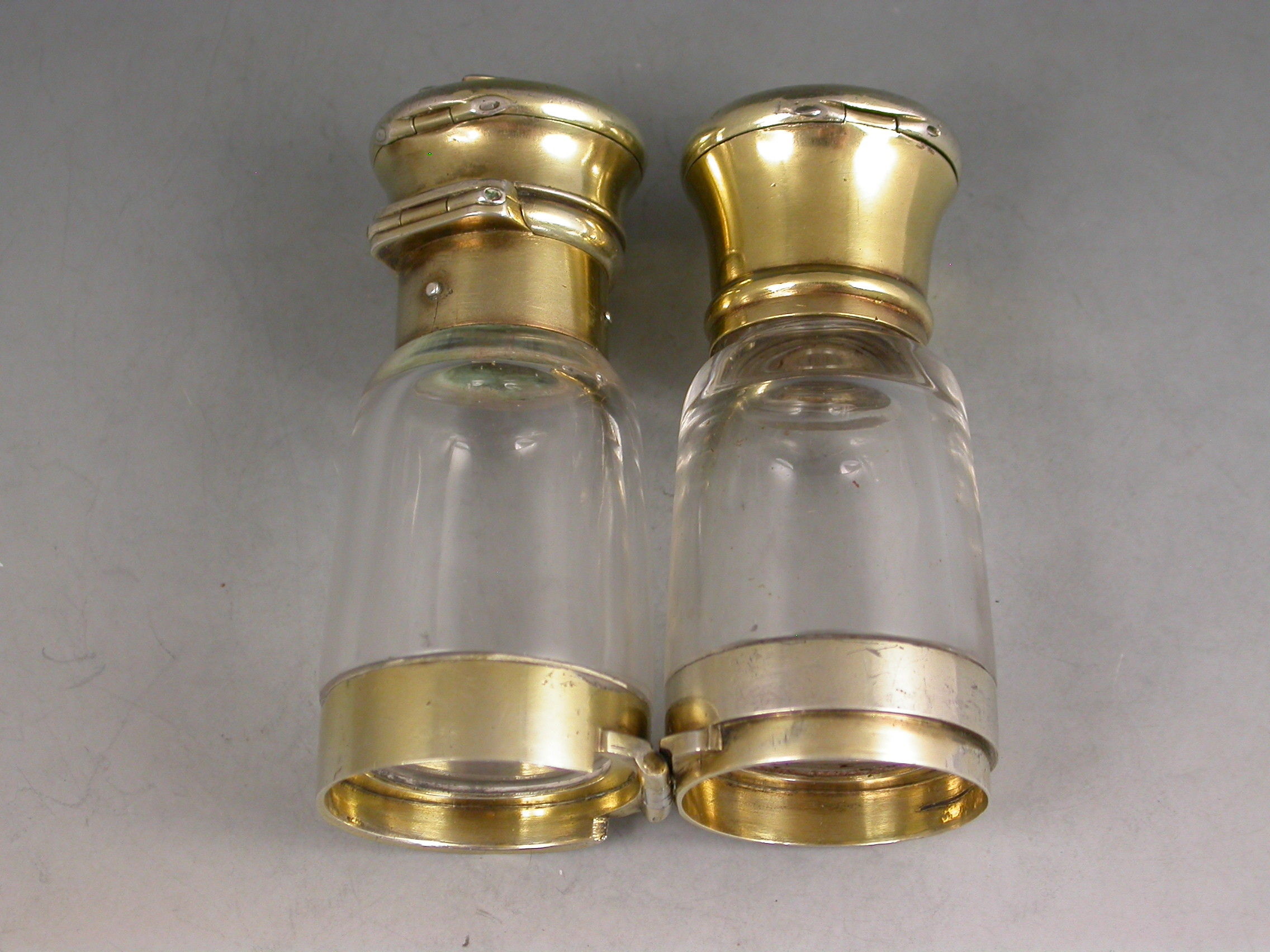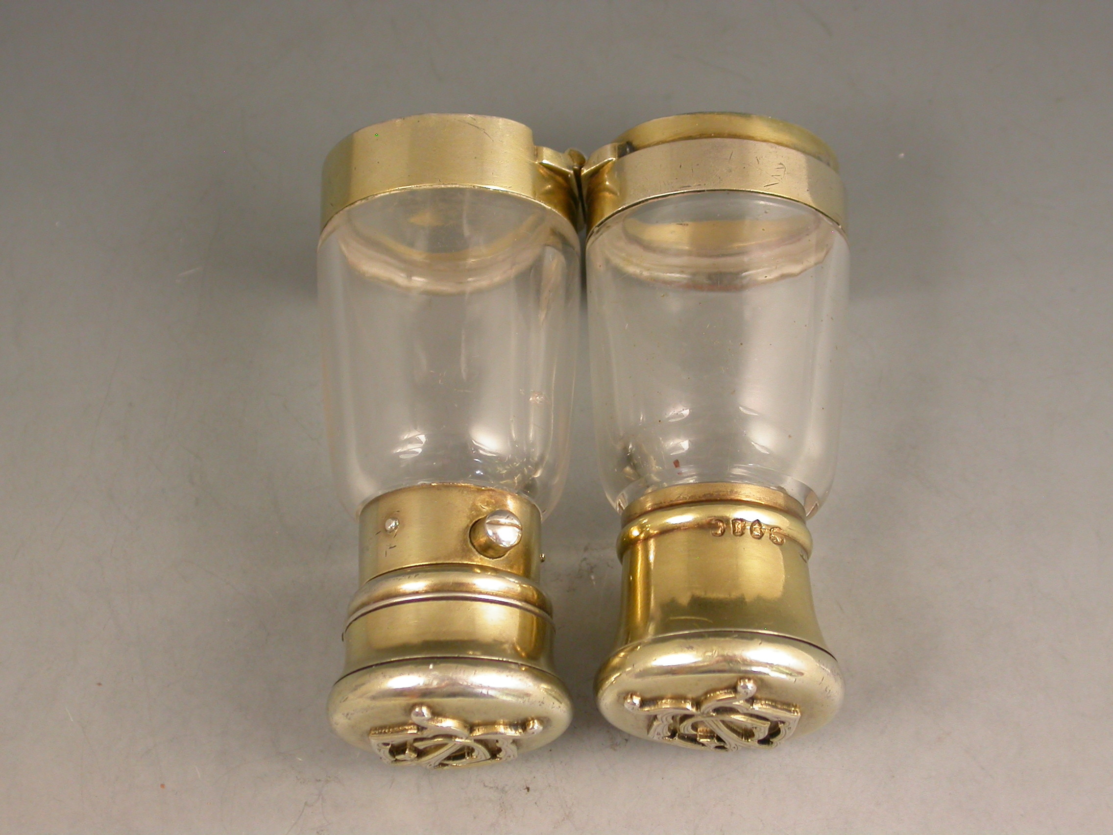 A fine quality and unusual Victorian silver gilt mounted 4 purpose double-ended glass Scent Bottle / Vinaigrette of binocular form, hinging at the centre to reveal a picture frame compartment. One end with screw off cover to the smelling salts bottle, the top of the cover hinging open to reveal a vinaigrette, the other end with sprung push button release to the scent bottle, the lid also hinged and opening to reveal a pill box. Each end with applied cypher.