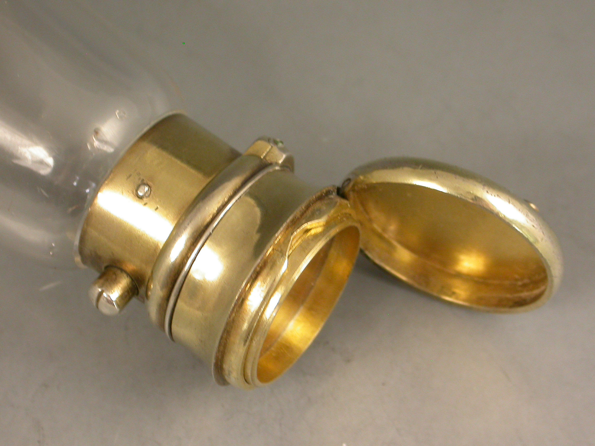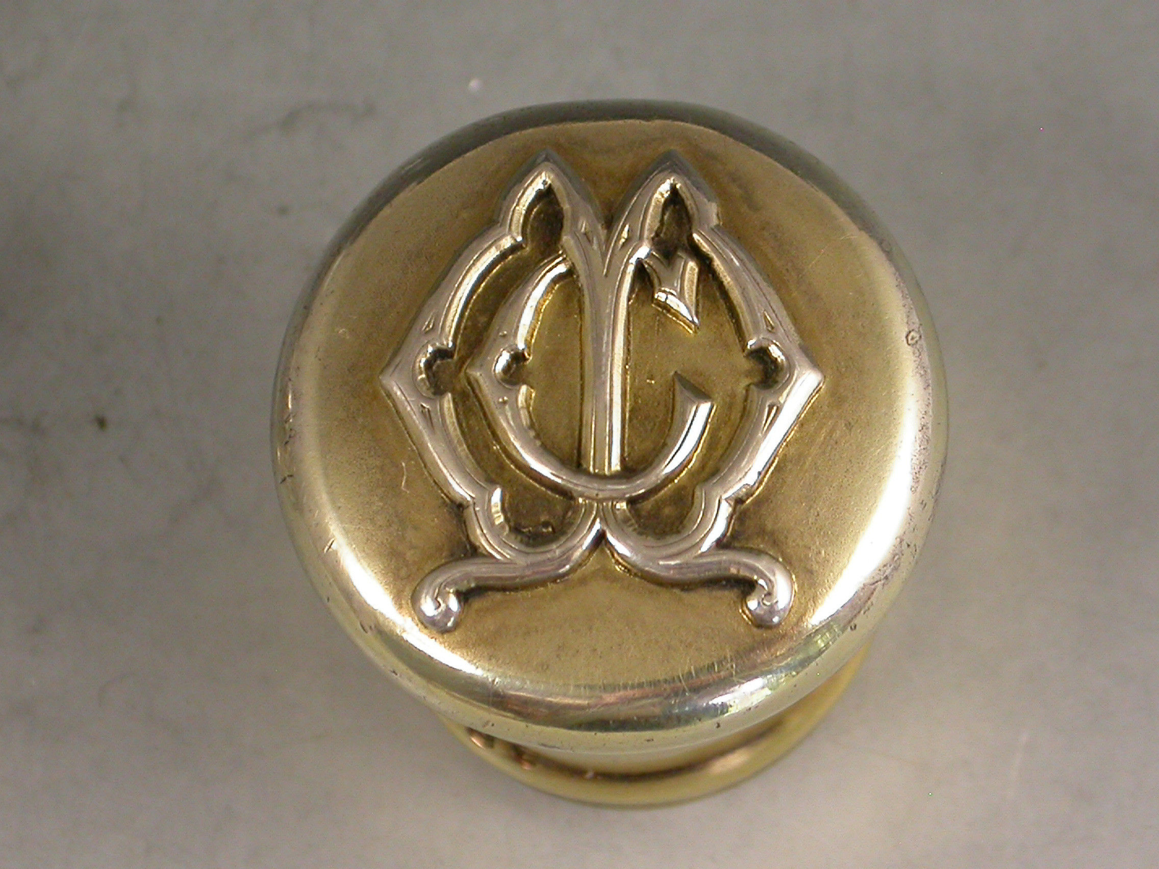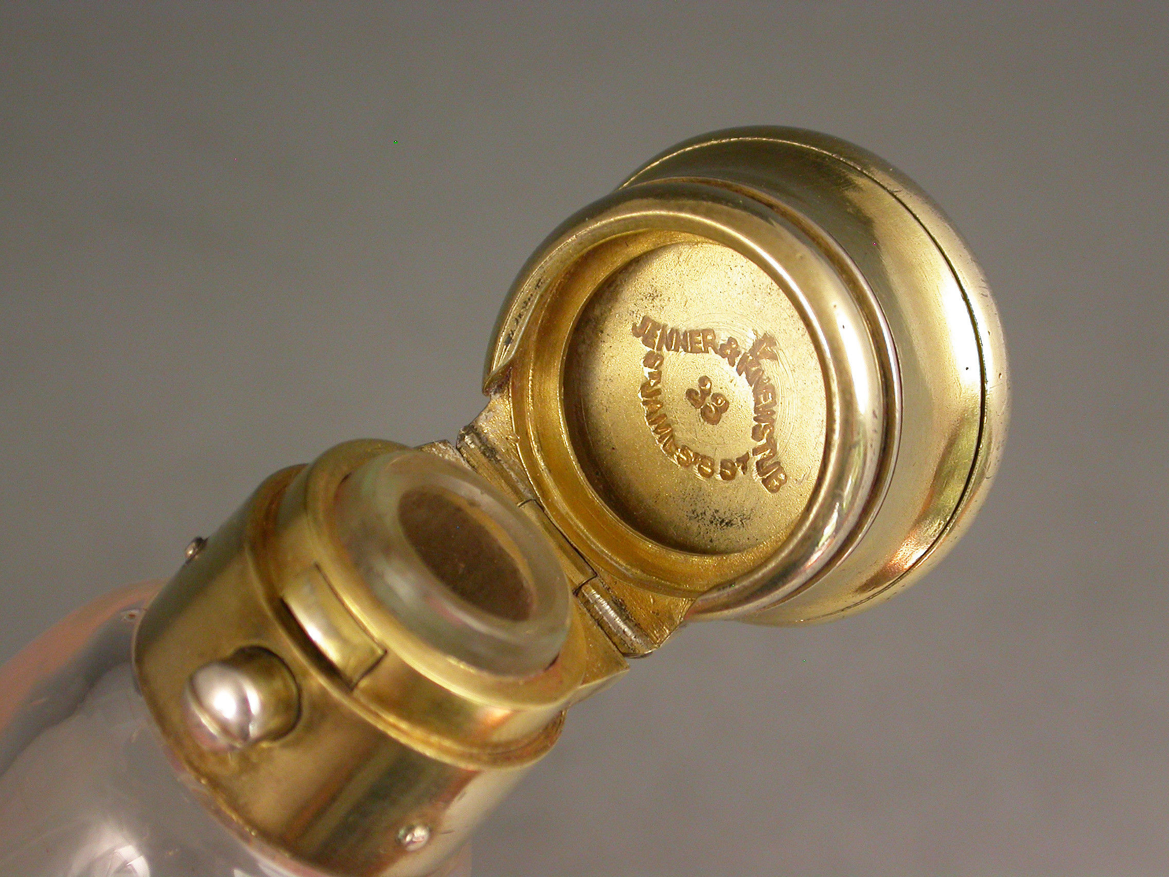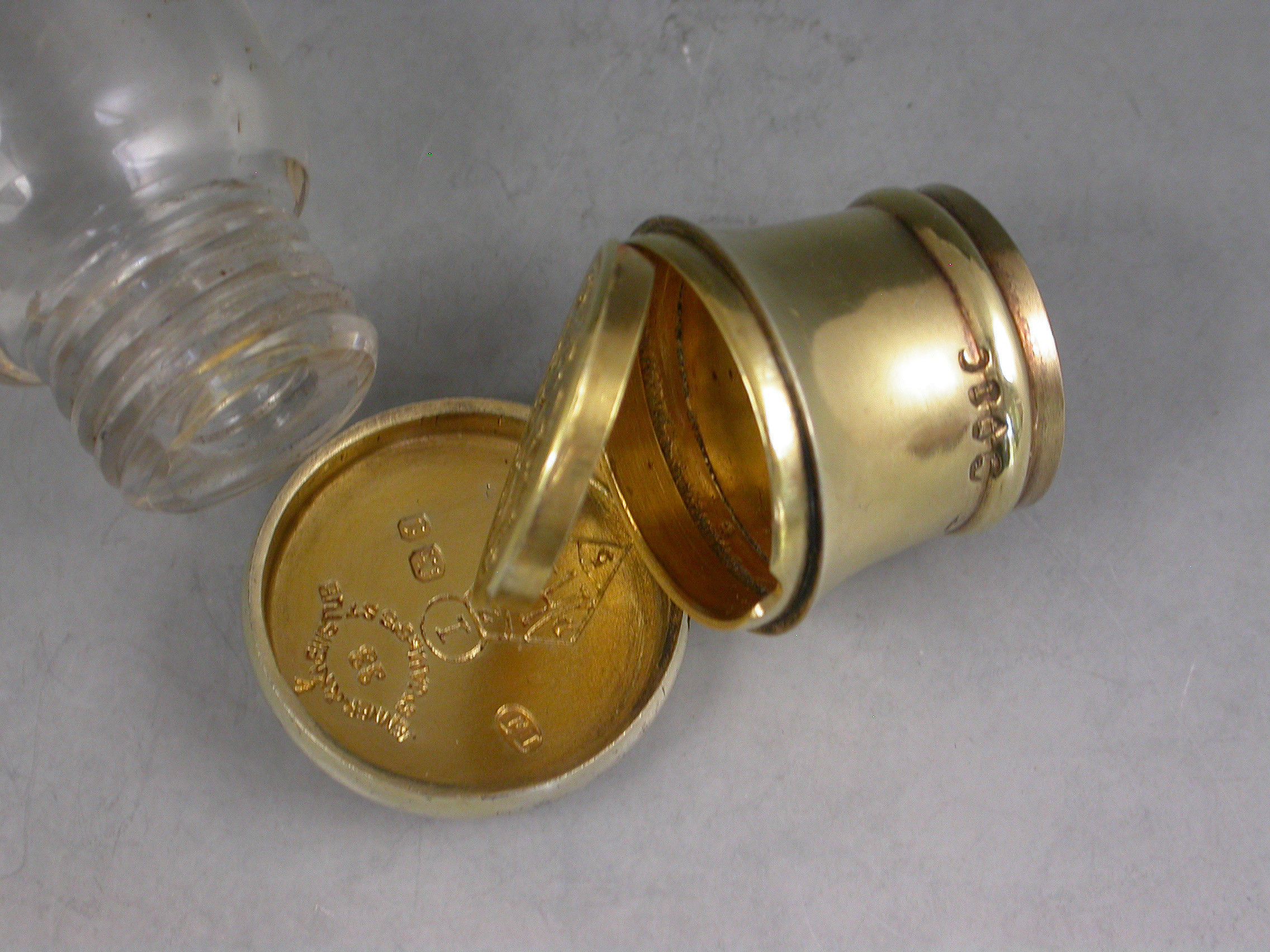 A fine quality and unusual Victorian silver gilt mounted 4 purpose double-ended glass Scent Bottle / Vinaigrette of binocular form, hinging at the centre to reveal a picture frame compartment. One end with screw off cover to the smelling salts bottle, the top of the cover hinging open to reveal a vinaigrette, the other end with sprung push button release to the scent bottle, the lid also hinged and opening to reveal a pill box. Each end with applied cypher.