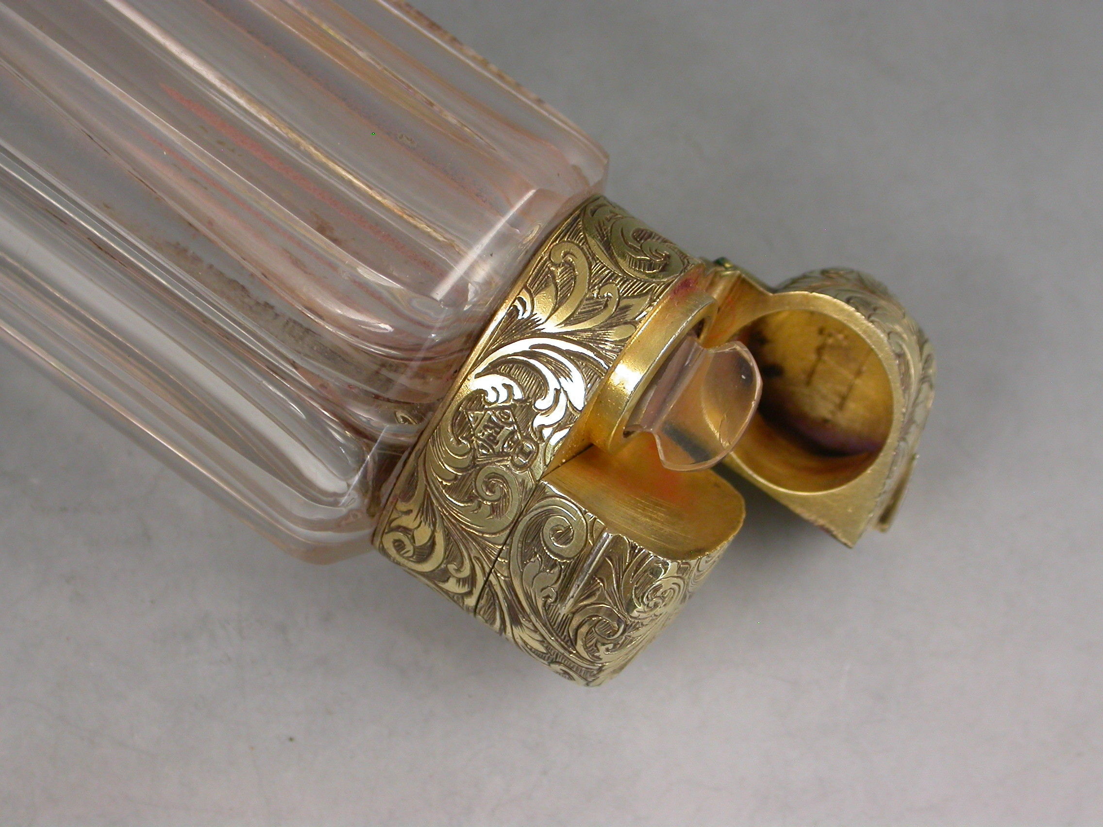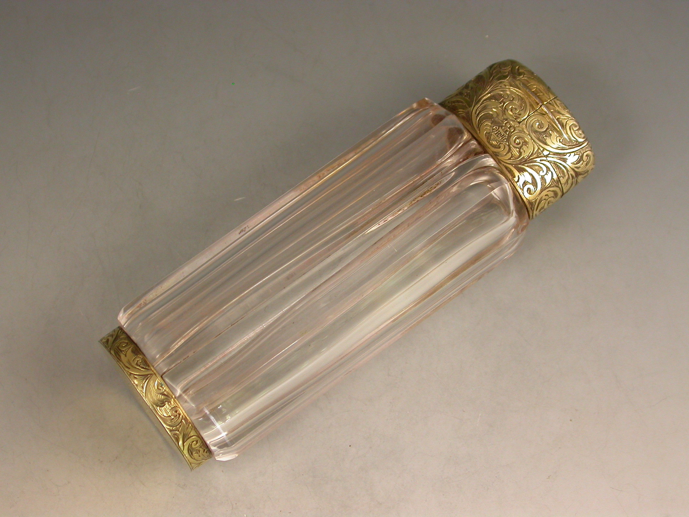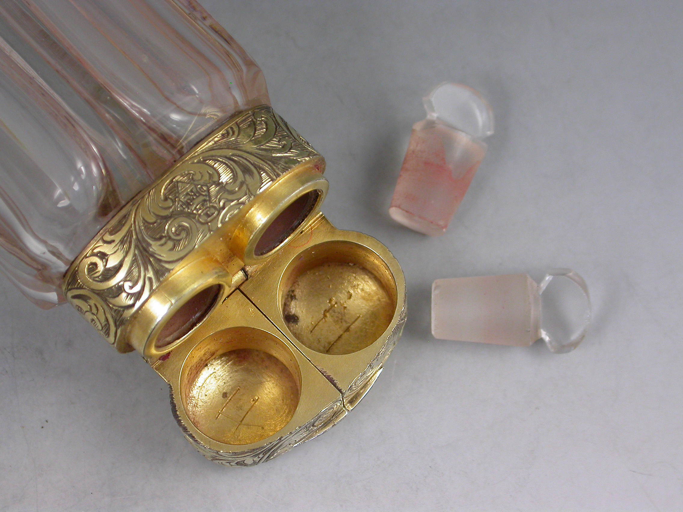 A fine quality Victorian silver gilt mounted glass double Scent Bottle, formed of two separate bottles to produce a six paneled bottle with double flip-over lids covering stoppers. The silver gilt lids superbly engraved with foliate scrolls, the silver gilt base stamped with design registration for 1858.