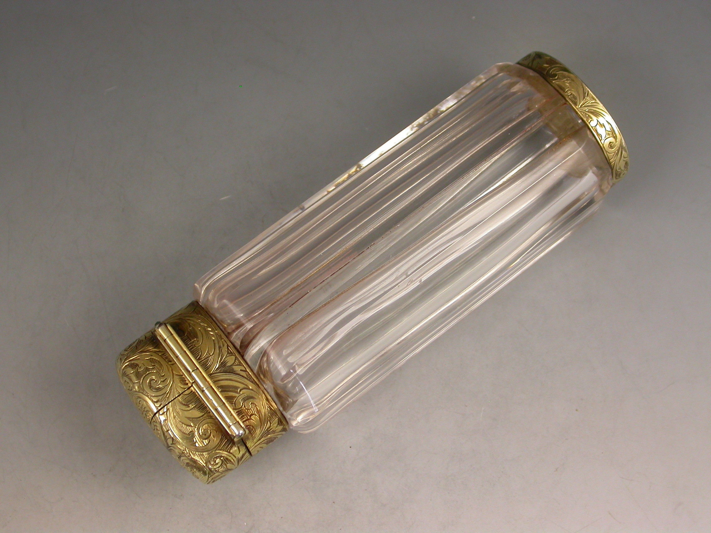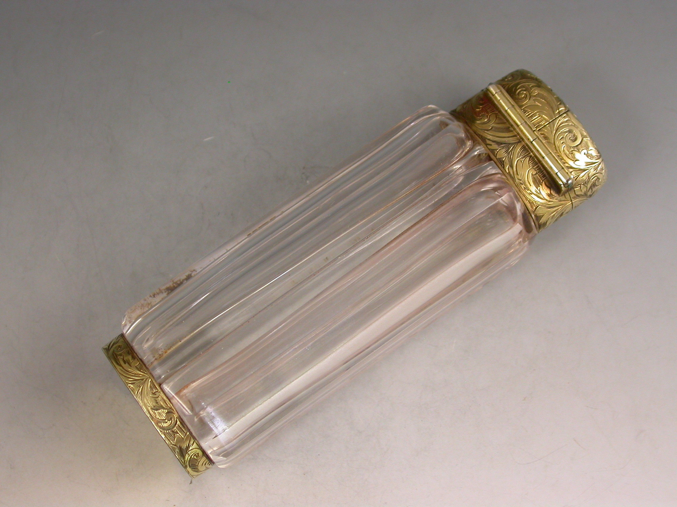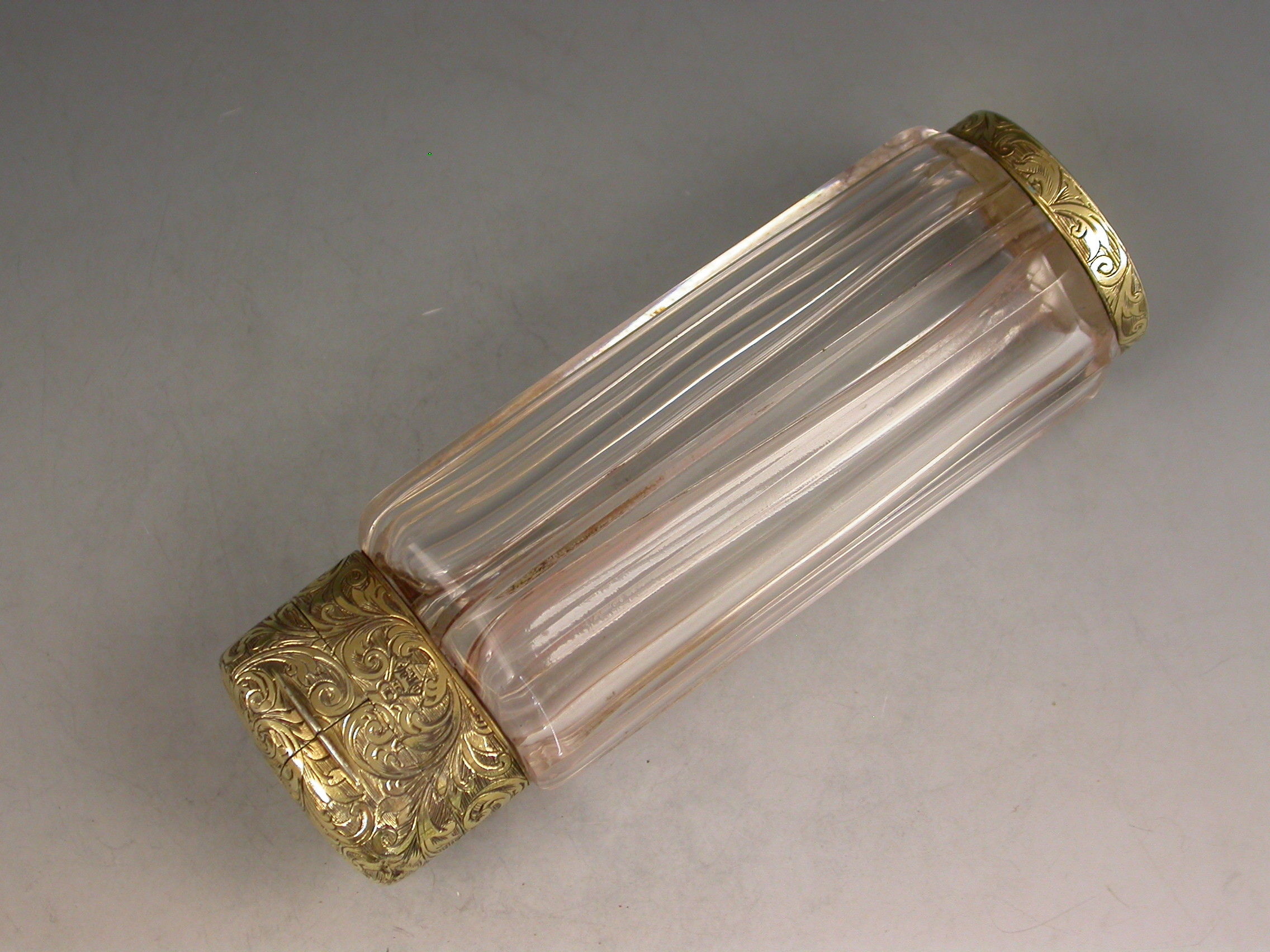A fine quality Victorian silver gilt mounted glass double Scent Bottle, formed of two separate bottles to produce a six paneled bottle with double flip-over lids covering stoppers. The silver gilt lids superbly engraved with foliate scrolls, the silver gilt base stamped with design registration for 1858.