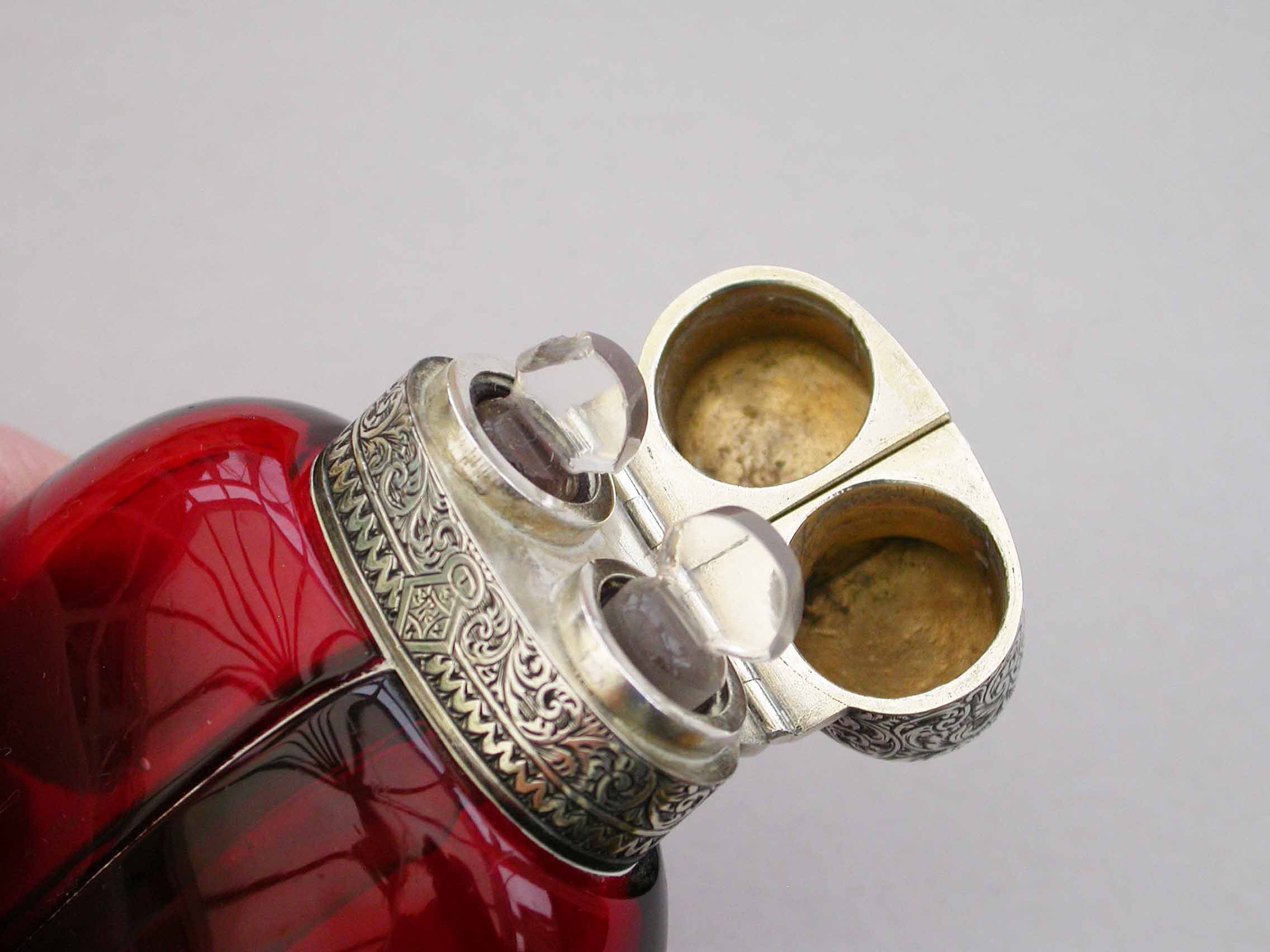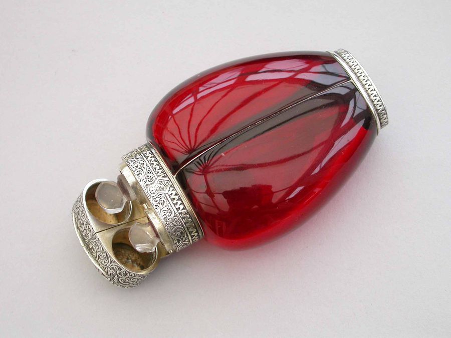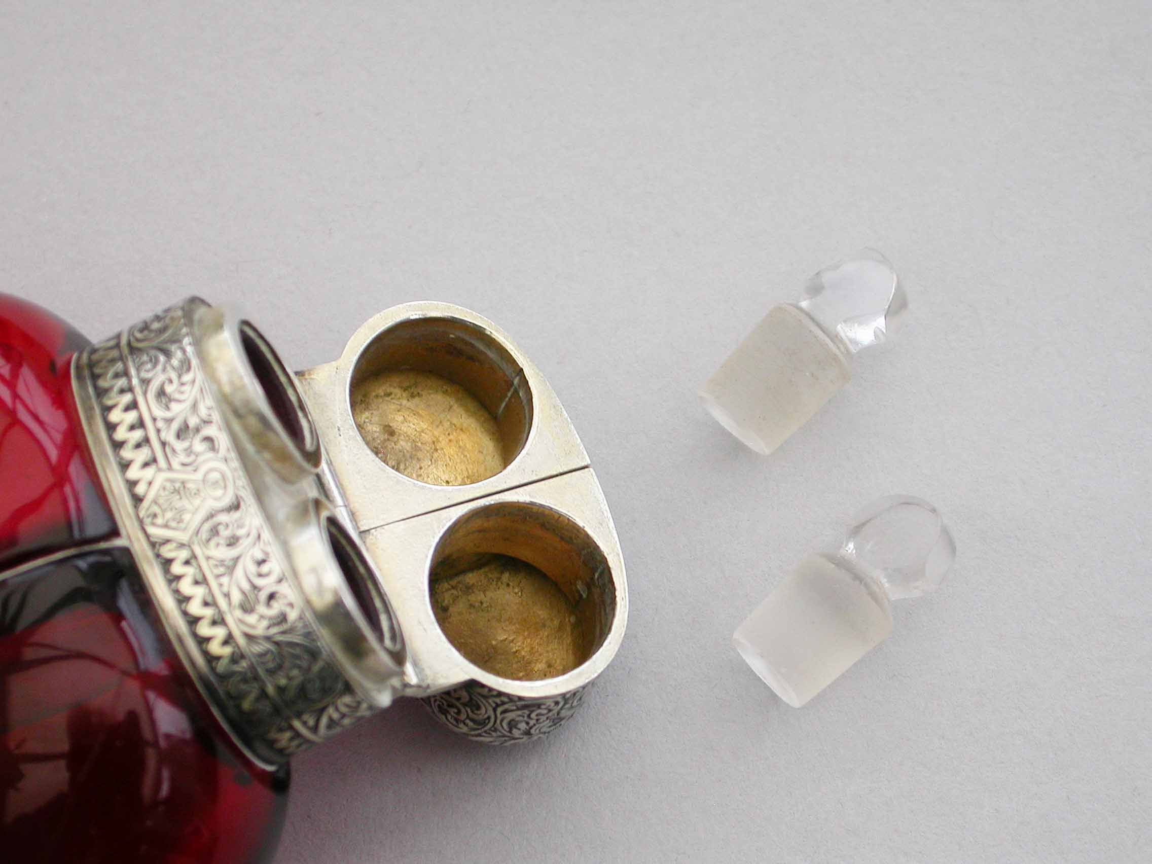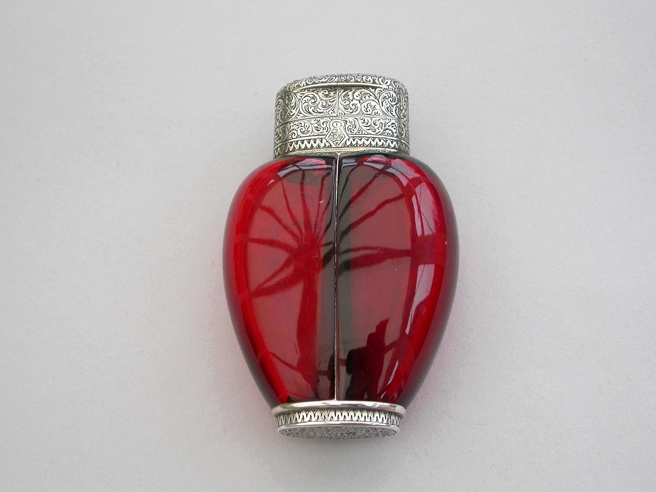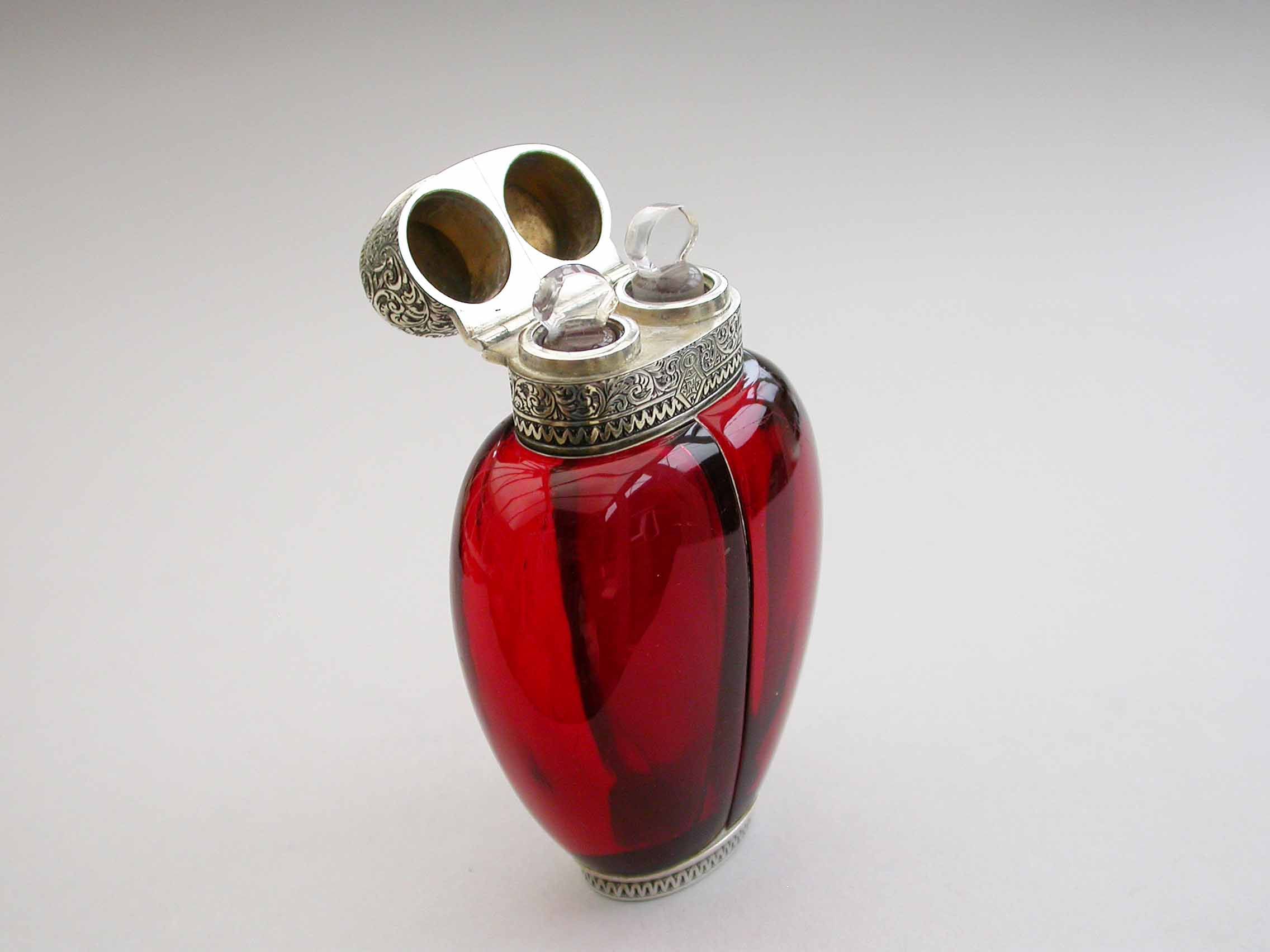Victorian Silver Gilt Mounted Heart Shaped Ruby Glass Twin Compartment Scent Bottle