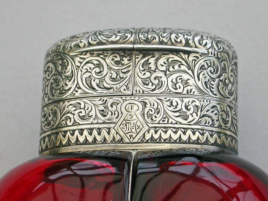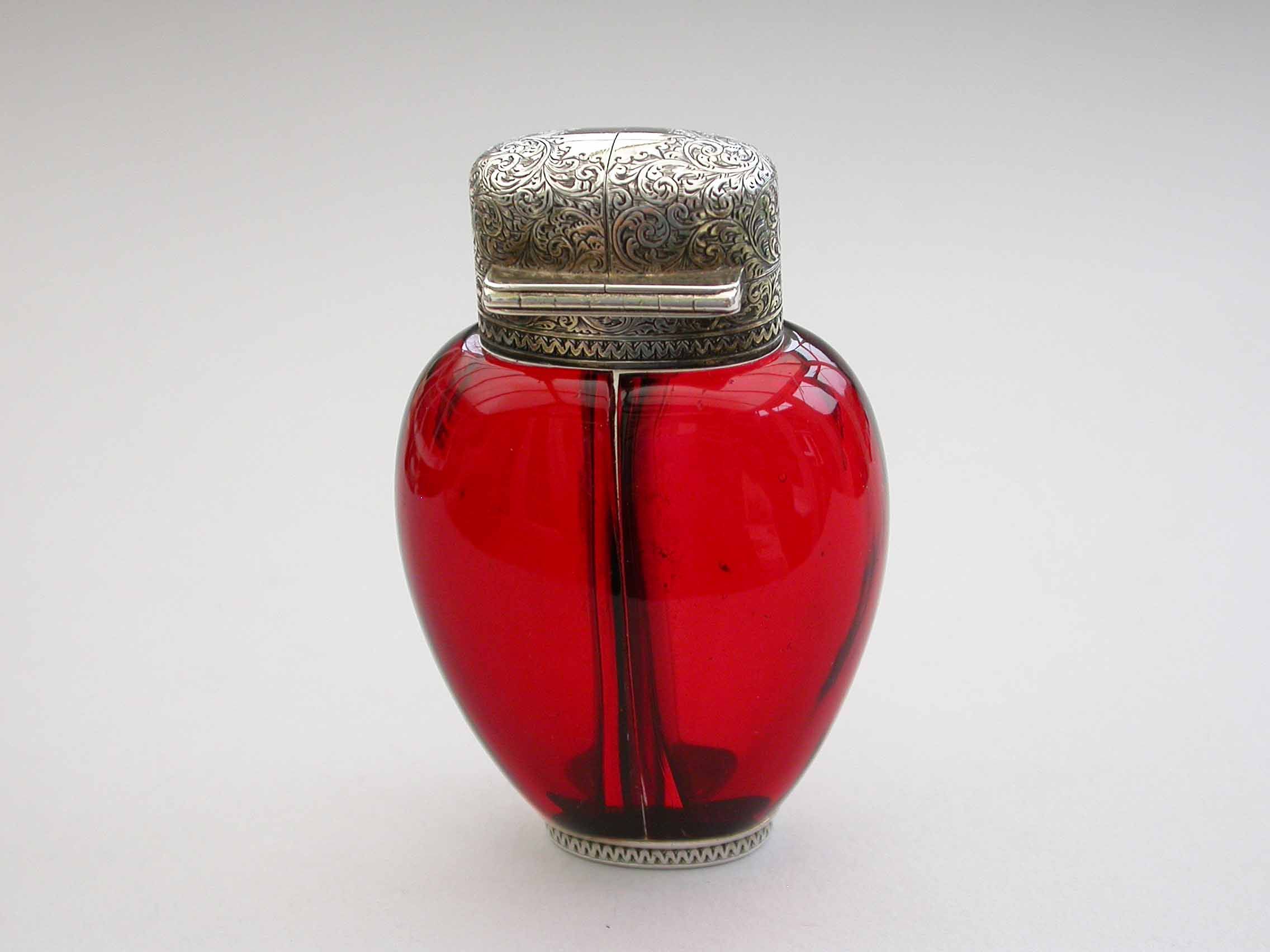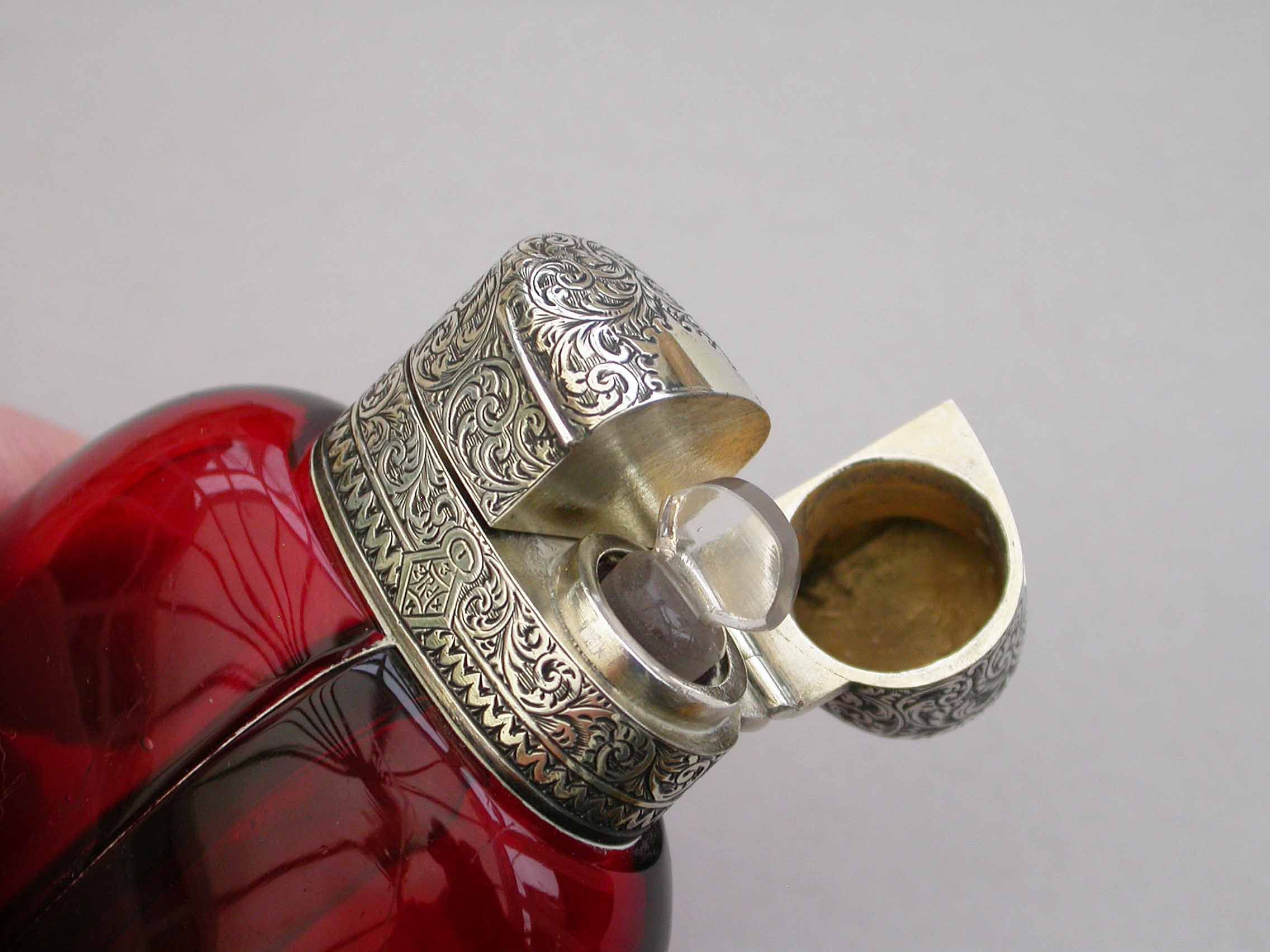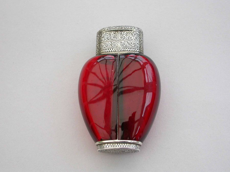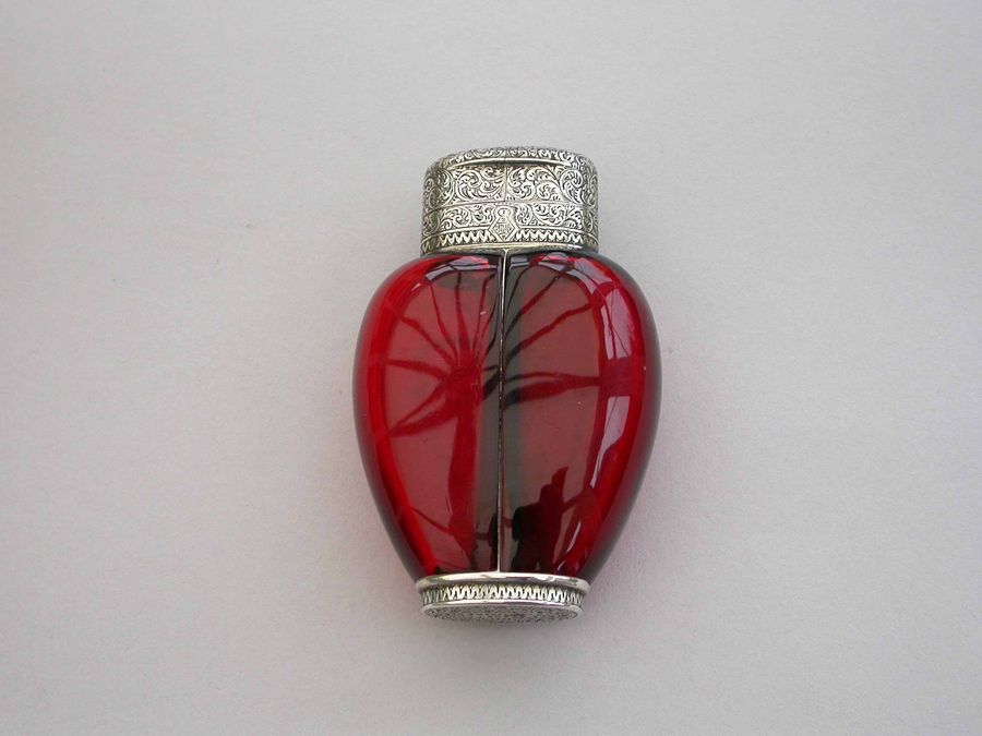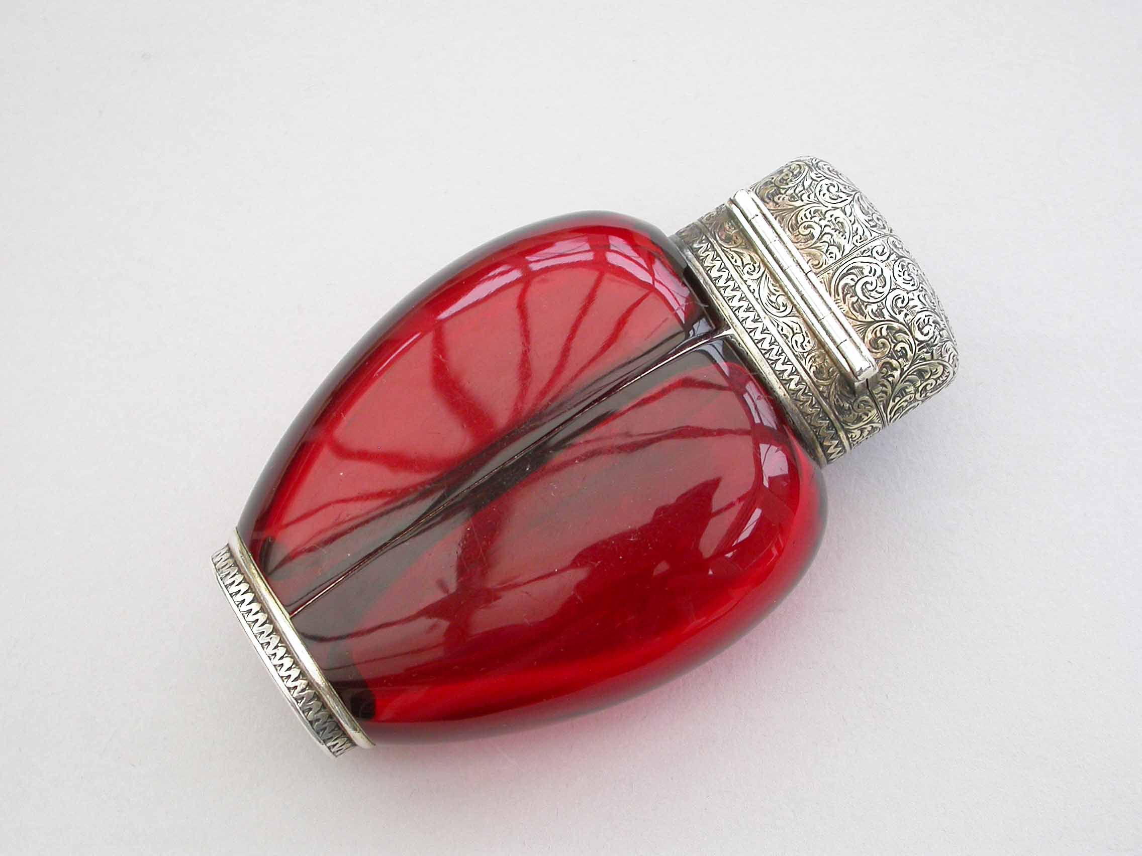 Victorian Silver Gilt Mounted Heart Shaped Ruby Glass Twin Compartment Scent Bottle