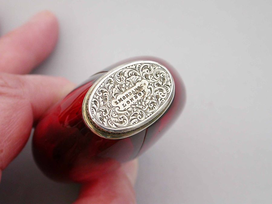 A fine quality Victorian silver gilt mounted ruby glass double Scent Bottle, of heart shaped form, the two compartments allowing for different scents to be kept in the same bottle. The very fine foliate scroll engraved mounts with two hinged lids revealing original glass stoppers, the collar engraved with a diamond Registration Mark for the 3rd November 1868. Stamped to the base: S Mordan & Co, London.