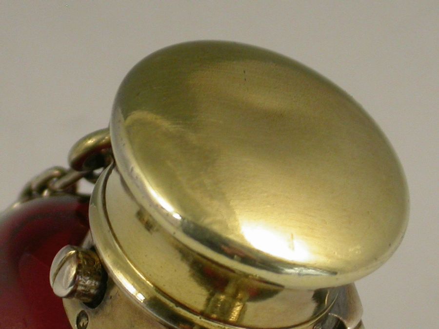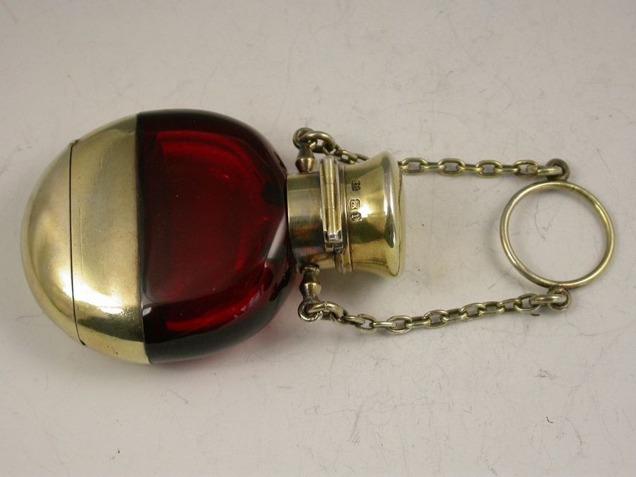 A fine Victorian silver gilt mounted circular ruby glass Scent Bottle with attached suspension ring and chains, the hinged lid with sprung push button opening mechanism, the lower part of the bottle with hinged lid opening to reveal Vinaigrette compartment with pierced grille and original sponge.