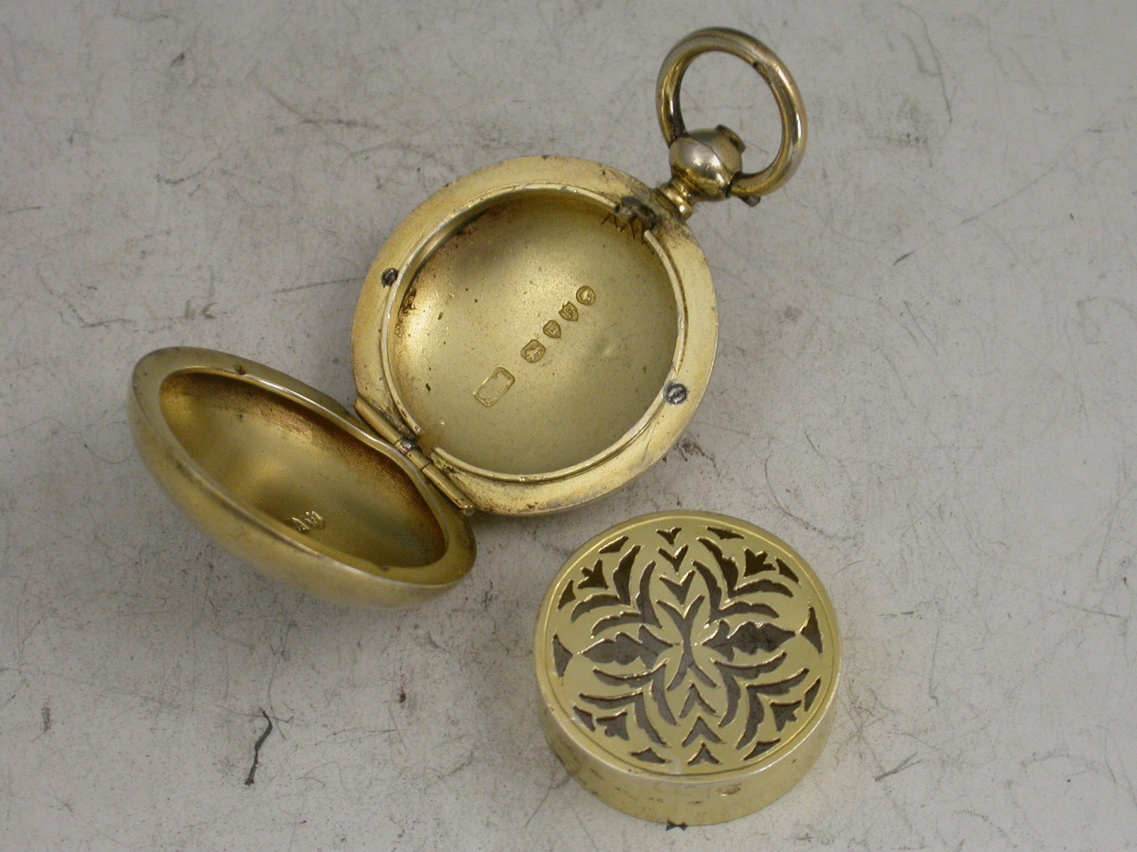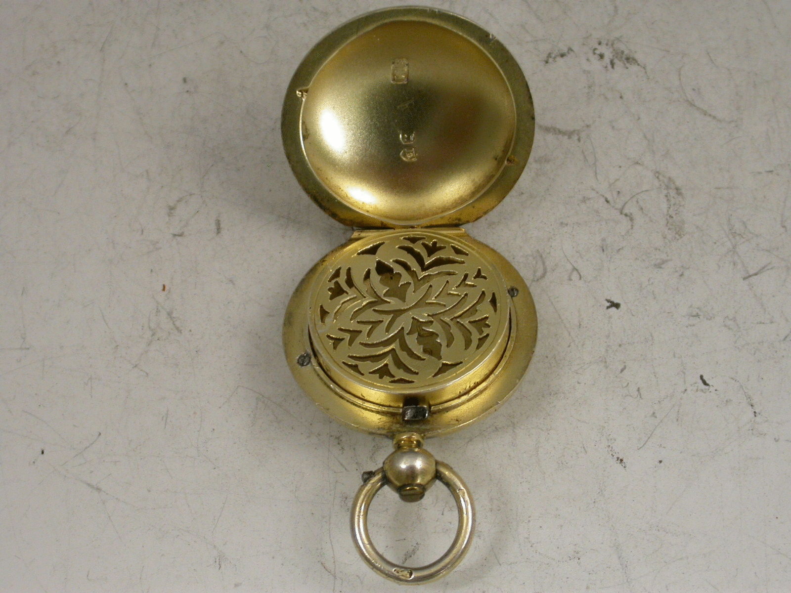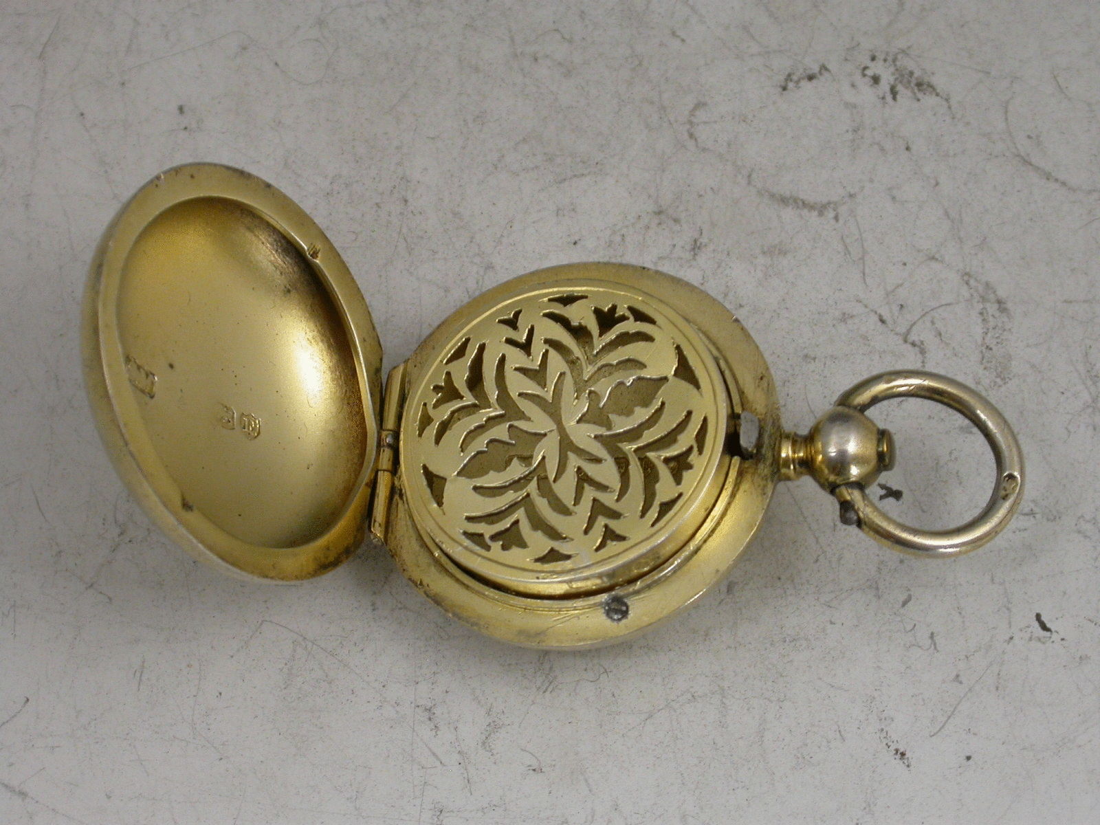 Victorian silver gilt Vinaigrette made in the form of a pocket watch, with push button sprung opening clasp and removable pierced grille.