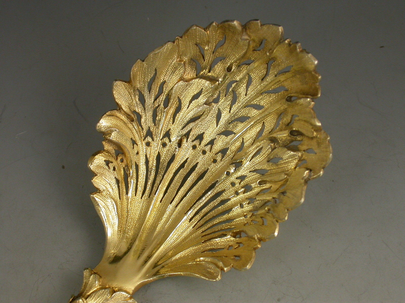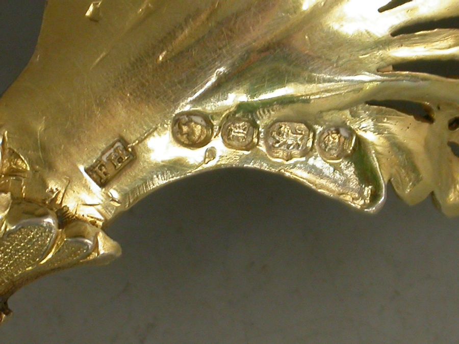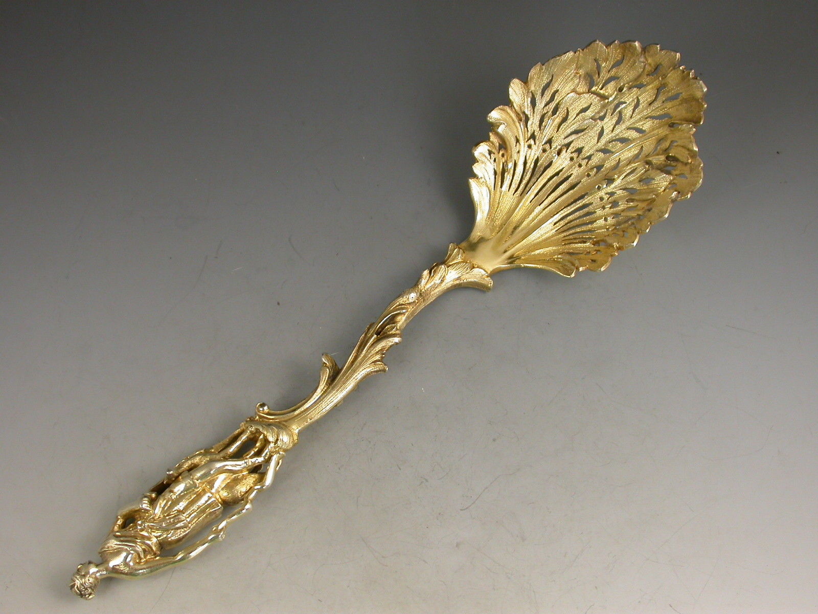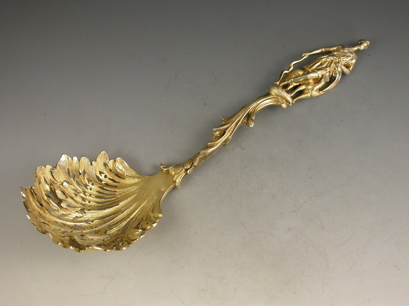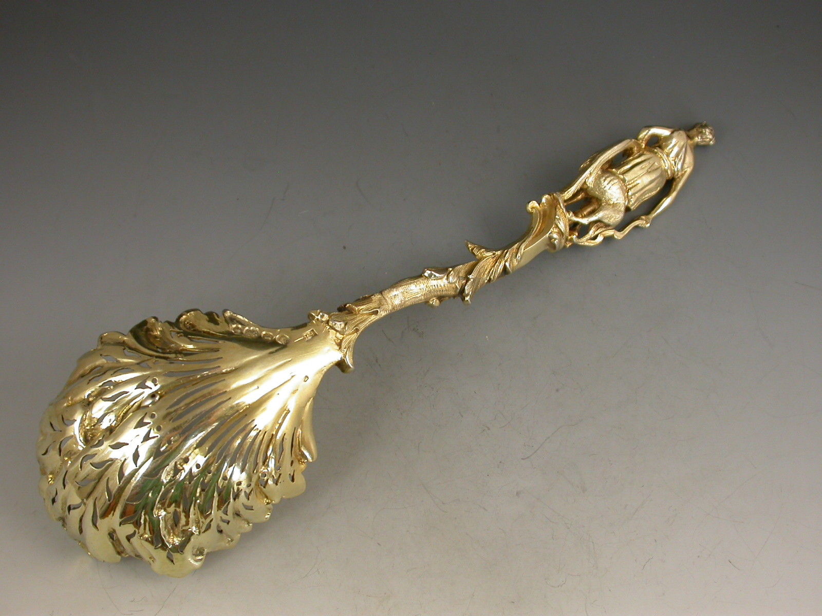 A very fine quality Victorian silver gilt Sifter Spoon in Rococo style with asymmetrical pierced leaf bowl and scrolled handle, the terminal with a cast figure of Diana The Huntress with a hound.