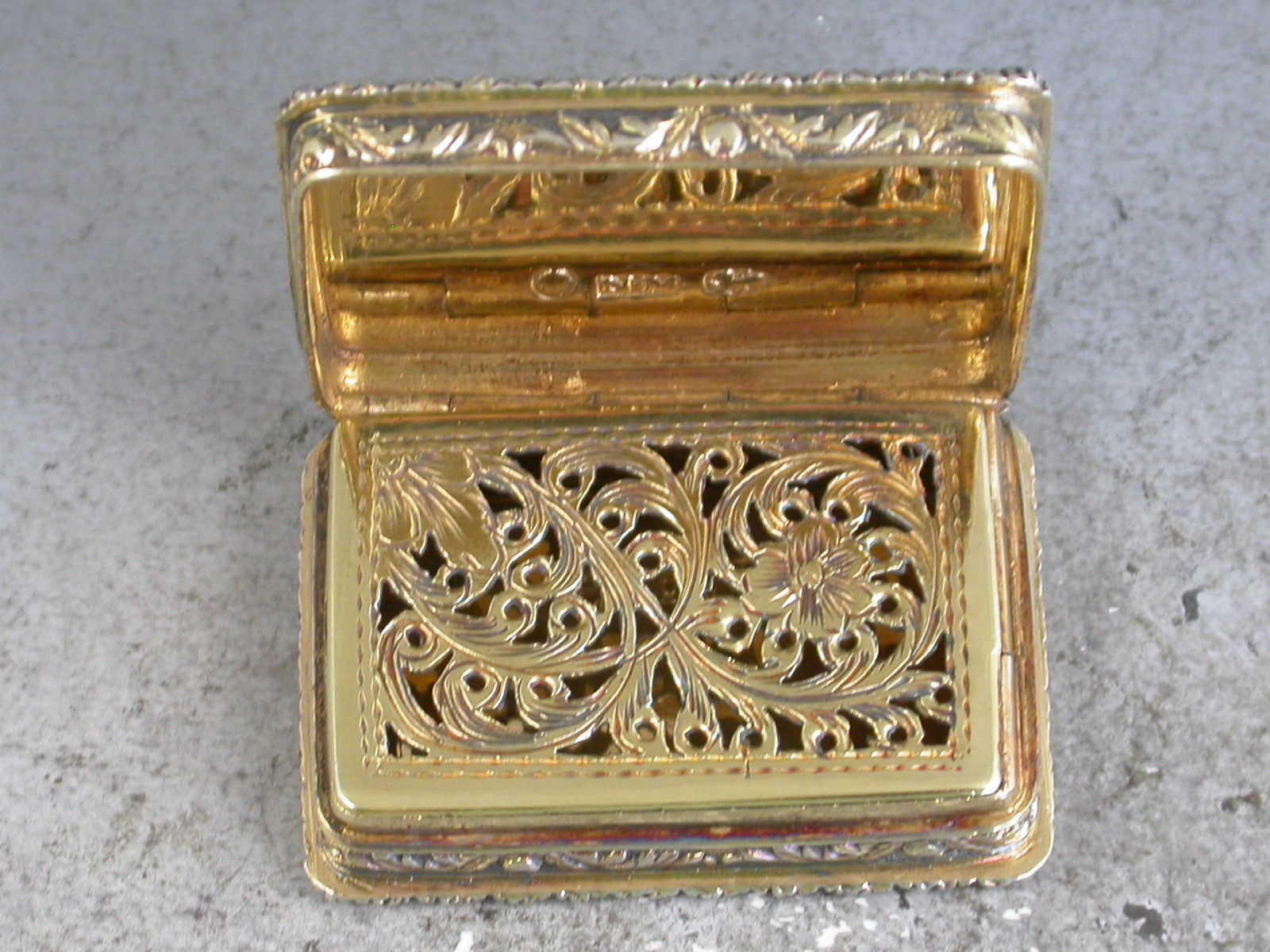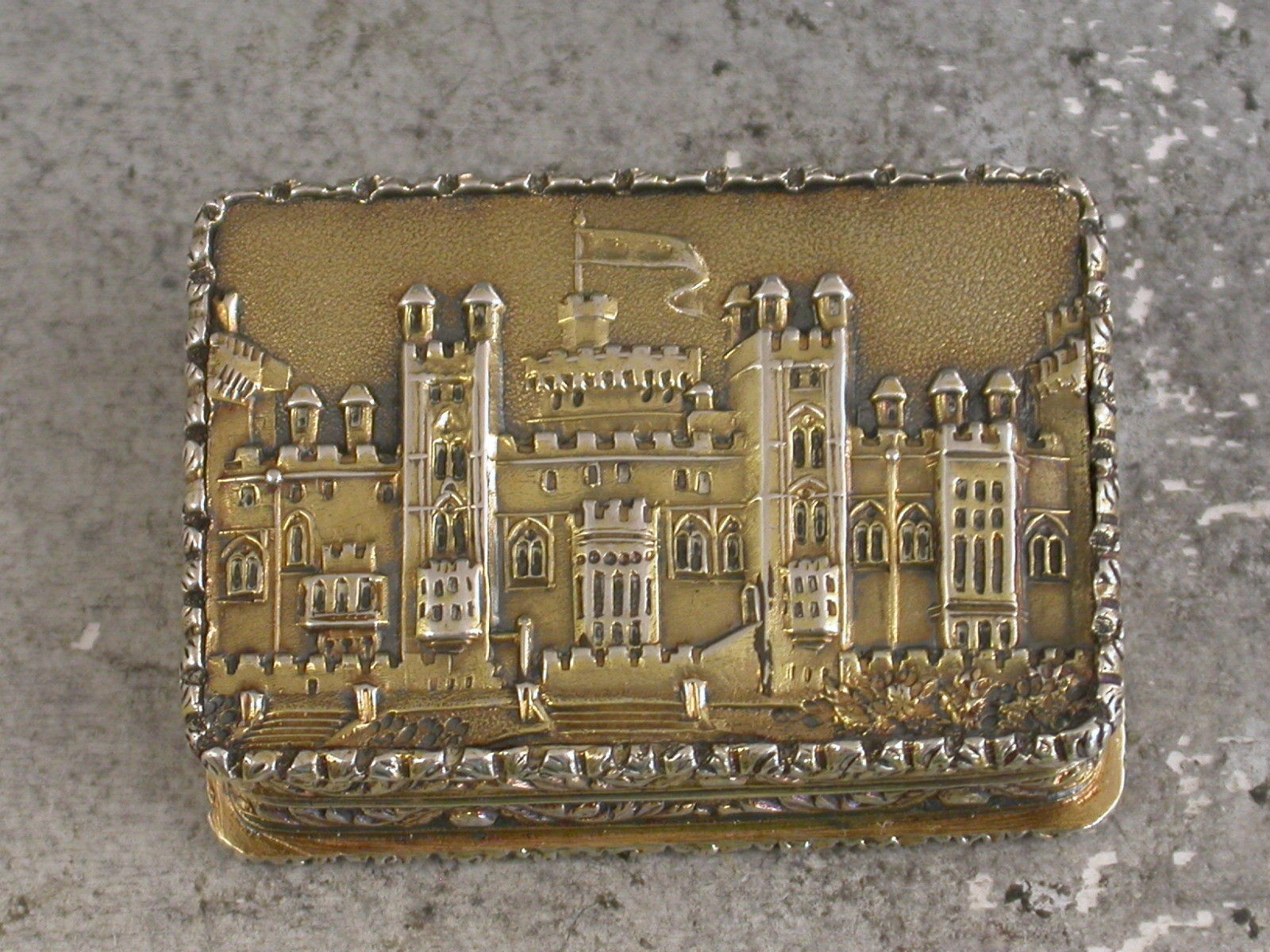 A fine quality early Victorian silver gilt 'Castle Top' Vinaigrette of rectangular form with raised foliate borders, the sides chased with flower heads and leaves, the base with engine turned decoration and a cartouche engraved with contemporary initials and dated 1840. The lid chased with the view of Windsor Castle in high relief. The silver gilt interior with a foliate scroll pierced grille.