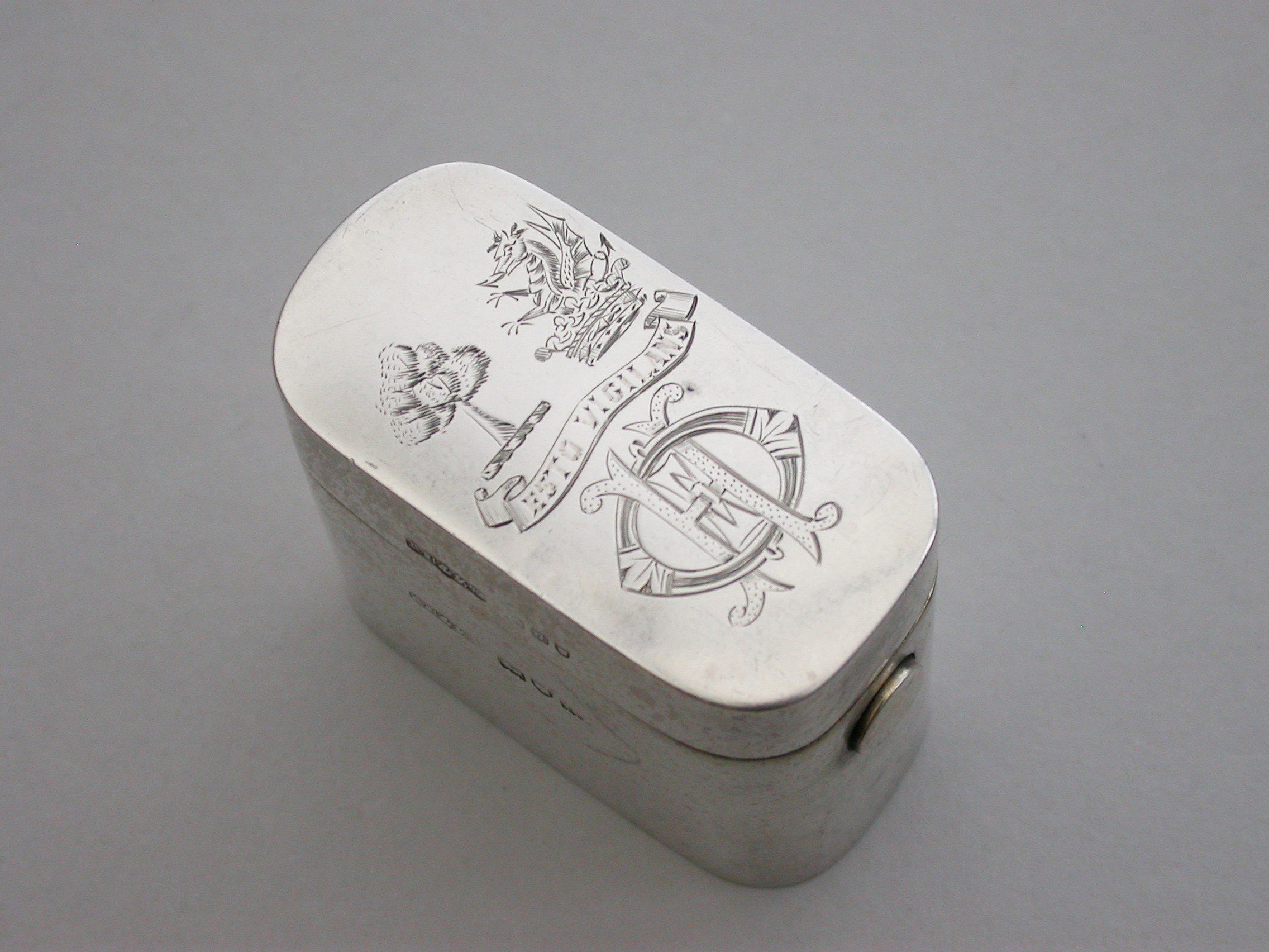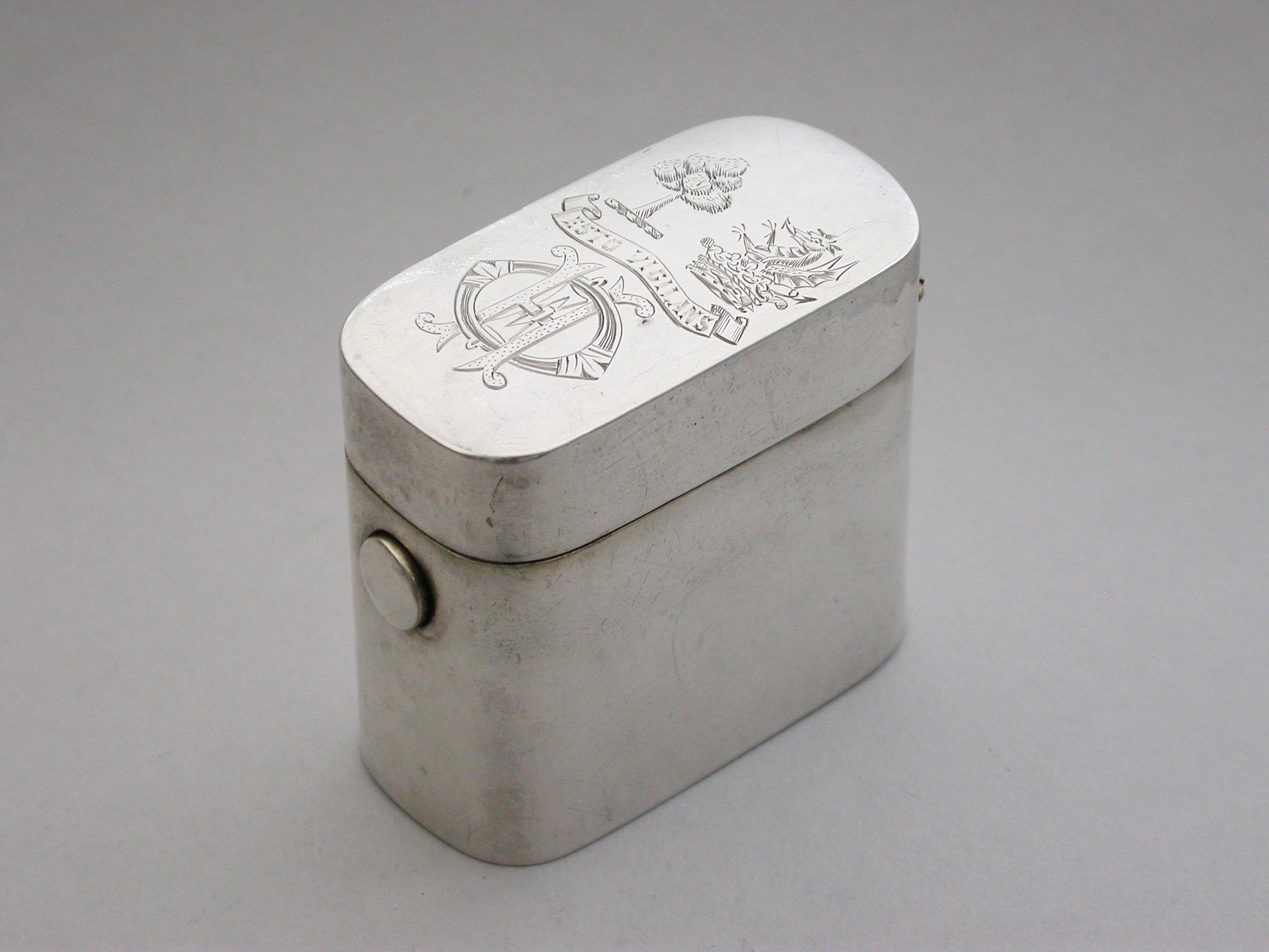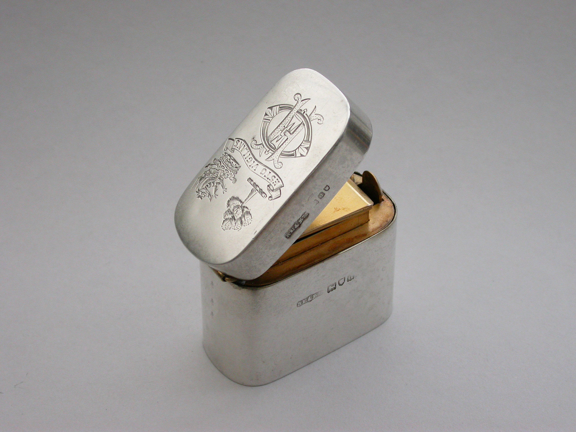 A good quality Victorian silver ""Go-to-Bed"" Vesta Case of a heavy gauge and rounded oblong form, the lid engraved with contemporary crests, motto and initials. A push-button sprung opening mechanism to the hinged lid and a silver gilt interior with two further protective hinged lids to the vesta compartment, one set with a striker. A ball shaped support for a lit match.