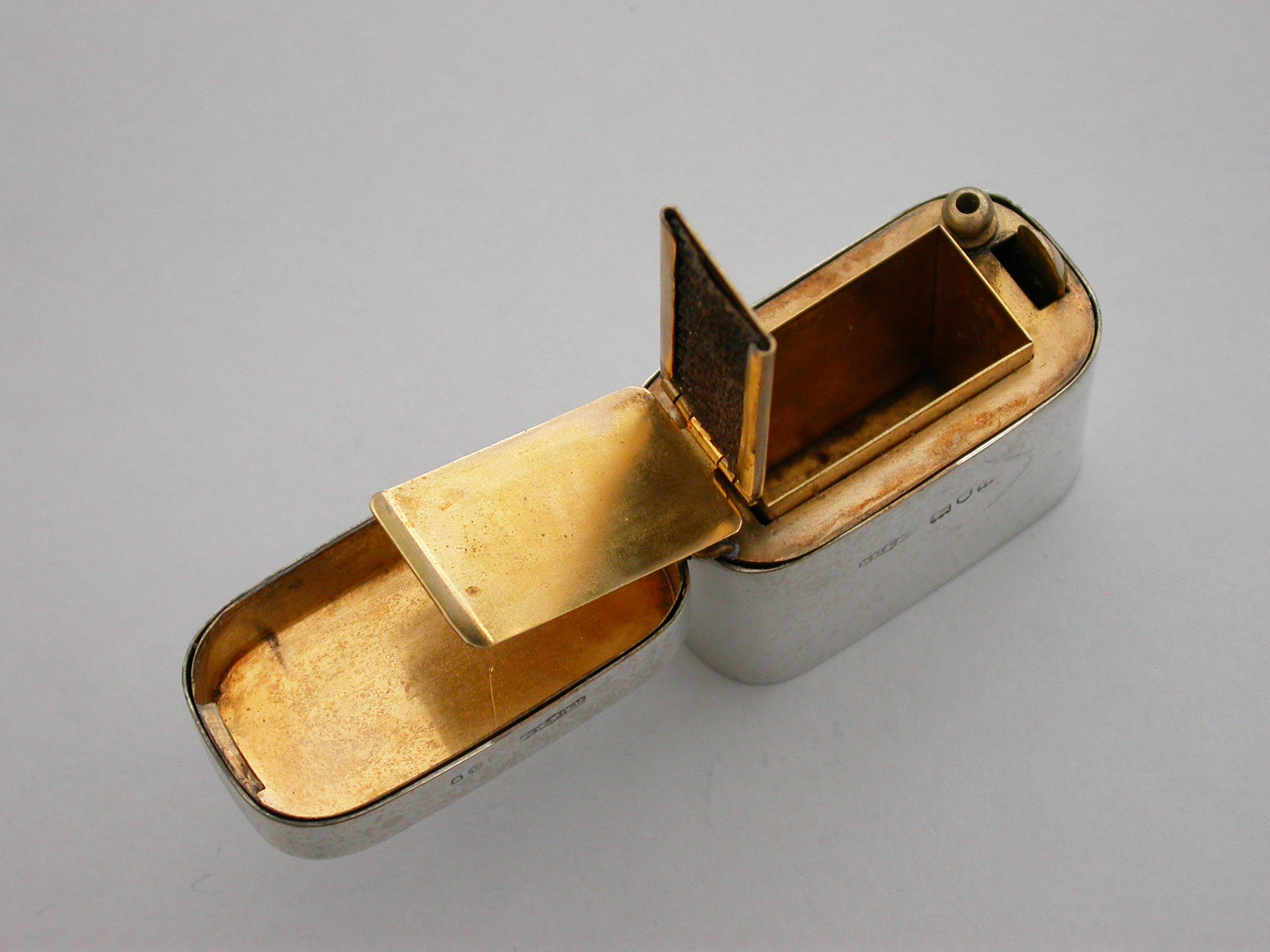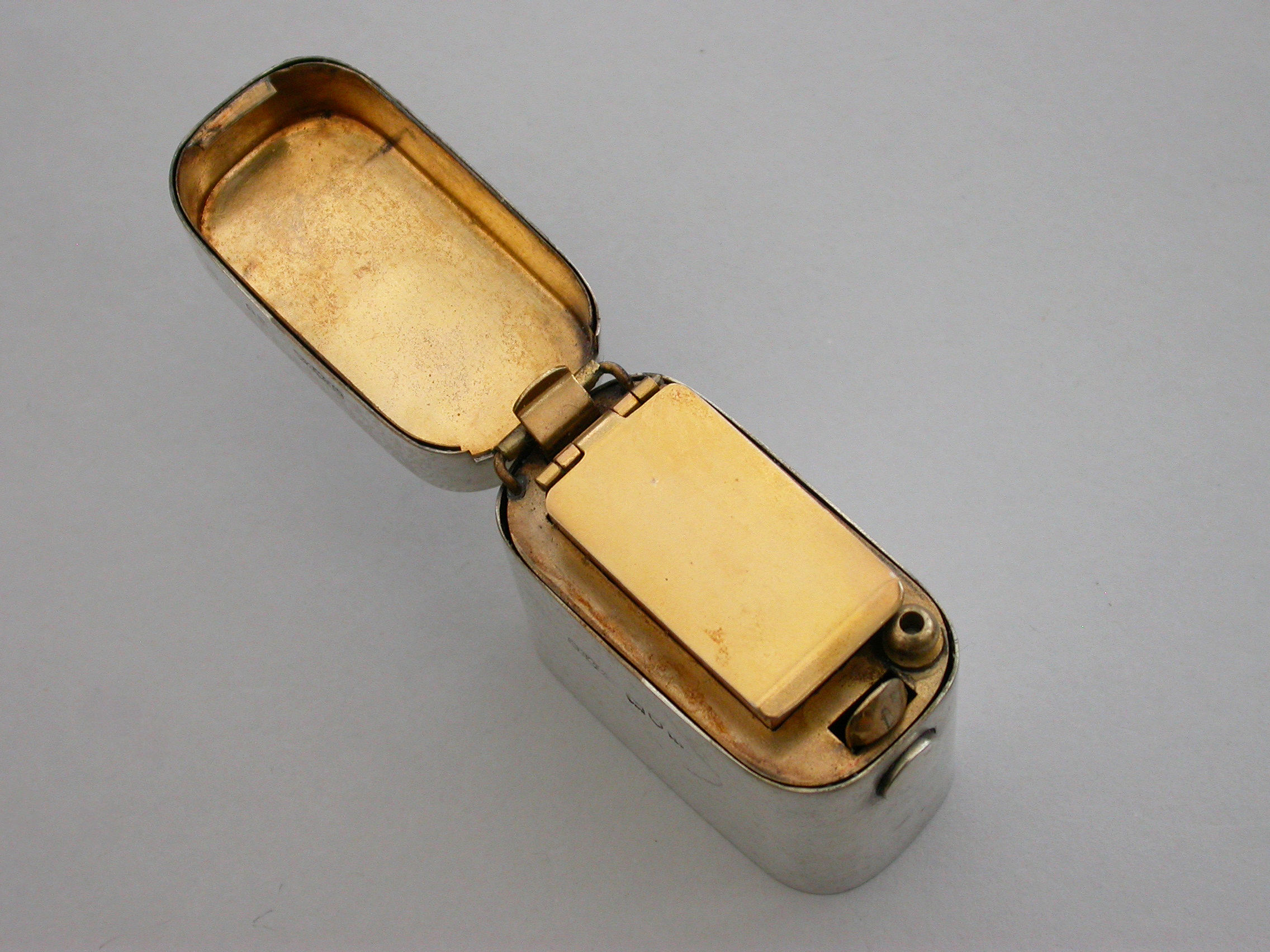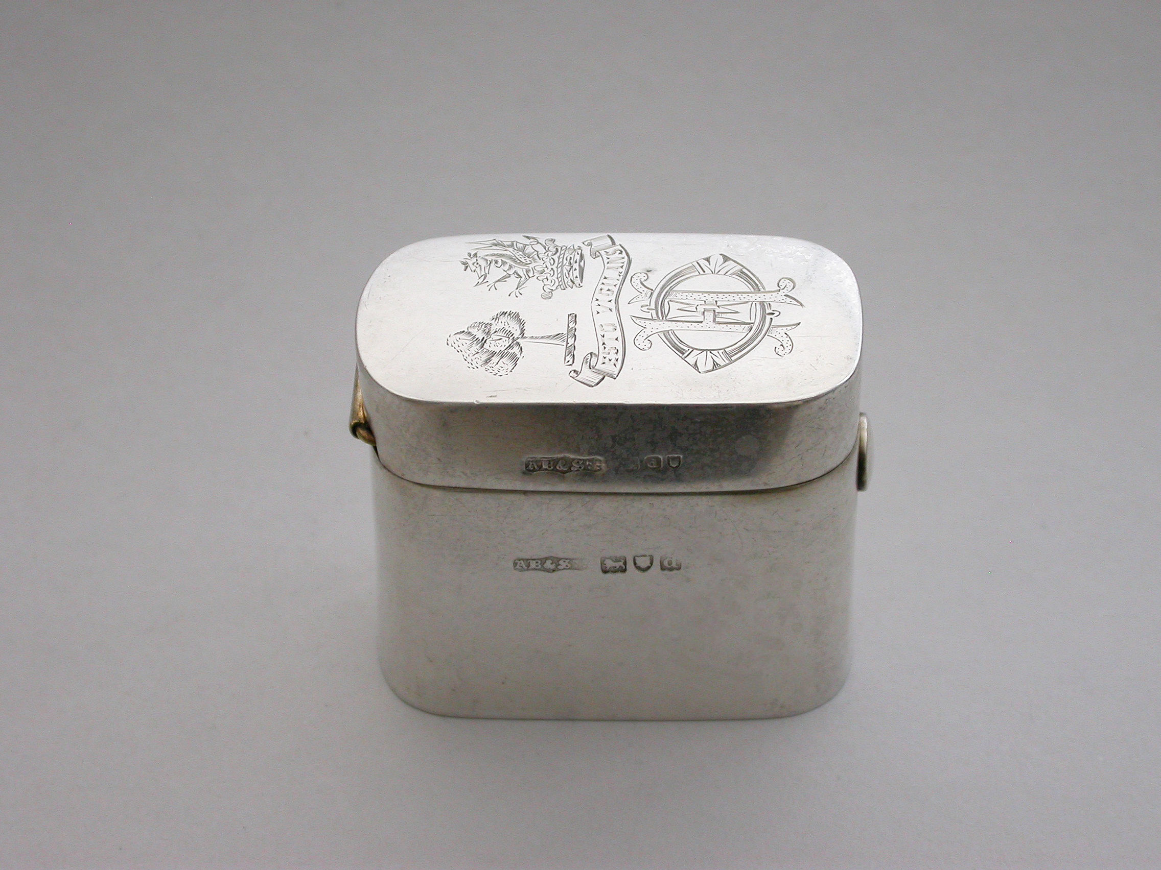 A good quality Victorian silver ""Go-to-Bed"" Vesta Case of a heavy gauge and rounded oblong form, the lid engraved with contemporary crests, motto and initials. A push-button sprung opening mechanism to the hinged lid and a silver gilt interior with two further protective hinged lids to the vesta compartment, one set with a striker. A ball shaped support for a lit match.