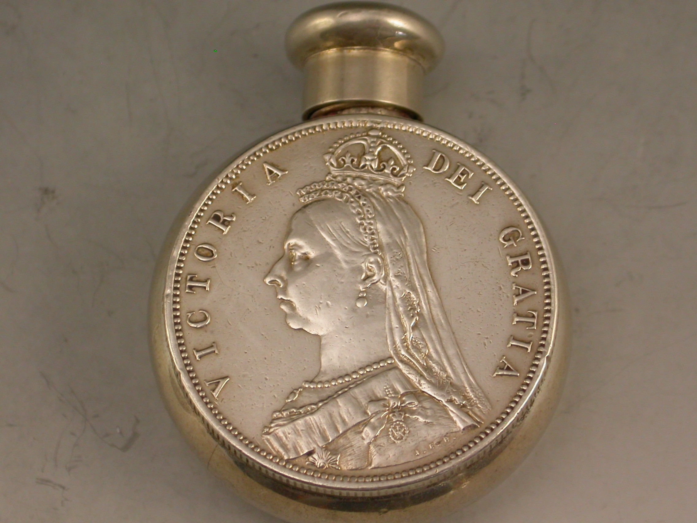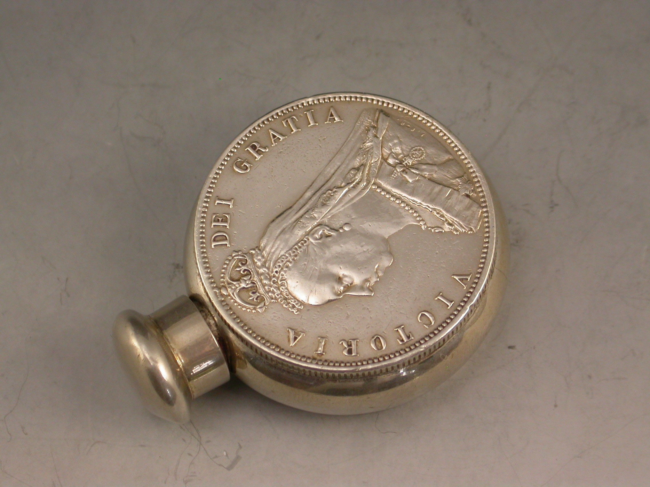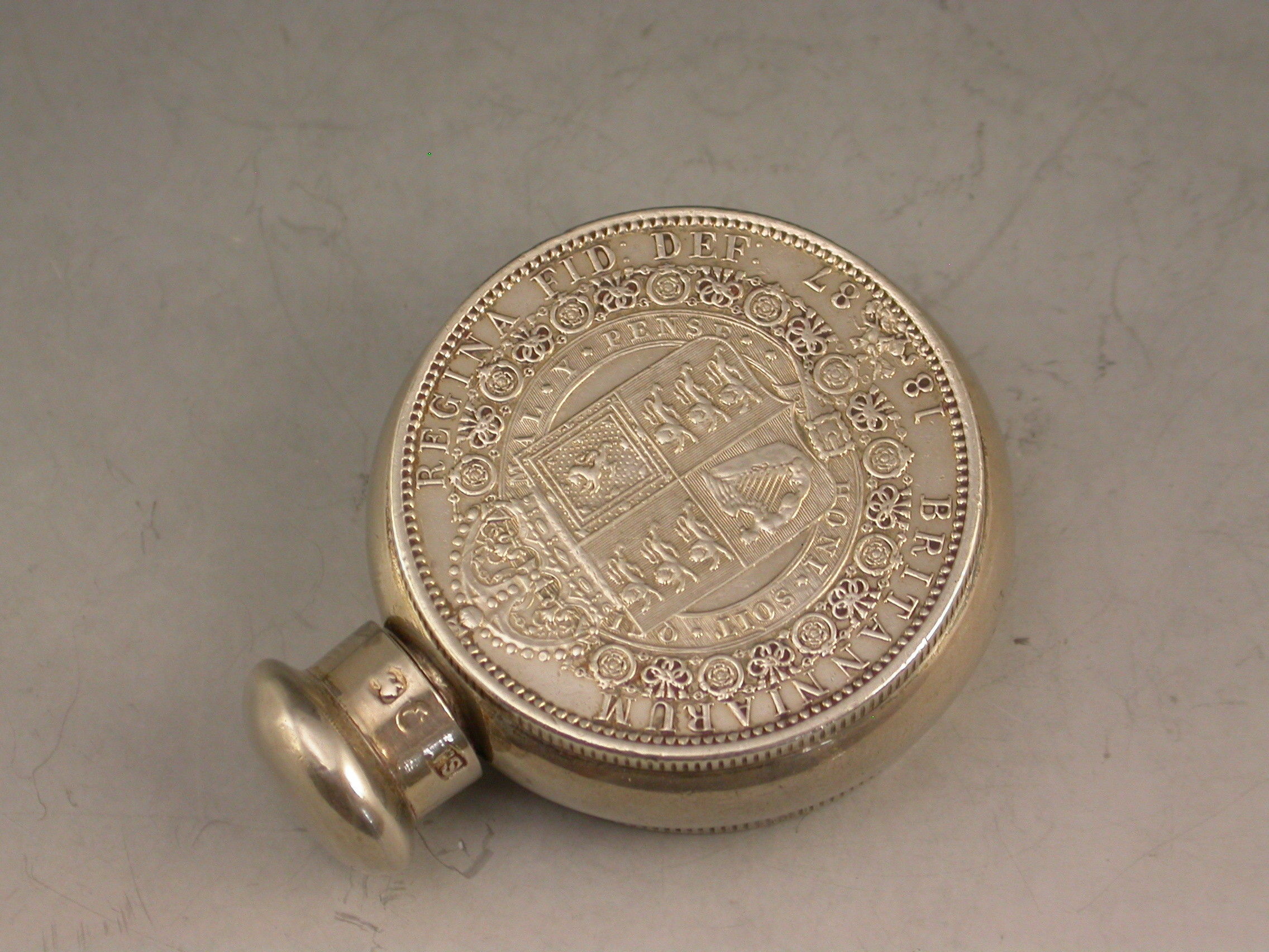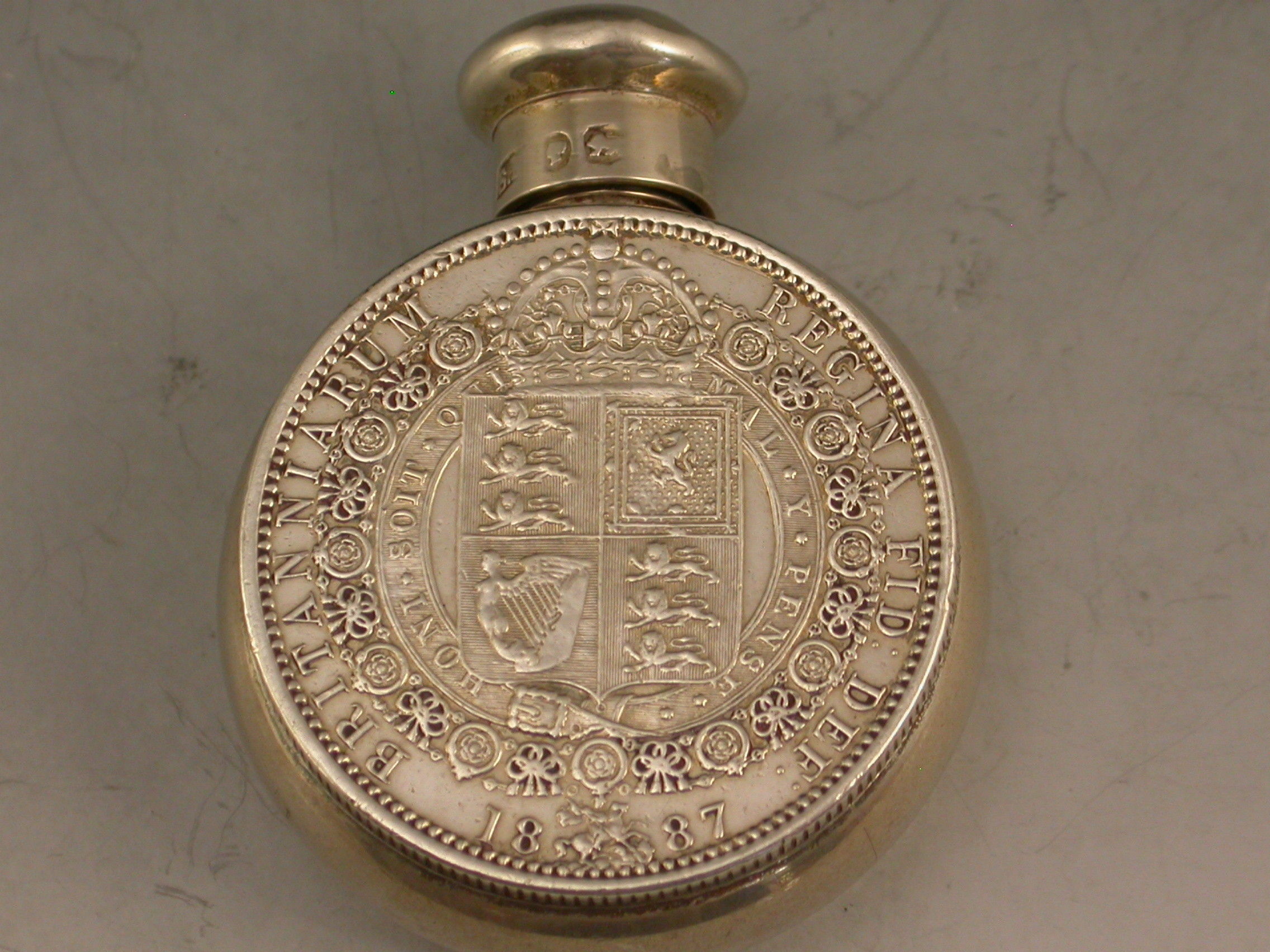 A good Victorian circular silver Scent Bottle, the sides formed from two 1887 half crowns. Screw off domed lid.