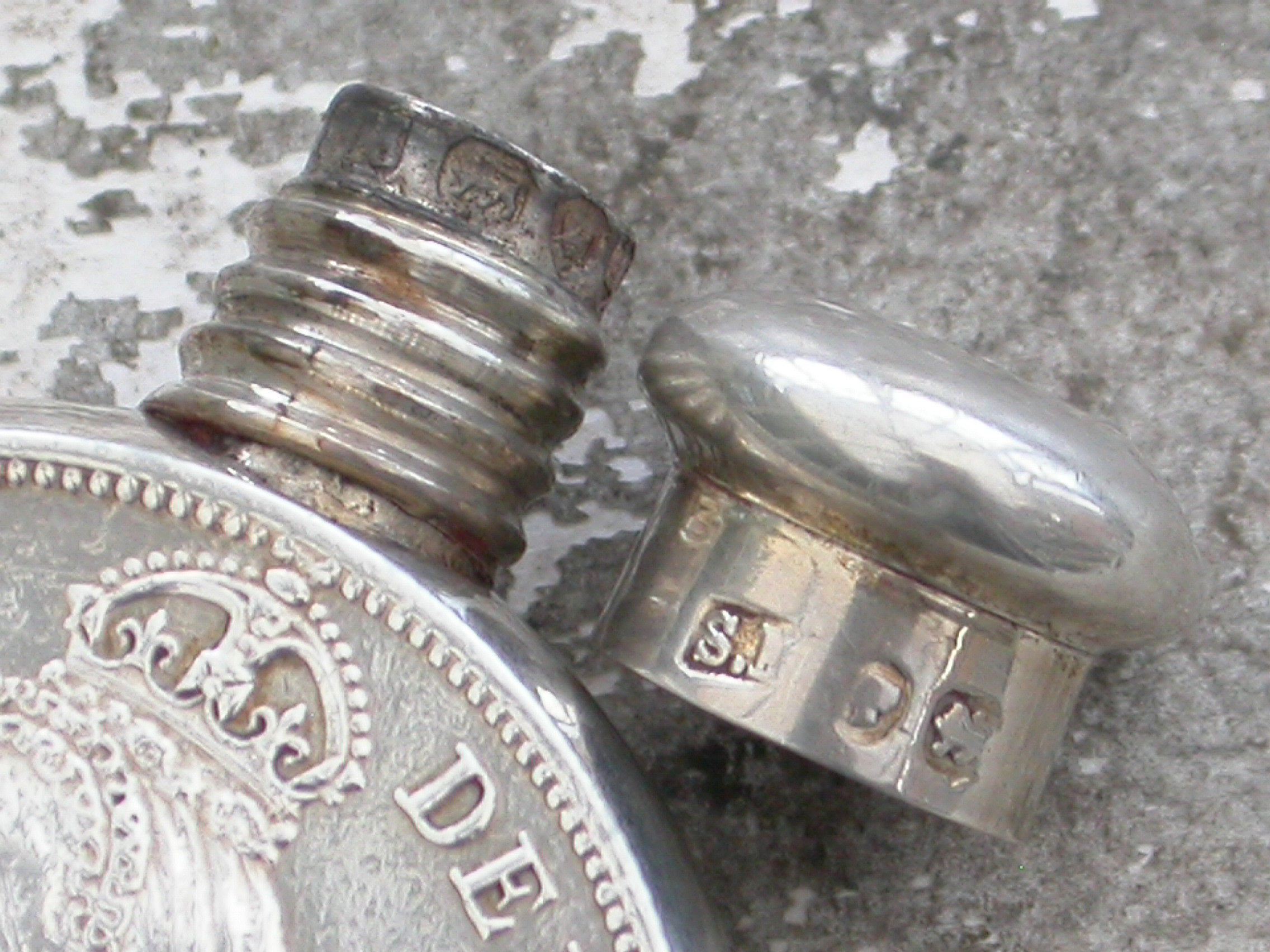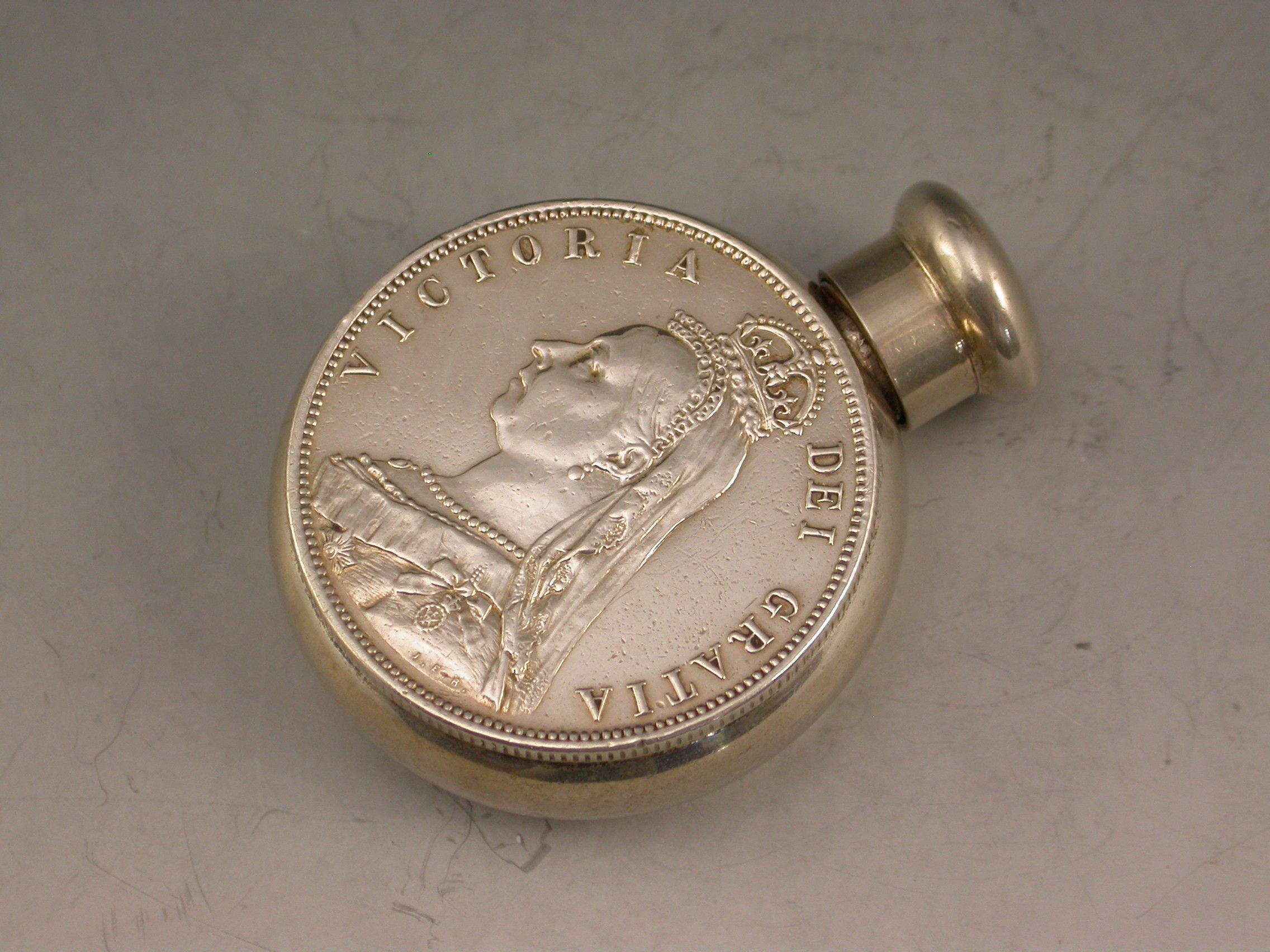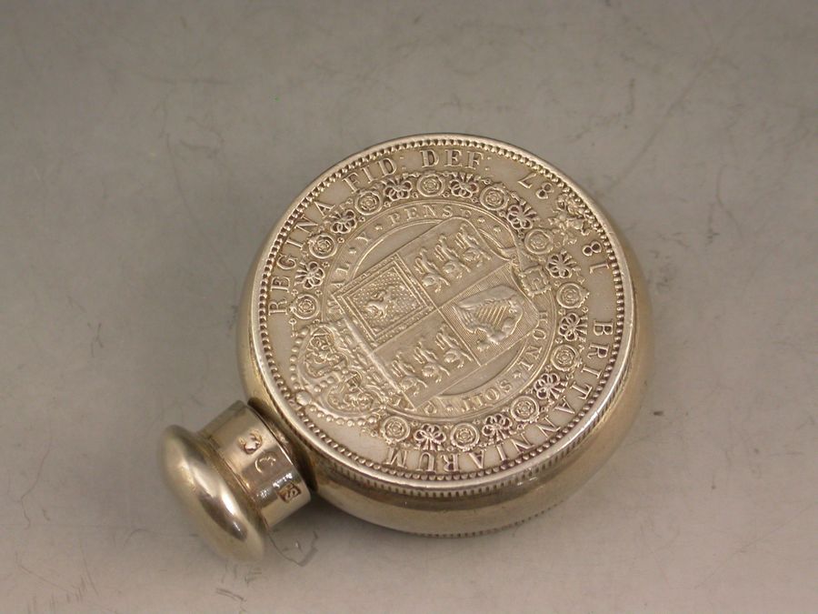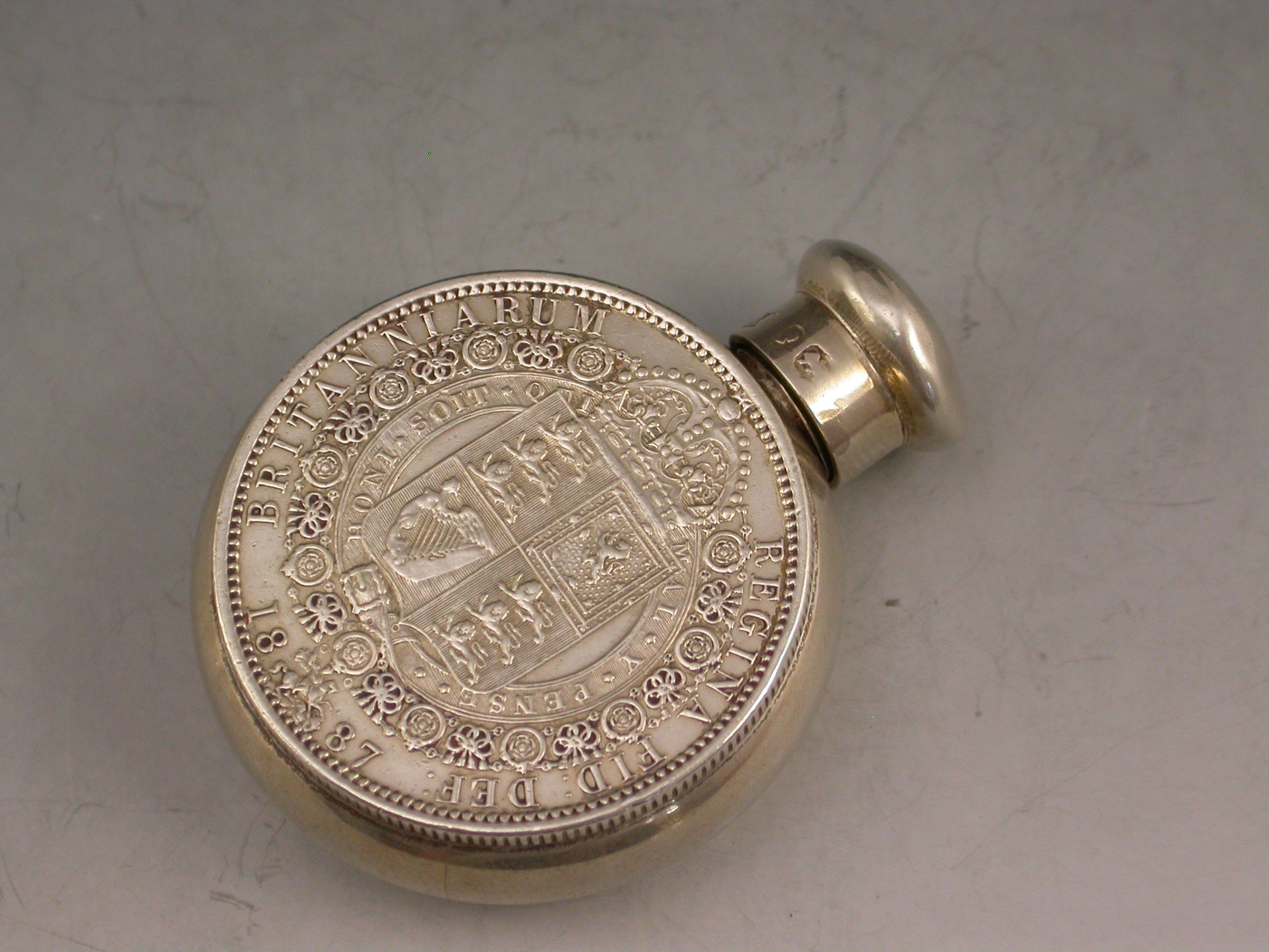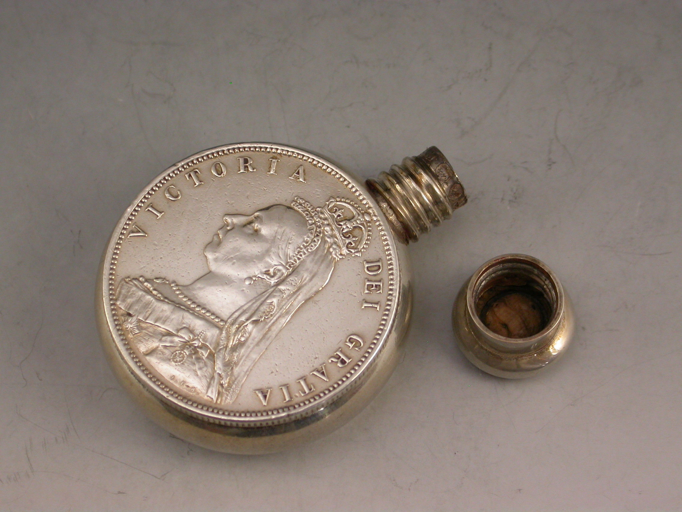 A good Victorian circular silver Scent Bottle, the sides formed from two 1887 half crowns. Screw off domed lid.