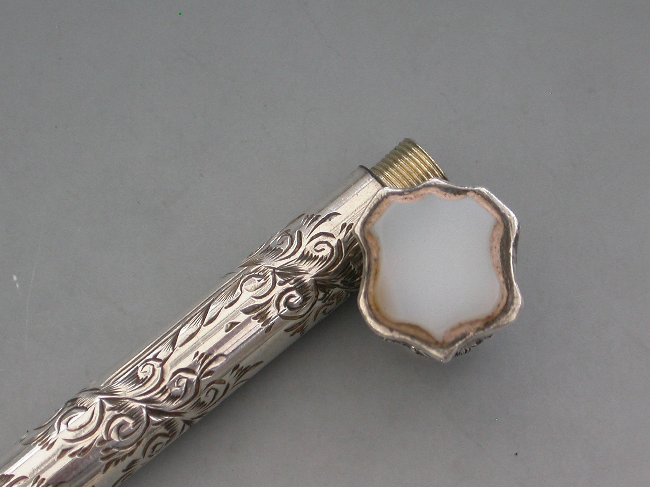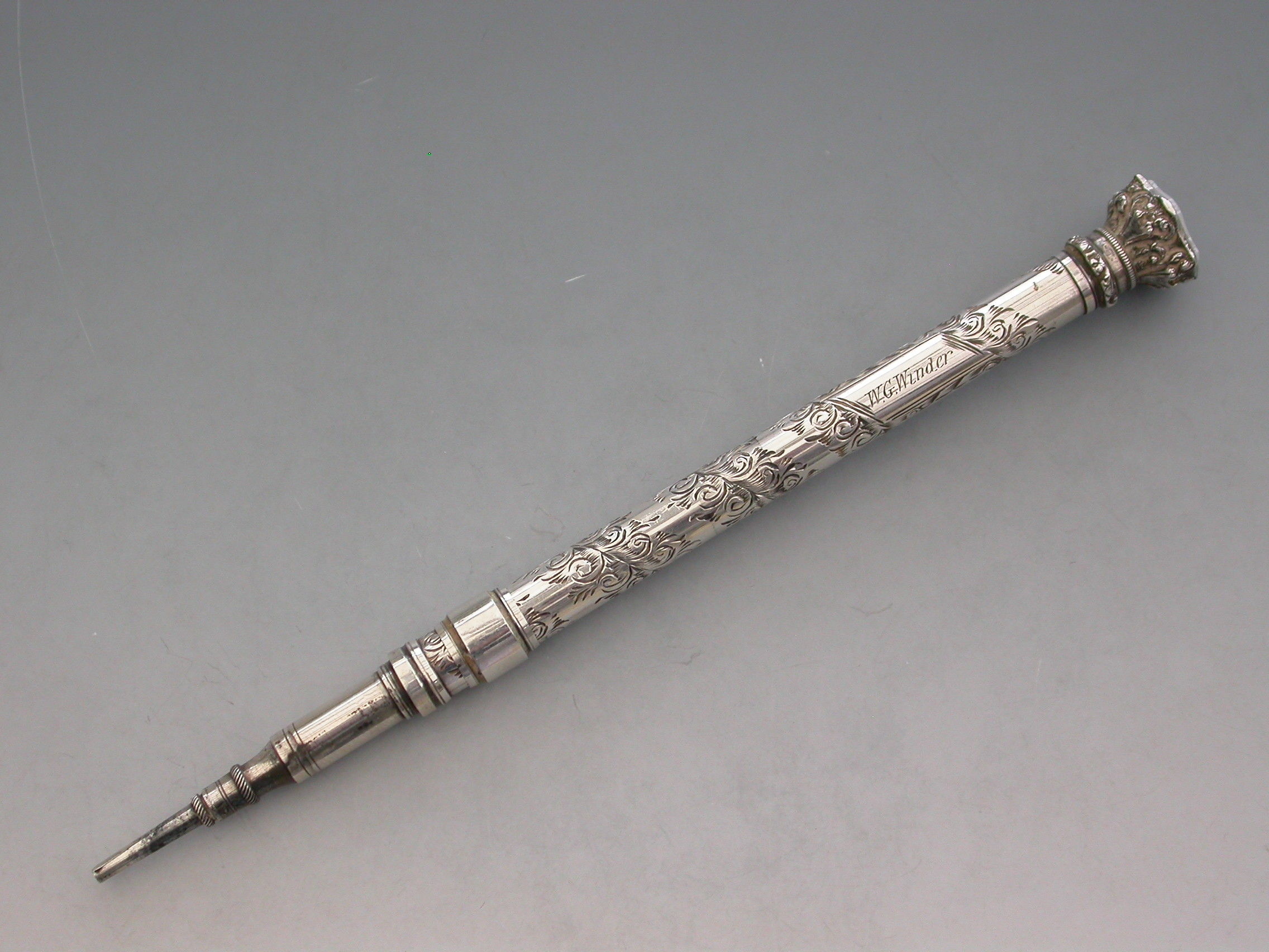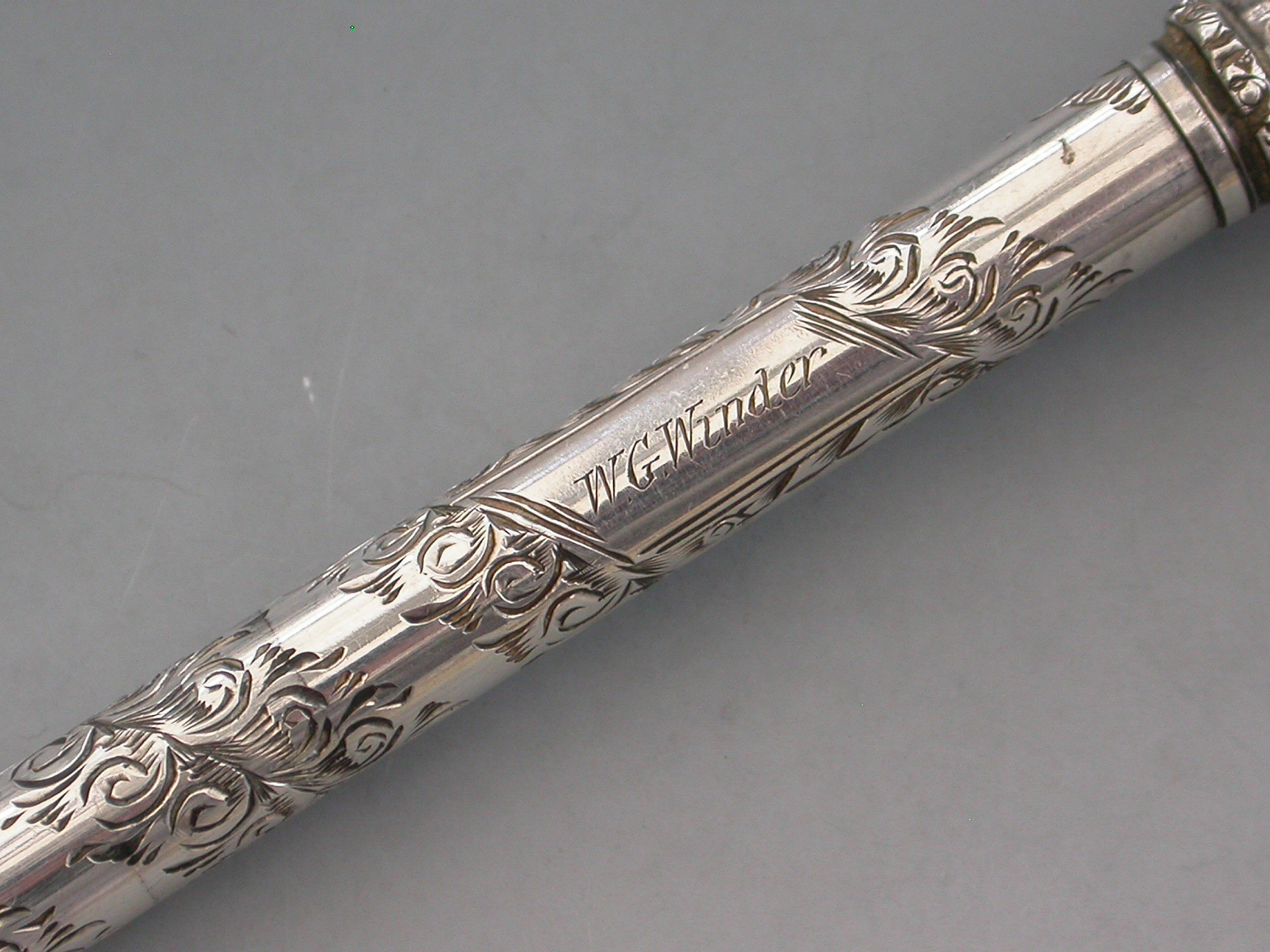A good quality Victorian silver sliding Propelling Pencil, the cylindrical body with hand engraved foliate decoration and a cartouche engraved 'W.G. Winder'. The cast chased finial set with a shield shaped white agate stone and unscrewing to reveal the lead reservoir.