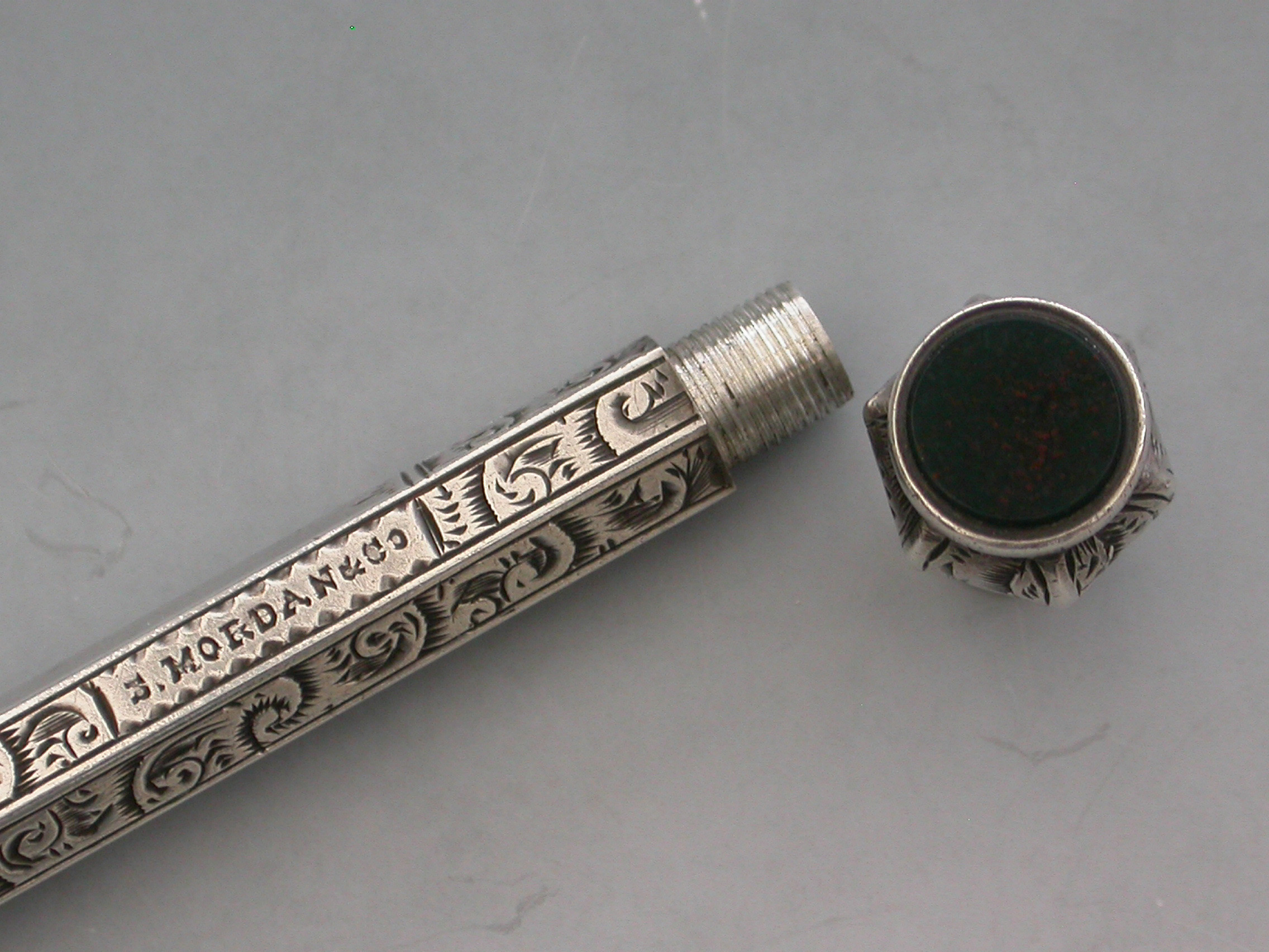 A good quality mid 19th century silver sliding Propelling Pencil, the hexagonal body with hand engraved scrolled decoration, the urn shaped finial set with a bloodstone and unscrewing to reveal the lead reservoir.