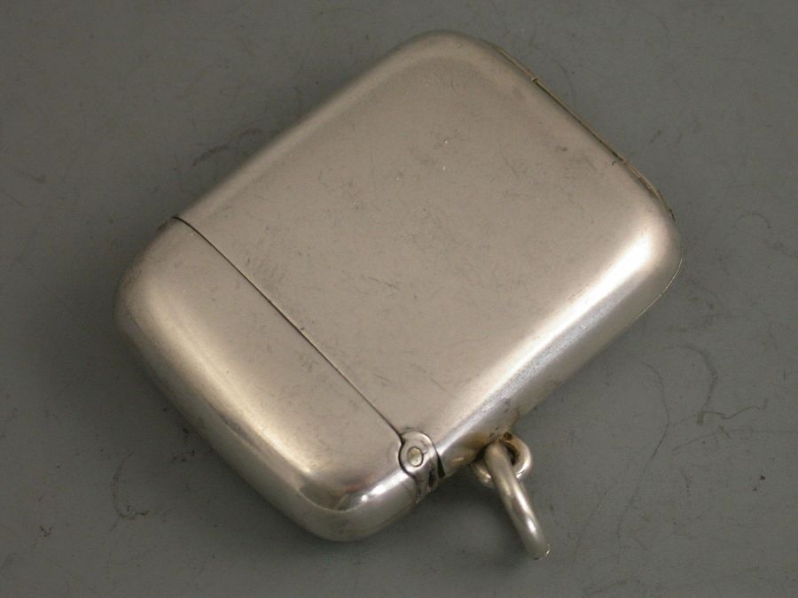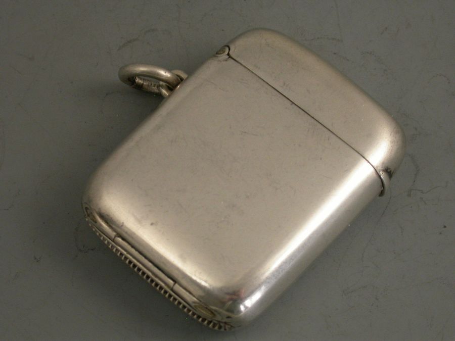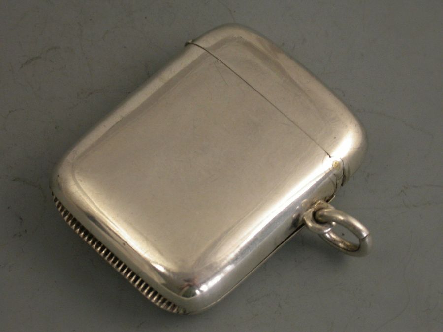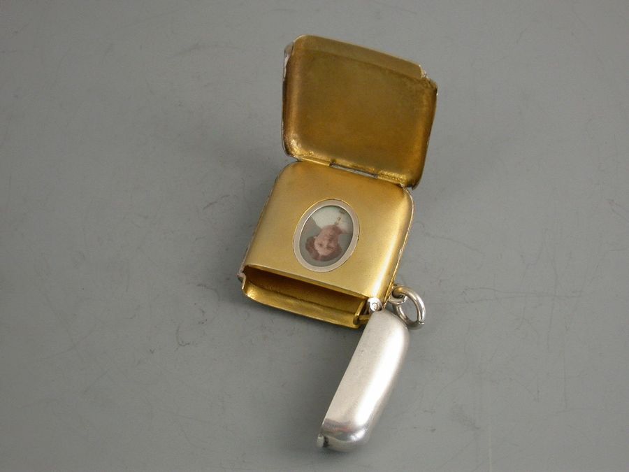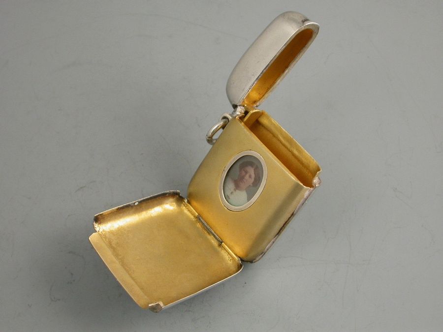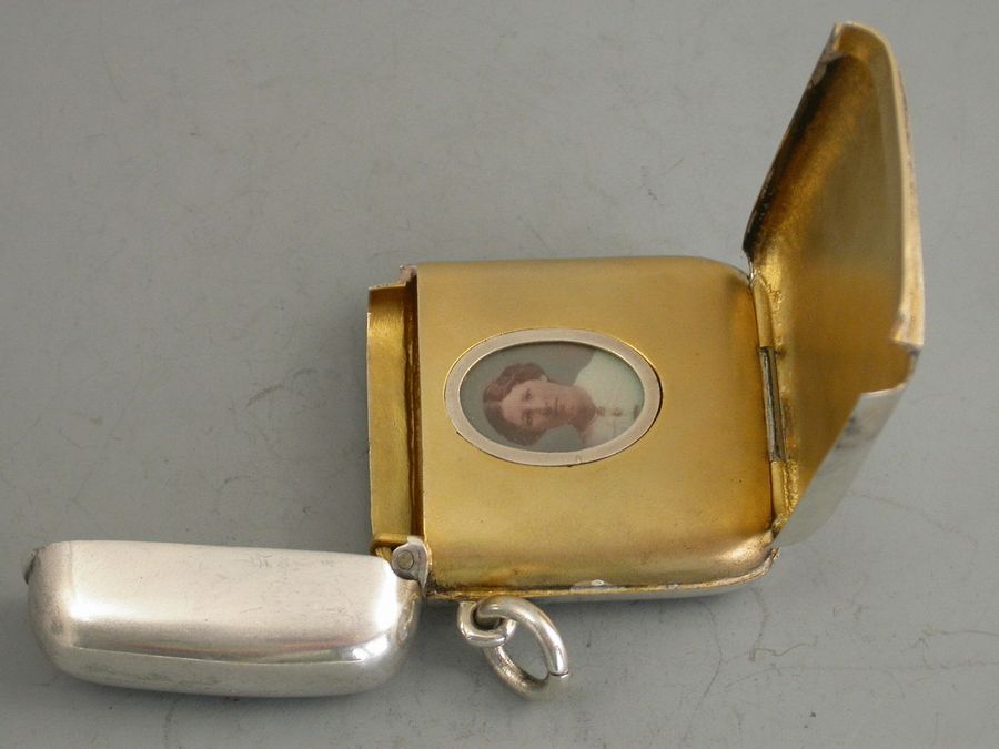 A good Victorian silver Vesta Case of plain rounded rectangular form with sprung hinged flip top lid and also a hinged cover opening to reveal a small oval photograph frame with a contemporary picture of a lady, silver gilt interior.
