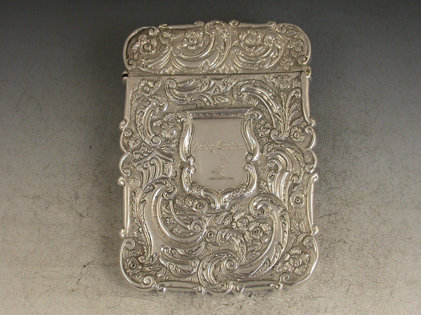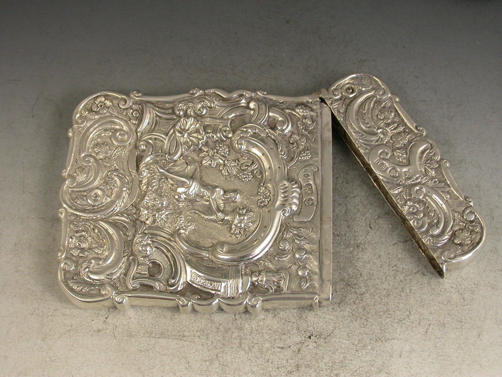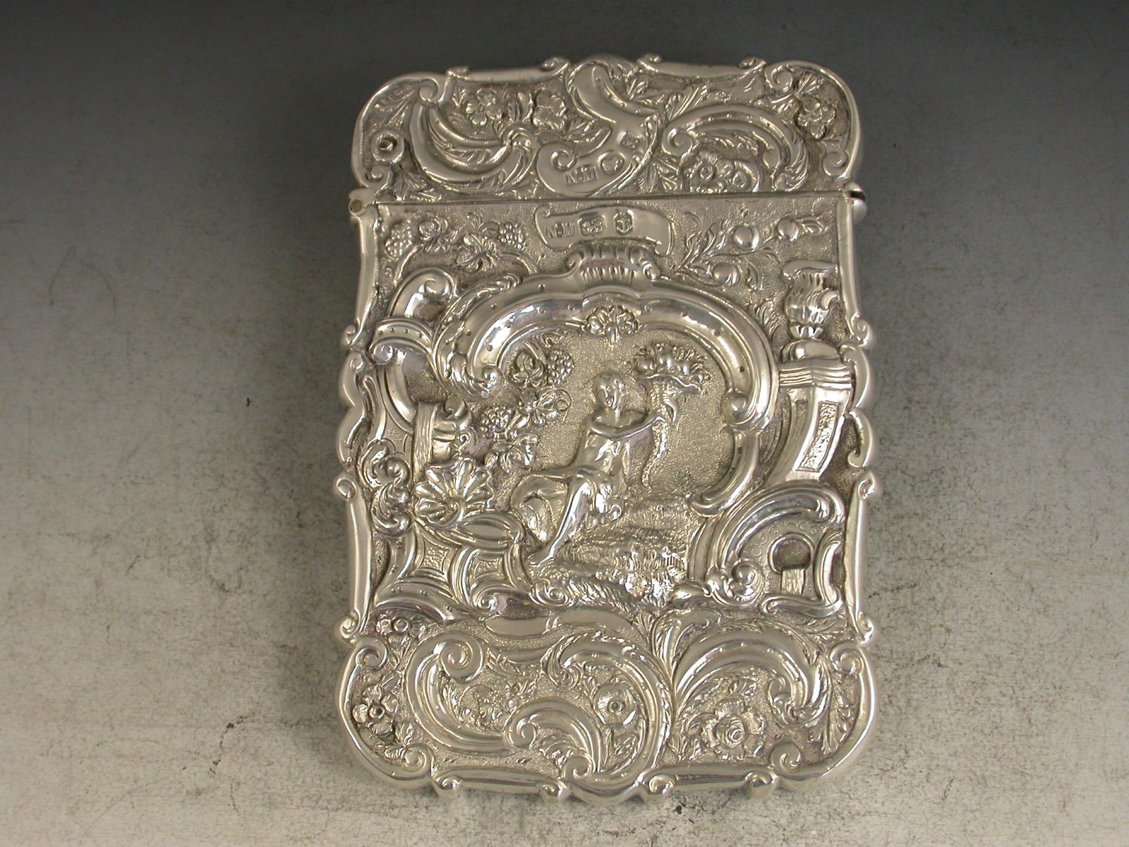 A rare Victorian silver Card Case chased in high relief with a scene depicting Ceres (Roman God of the Harvest), holding an overflowing cornucopia surrounded by stylised columns, scrolls, fruiting vines and flower heads, the reverse with a shield shape cartouche engraved with a crest below the inscription 'Araby Garden'.
