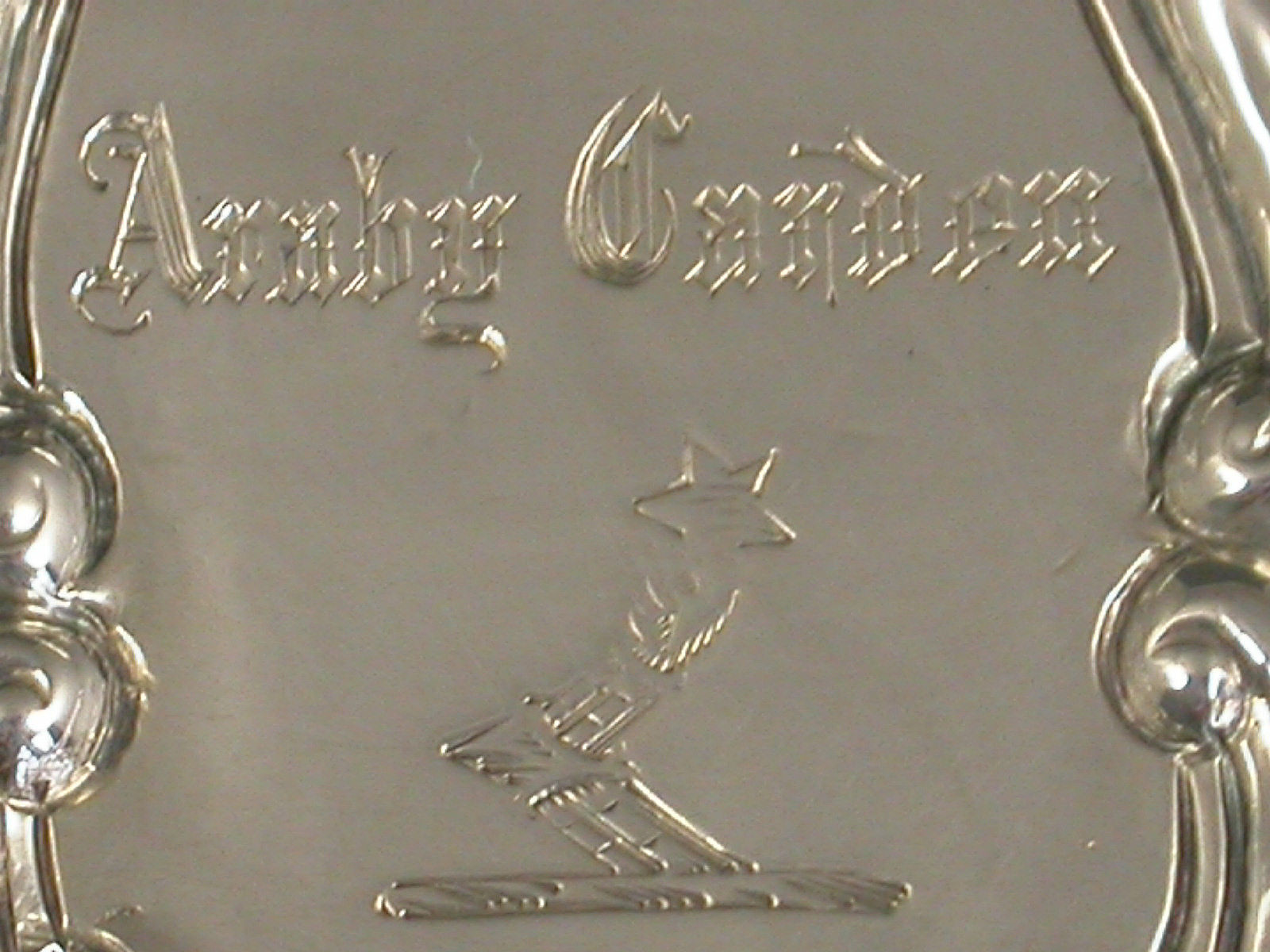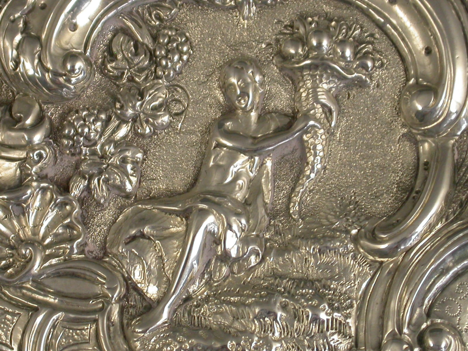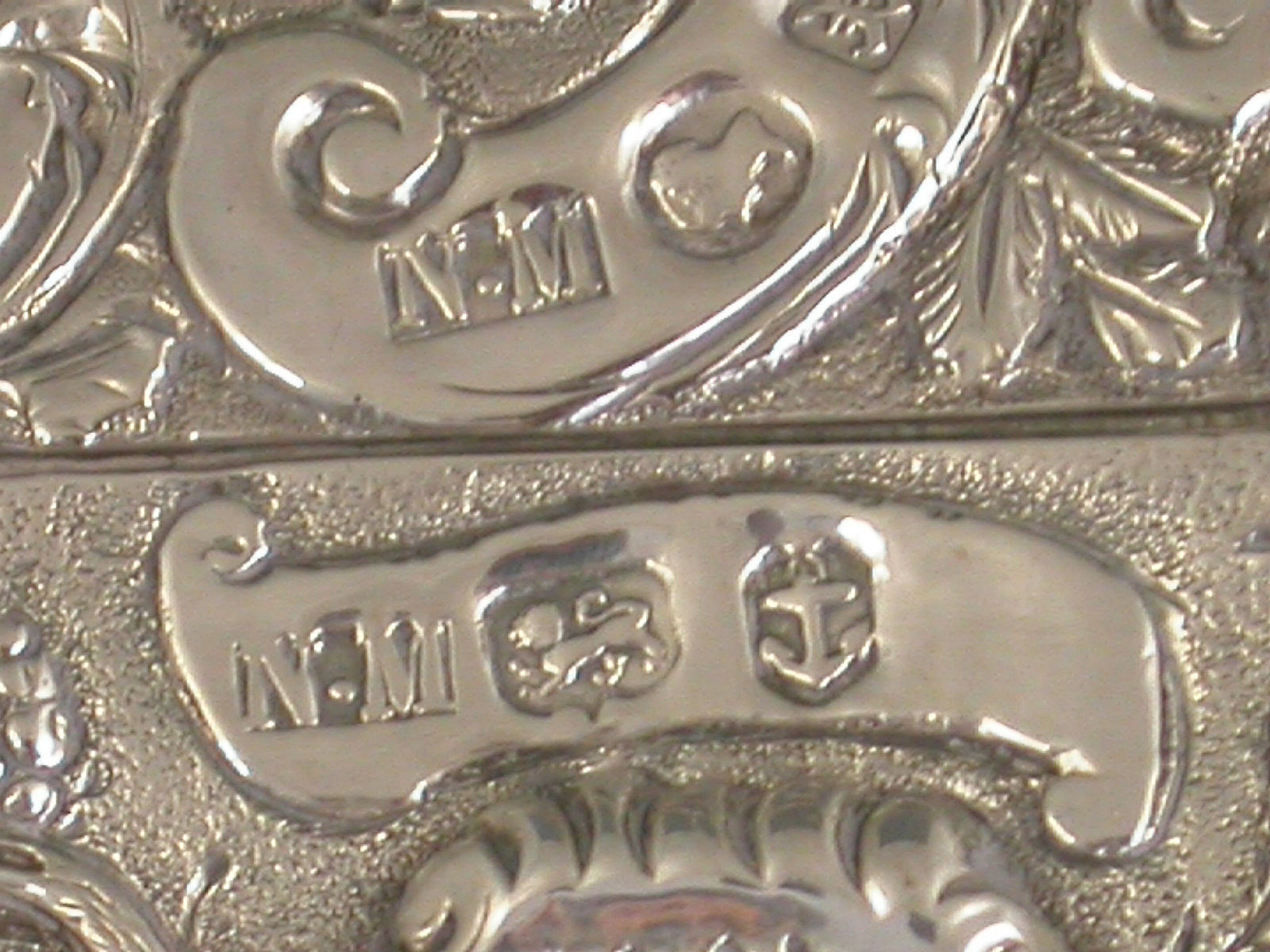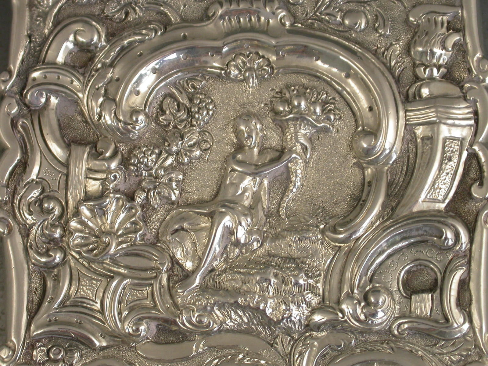 A rare Victorian silver Card Case chased in high relief with a scene depicting Ceres (Roman God of the Harvest), holding an overflowing cornucopia surrounded by stylised columns, scrolls, fruiting vines and flower heads, the reverse with a shield shape cartouche engraved with a crest below the inscription 'Araby Garden'.