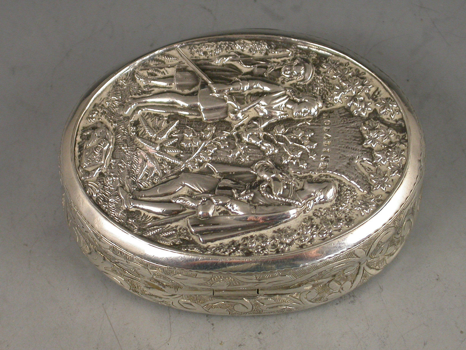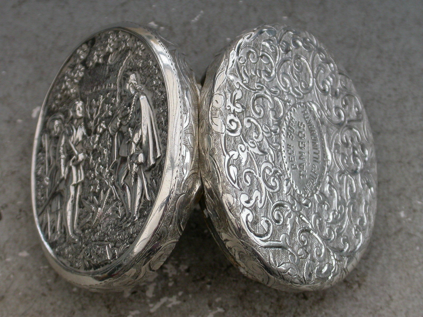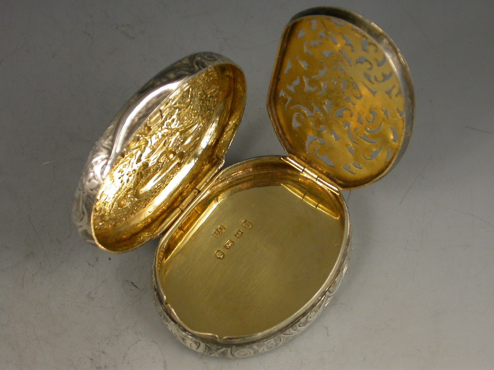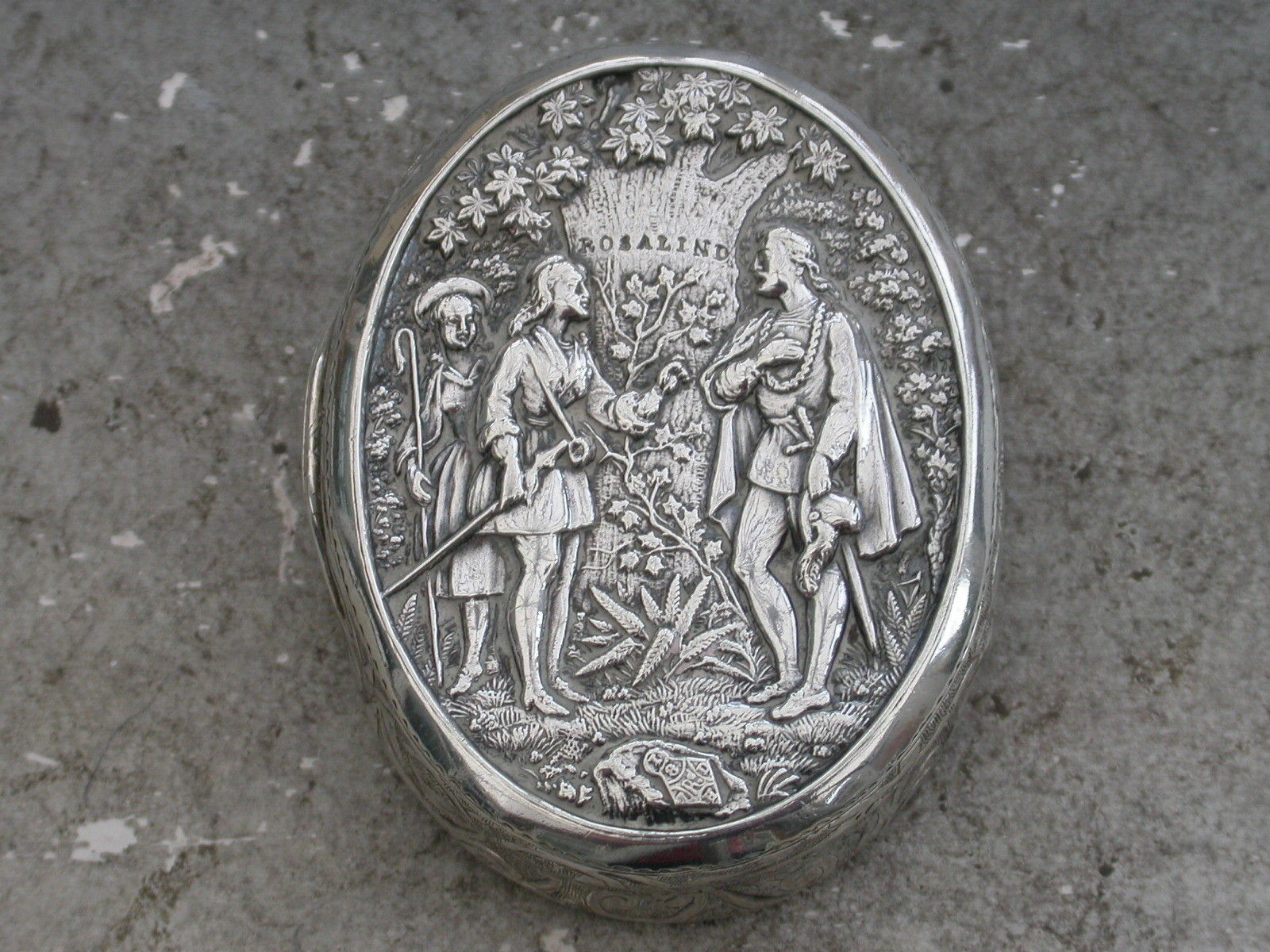 A rare Victorian silver Vinaigrette with theatrical interest, of compressed oval form with foliate scroll engraved decoration to the base and sides, the lid inset with a panel depicting a scene from Shakespeare's ""As you like it"" in high relief. The silver gilt interior with foliate scroll pierced grille. The base with an oval cartouche engraved with presentation inscription to Mrs Alfred Illingworth.