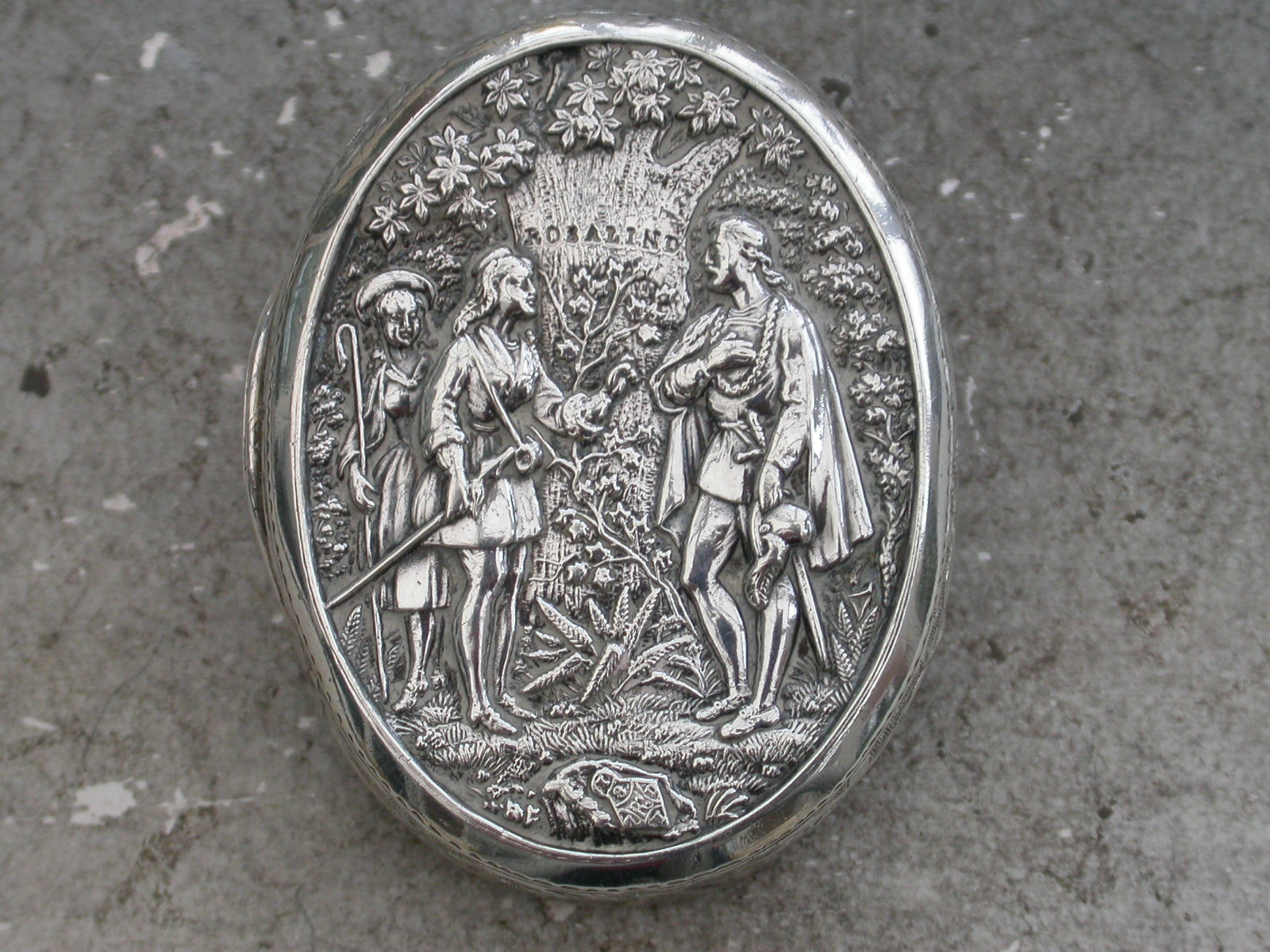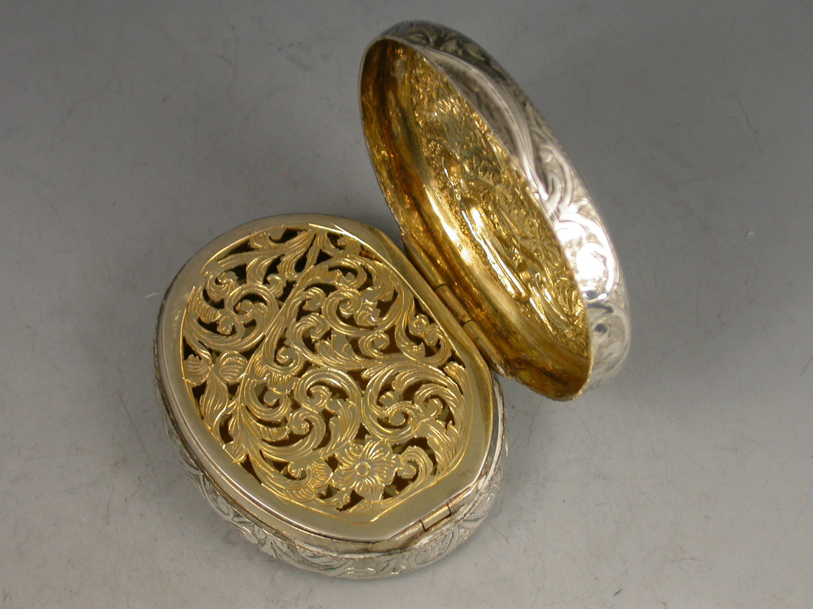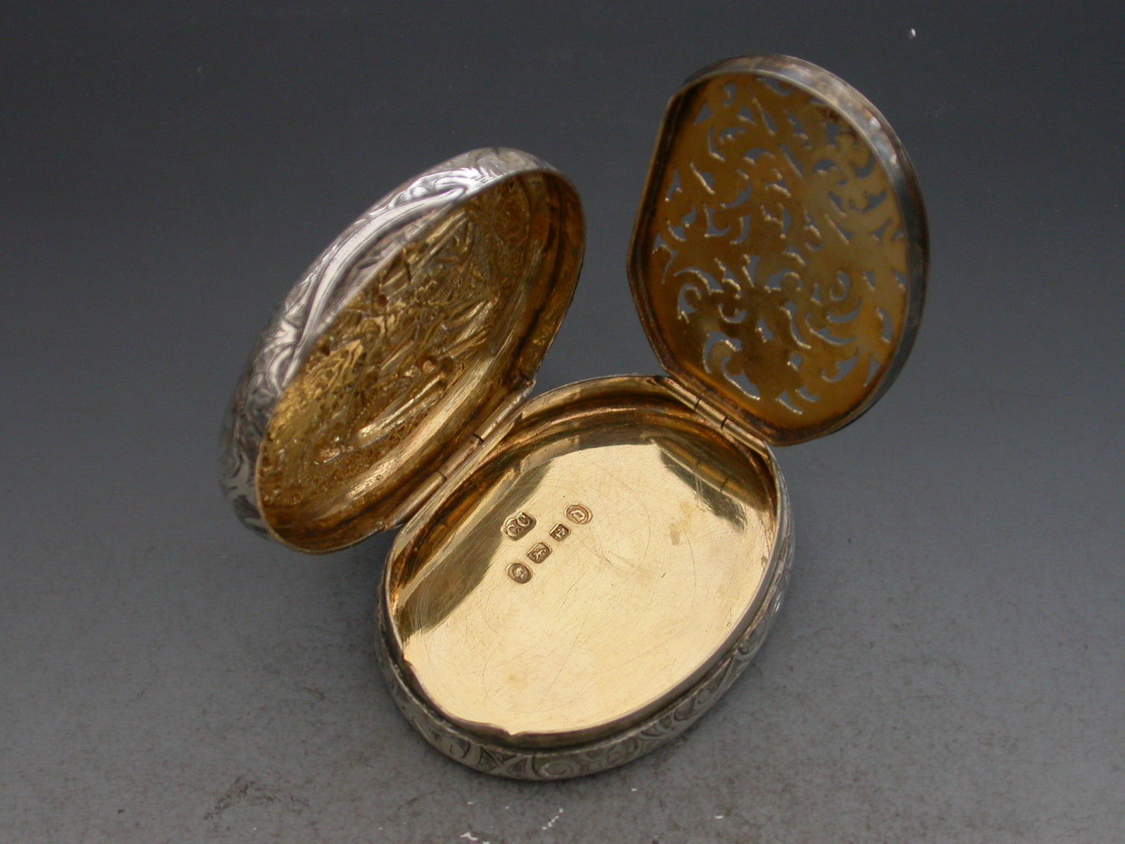 A rare Victorian silver Vinaigrette with theatrical interest, of compressed oval form with foliate scroll engraved decoration to the base and sides, the lid inset with a panel depicting a scene from Shakespeare's ""As you like it"" in high relief. The silver gilt interior with foliate scroll pierced grille. The base with an oval cartouche engraved with presentation inscription to Mrs Alfred Illingworth.