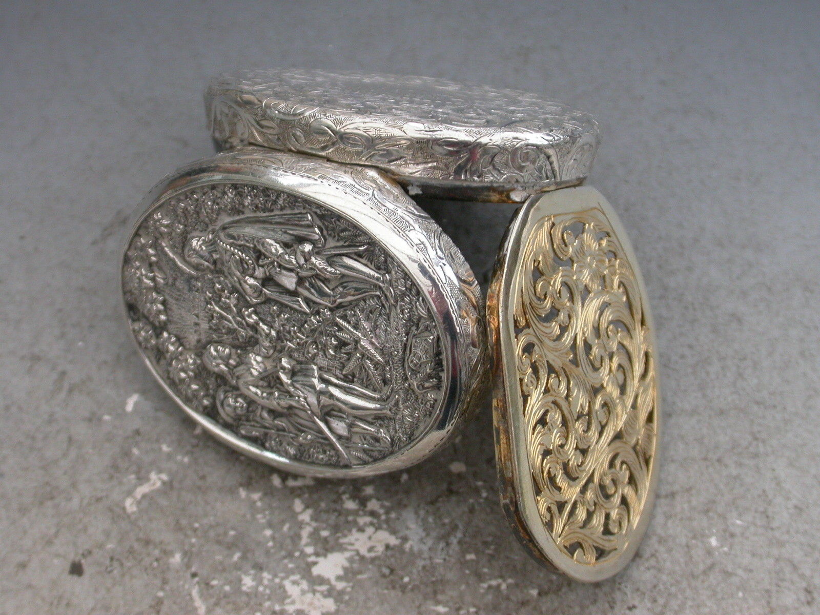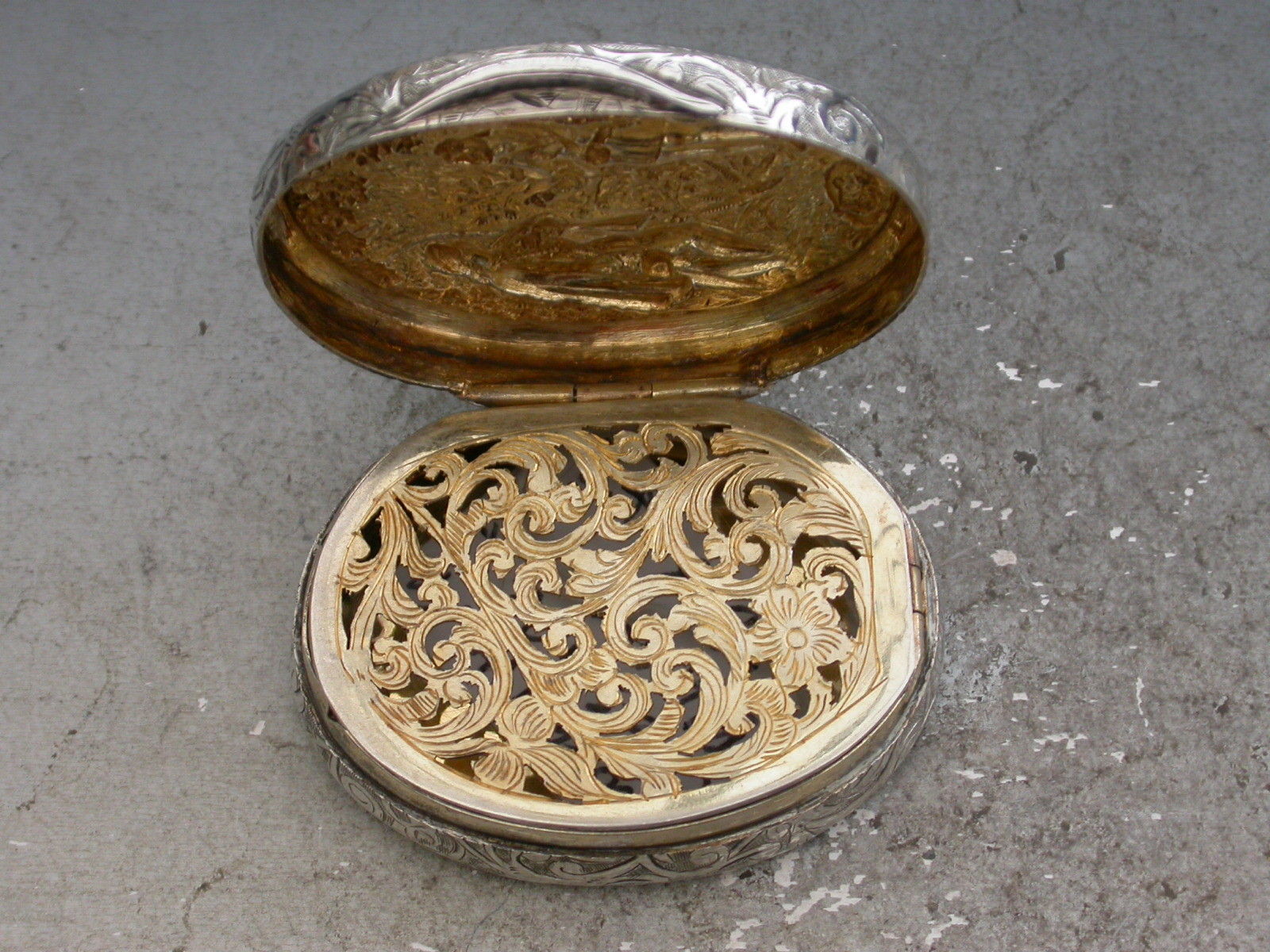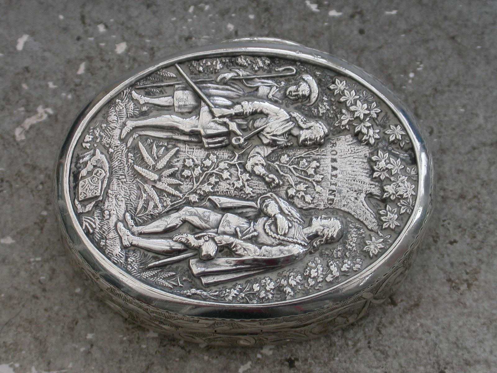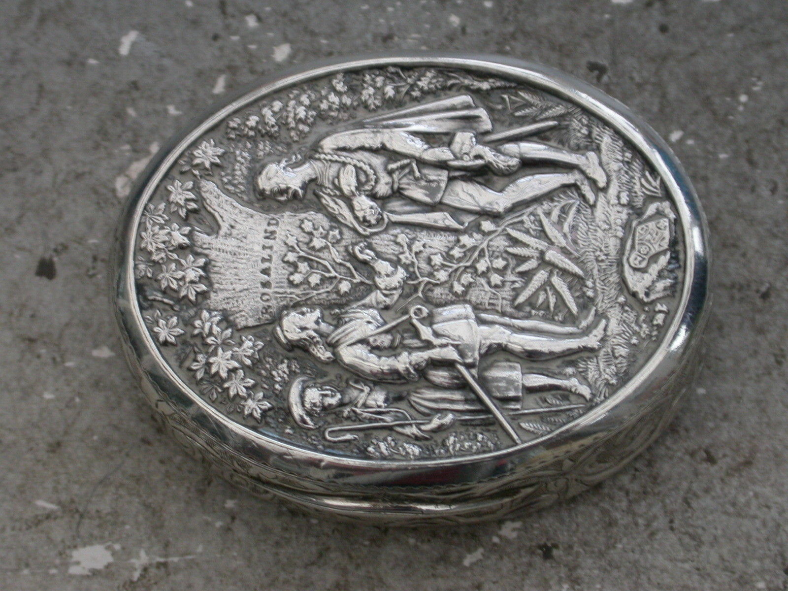 A rare Victorian silver Vinaigrette with theatrical interest, of compressed oval form with foliate scroll engraved decoration to the base and sides, the lid inset with a panel depicting a scene from Shakespeare's ""As you like it"" in high relief. The silver gilt interior with foliate scroll pierced grille. The base with an oval cartouche engraved with presentation inscription to Mrs Alfred Illingworth.