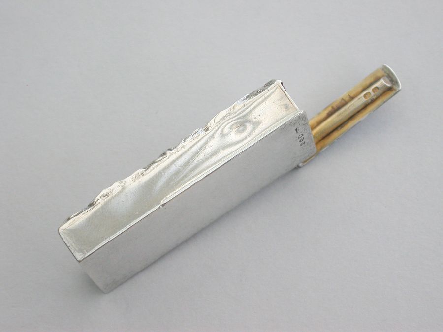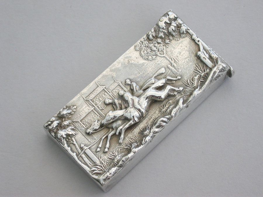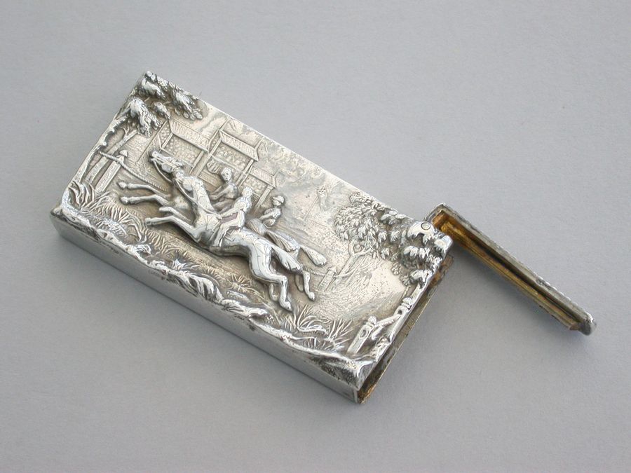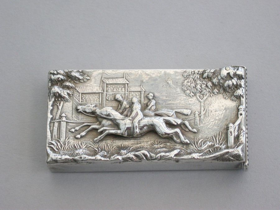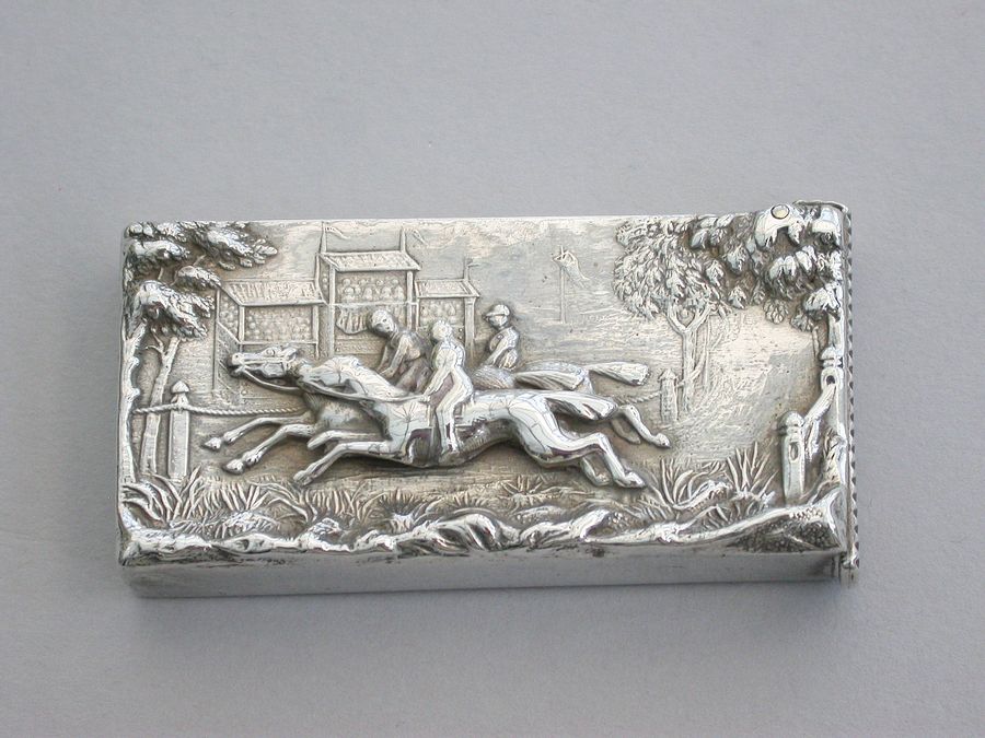 A good Victorian silver Vesta Case with hinged flip-top lid and striker, the face with raised scene depicting three horses and jockeys racing past a grandstand. Silver gilt interior.