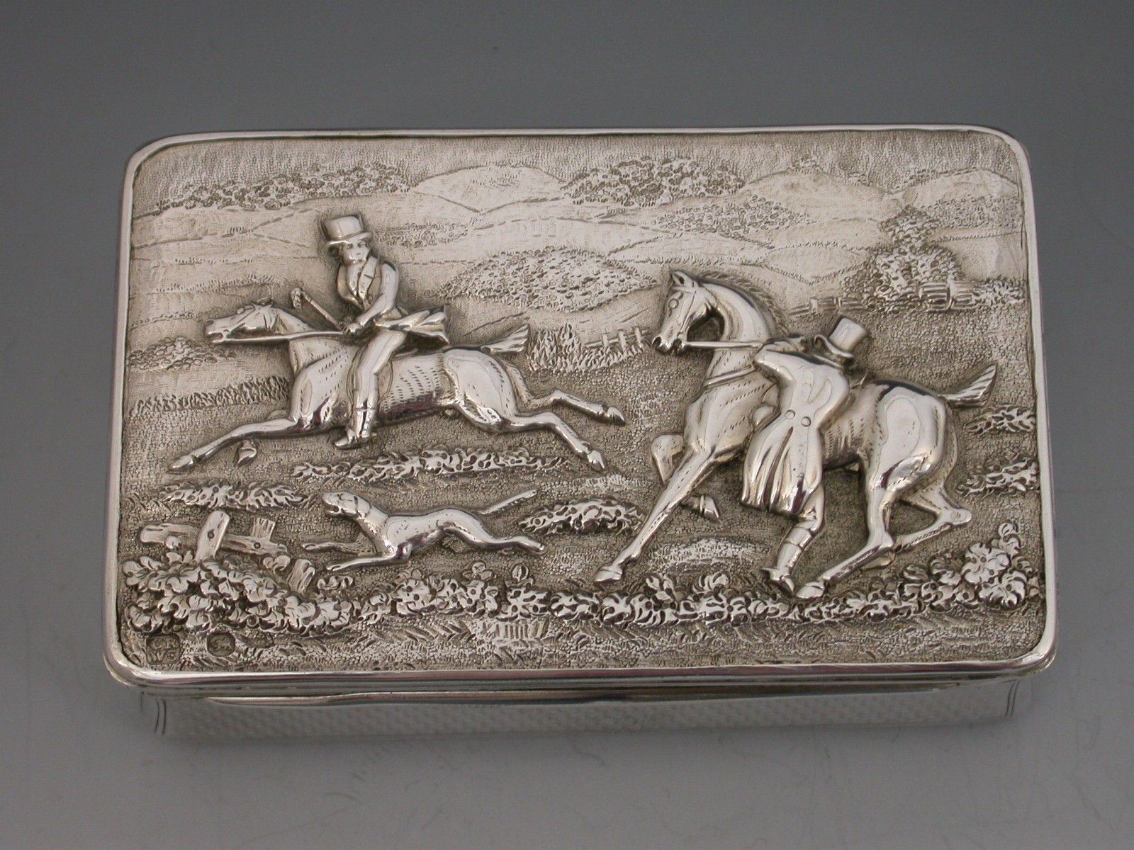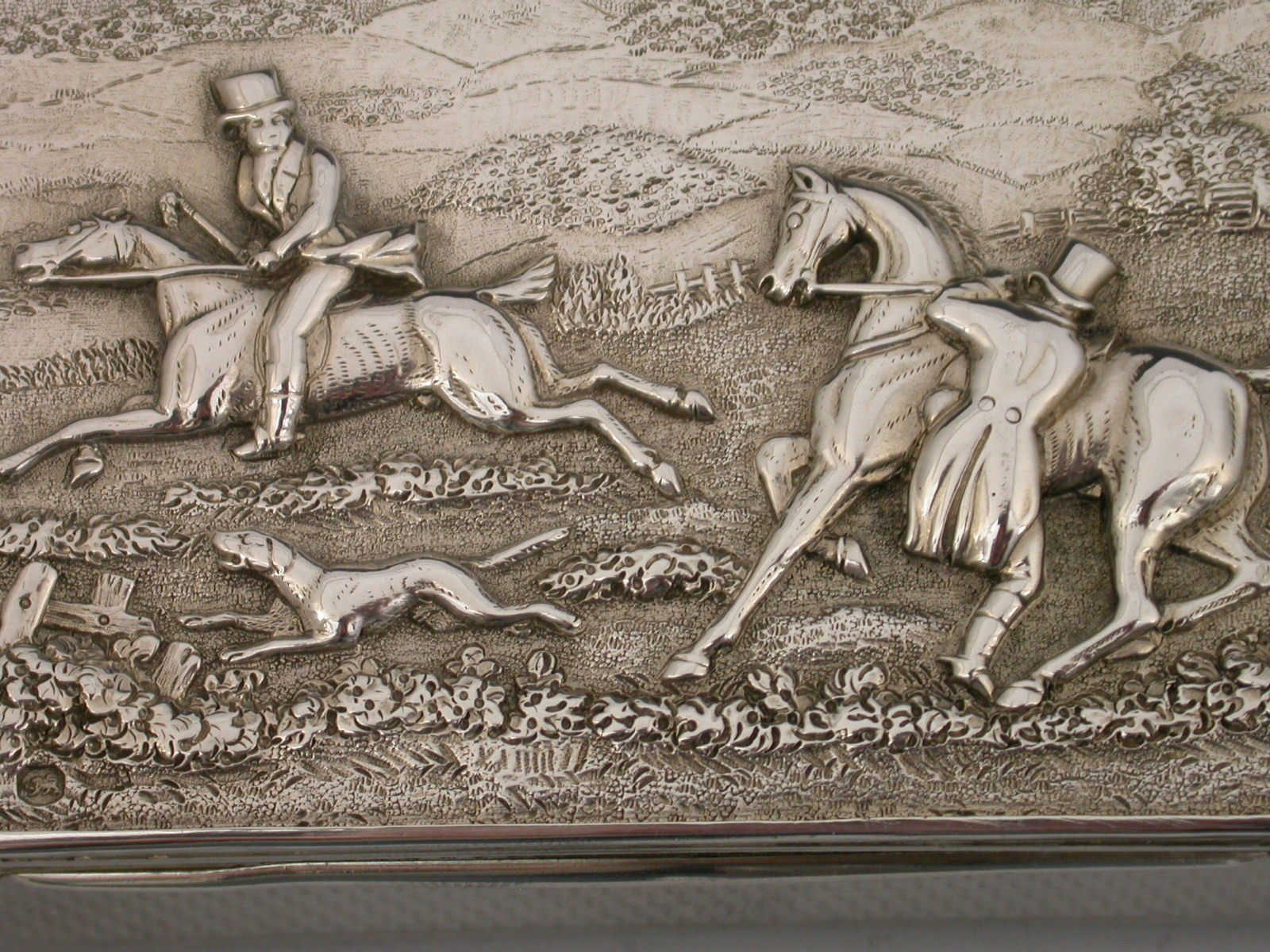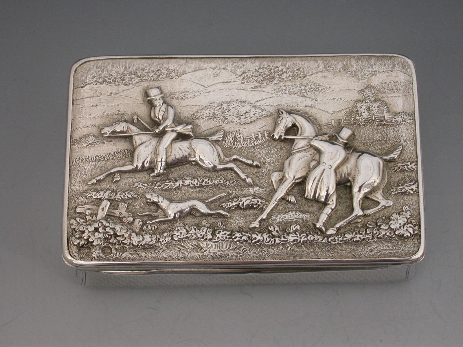 A good quality Victorian silver Snuff Box of compressed rectangular form with engine turned decoration to the base and sides, the lid inset with a hallmarked raised high relief panel depicting a hunting scene with two huntsman, horses and hounds in a landscape scene, silver gilt interior.