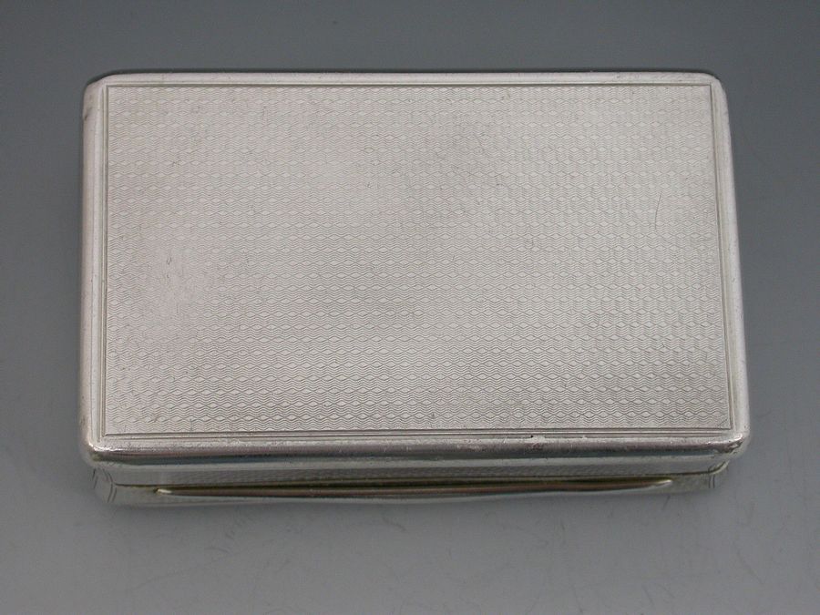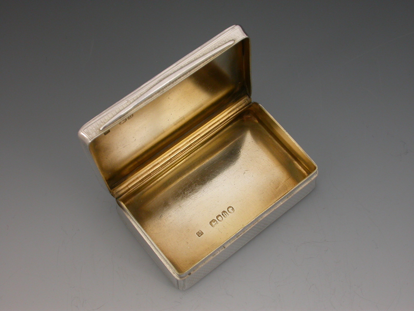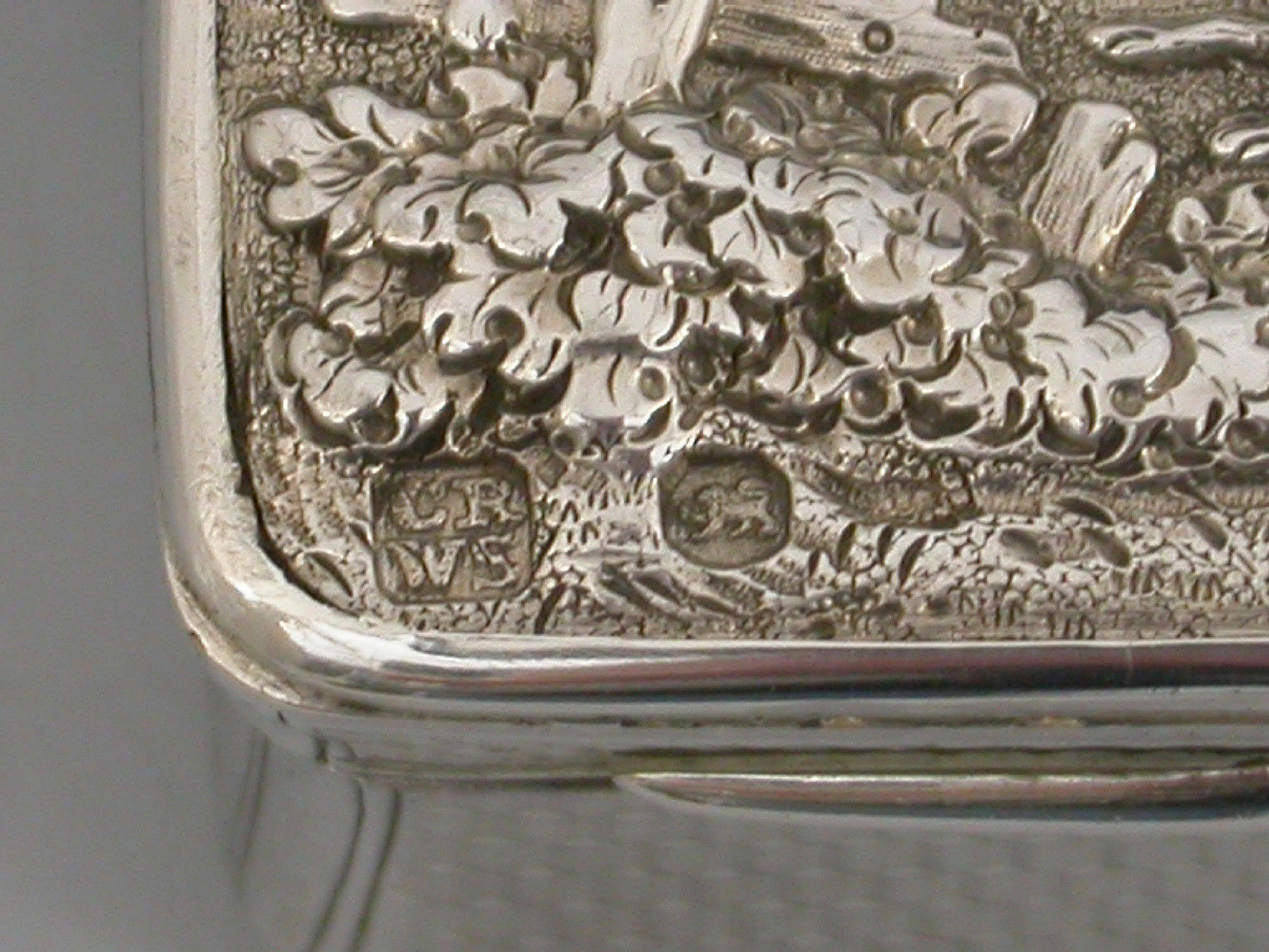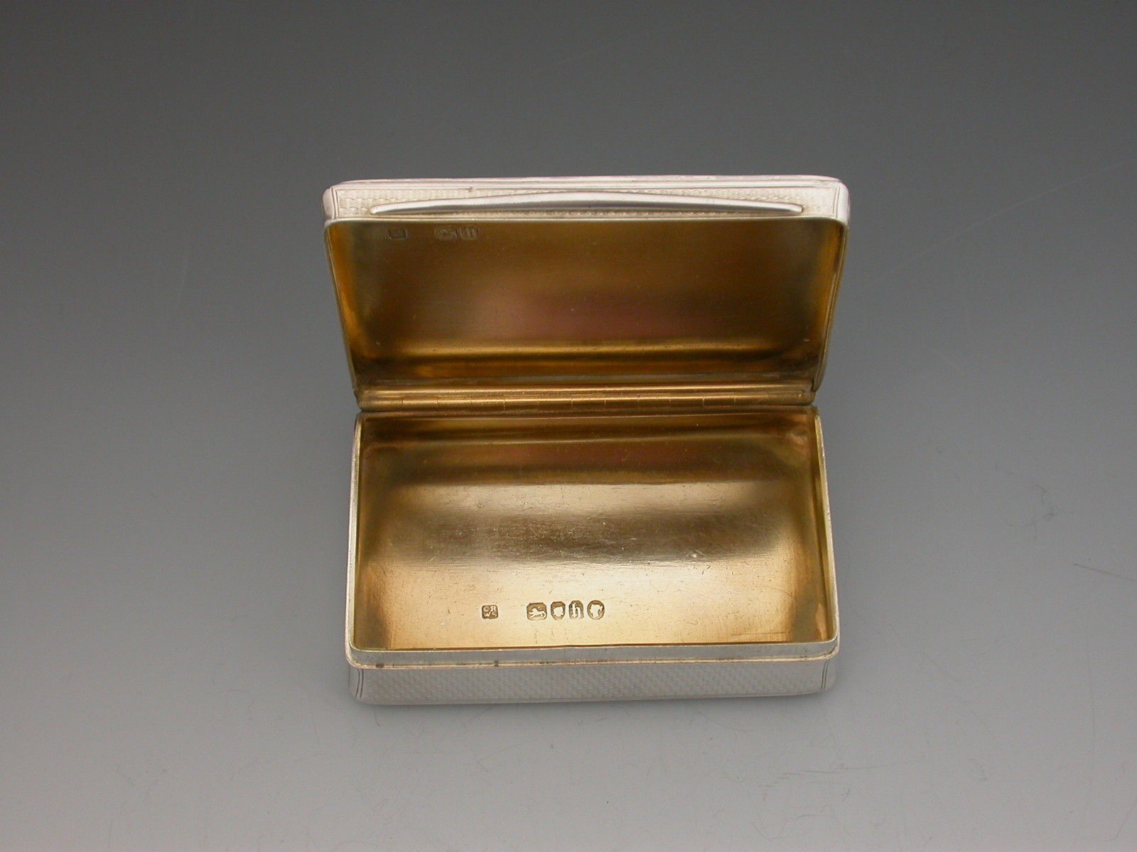 A good quality Victorian silver Snuff Box of compressed rectangular form with engine turned decoration to the base and sides, the lid inset with a hallmarked raised high relief panel depicting a hunting scene with two huntsman, horses and hounds in a landscape scene, silver gilt interior.