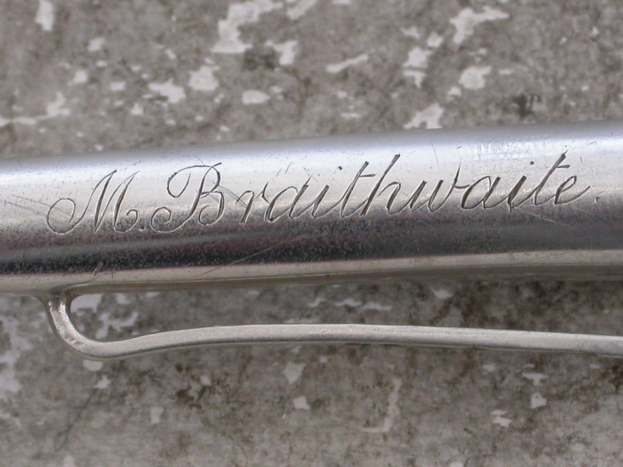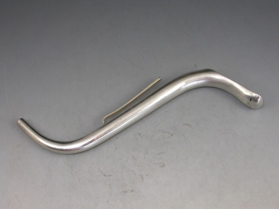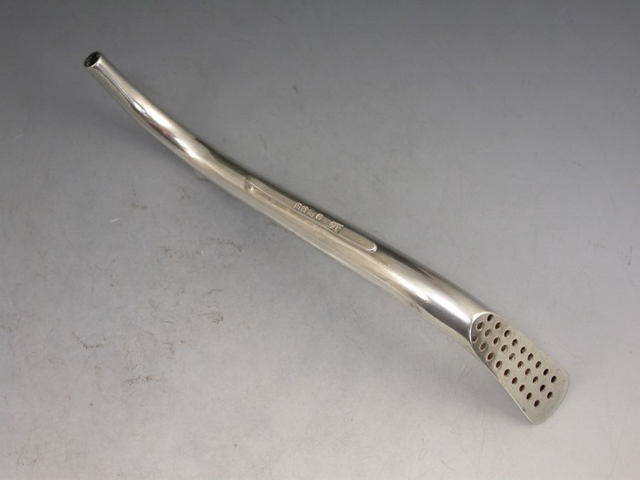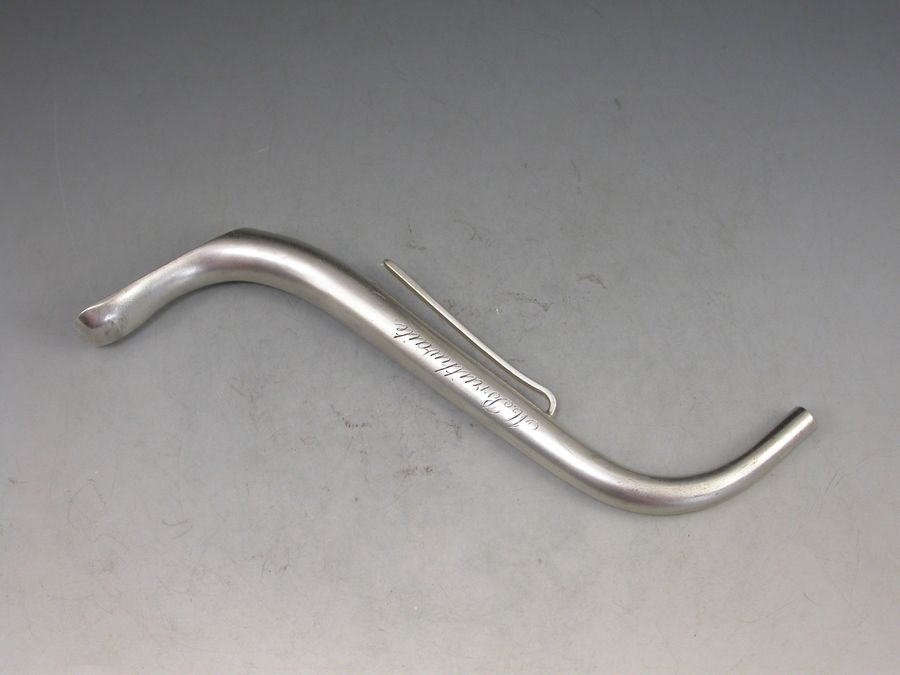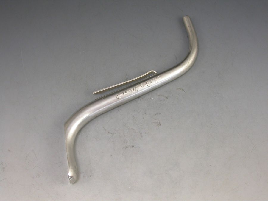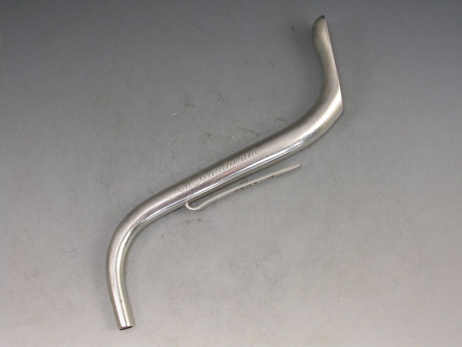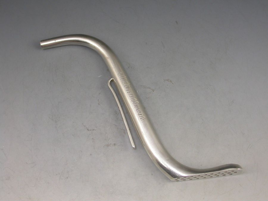 A rare Victorian silver Invalid's Feeding Tube or Straw of curved 's' shape with pierced filter to base and attached side clip. The body engraved ""M Braithwaite"".