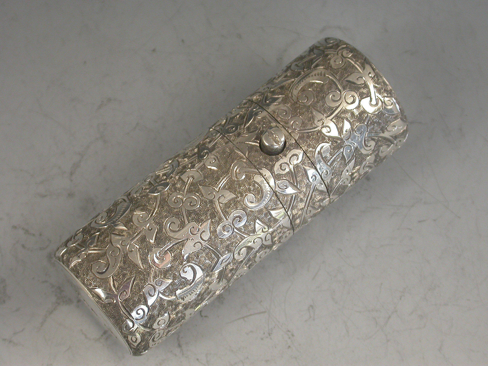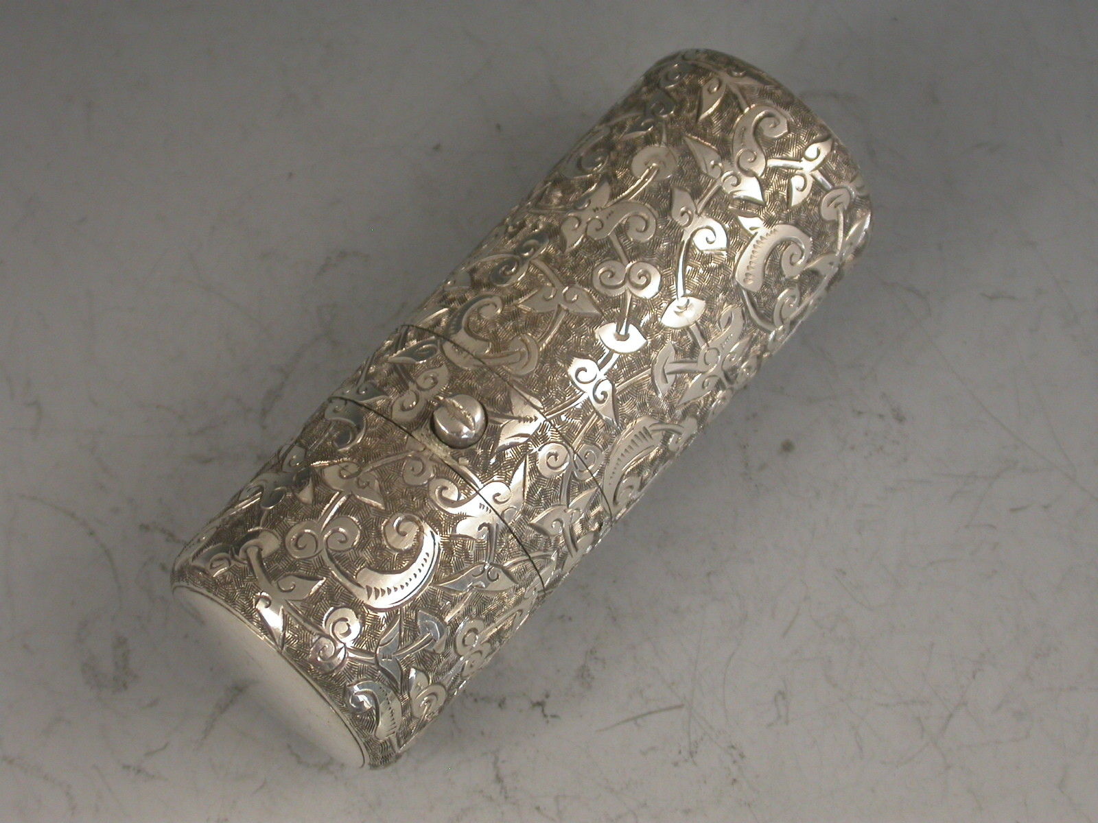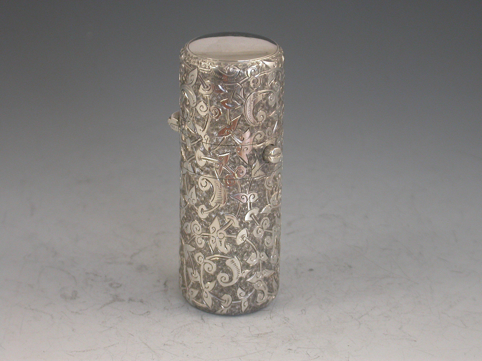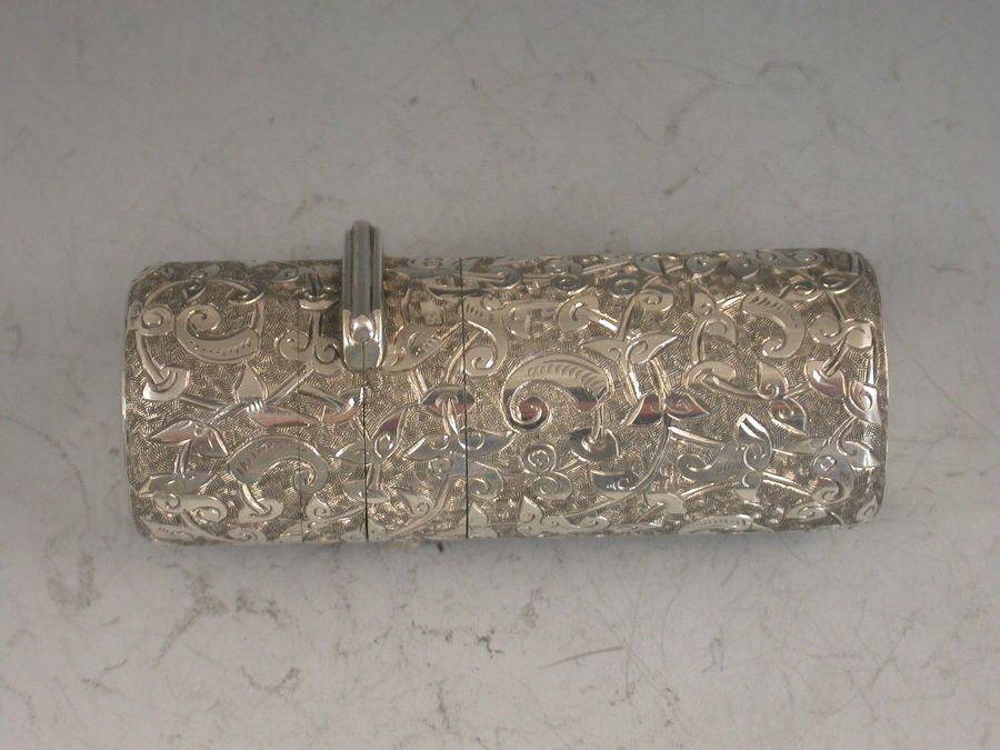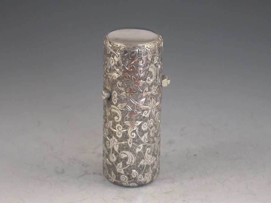 A good Victorian silver Scent Bottle of cylindrical form, the sprung hinged lid with push button opening mechanism, the body with deep crisply engraved foliate scroll decoration.