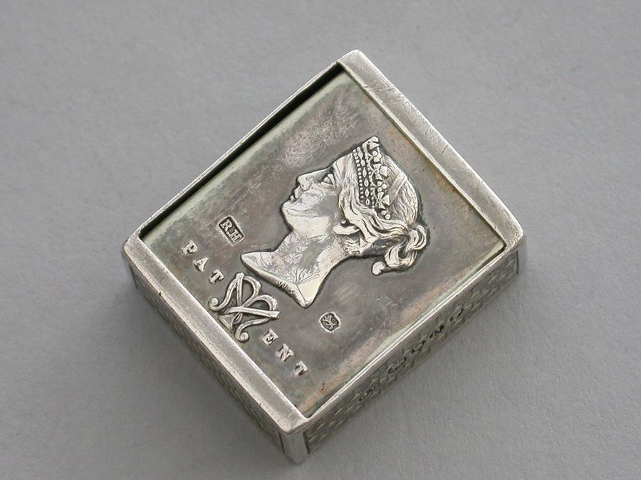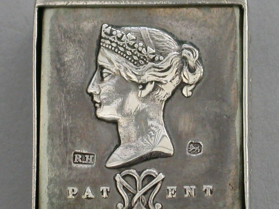 An extremely rare and early Victorian silver ""MacNeills Patent Stamp Applicator"",the rectangular silver box embossed with a profile bust of Queen Victoria, the word 'Patent' and a monogram 'M' for MacNeill. The sides decorated with engine turned decoration.