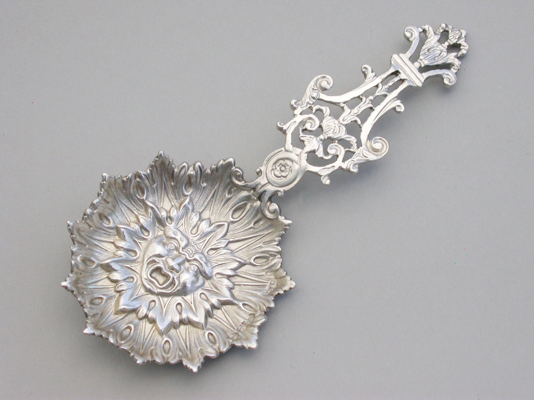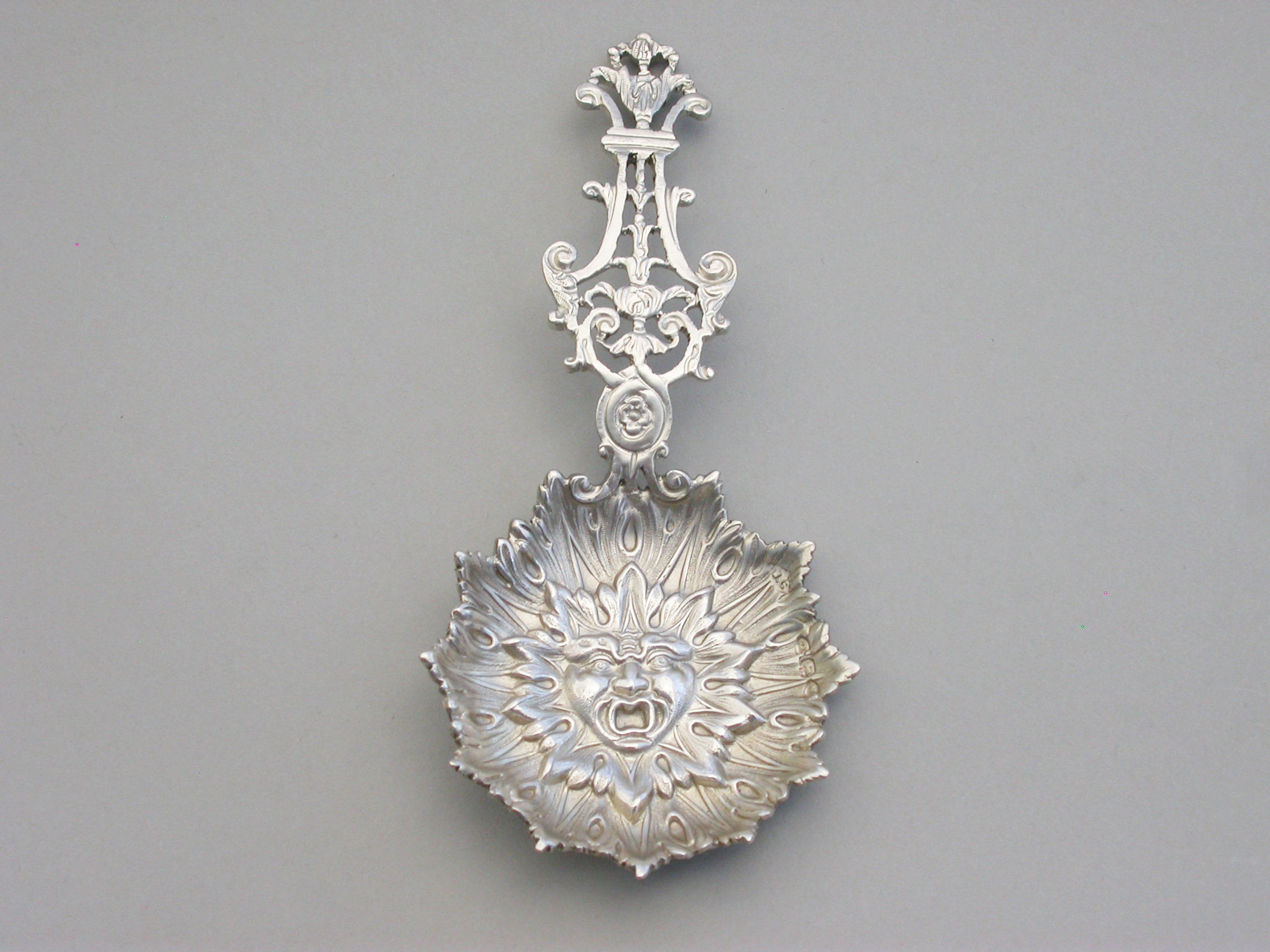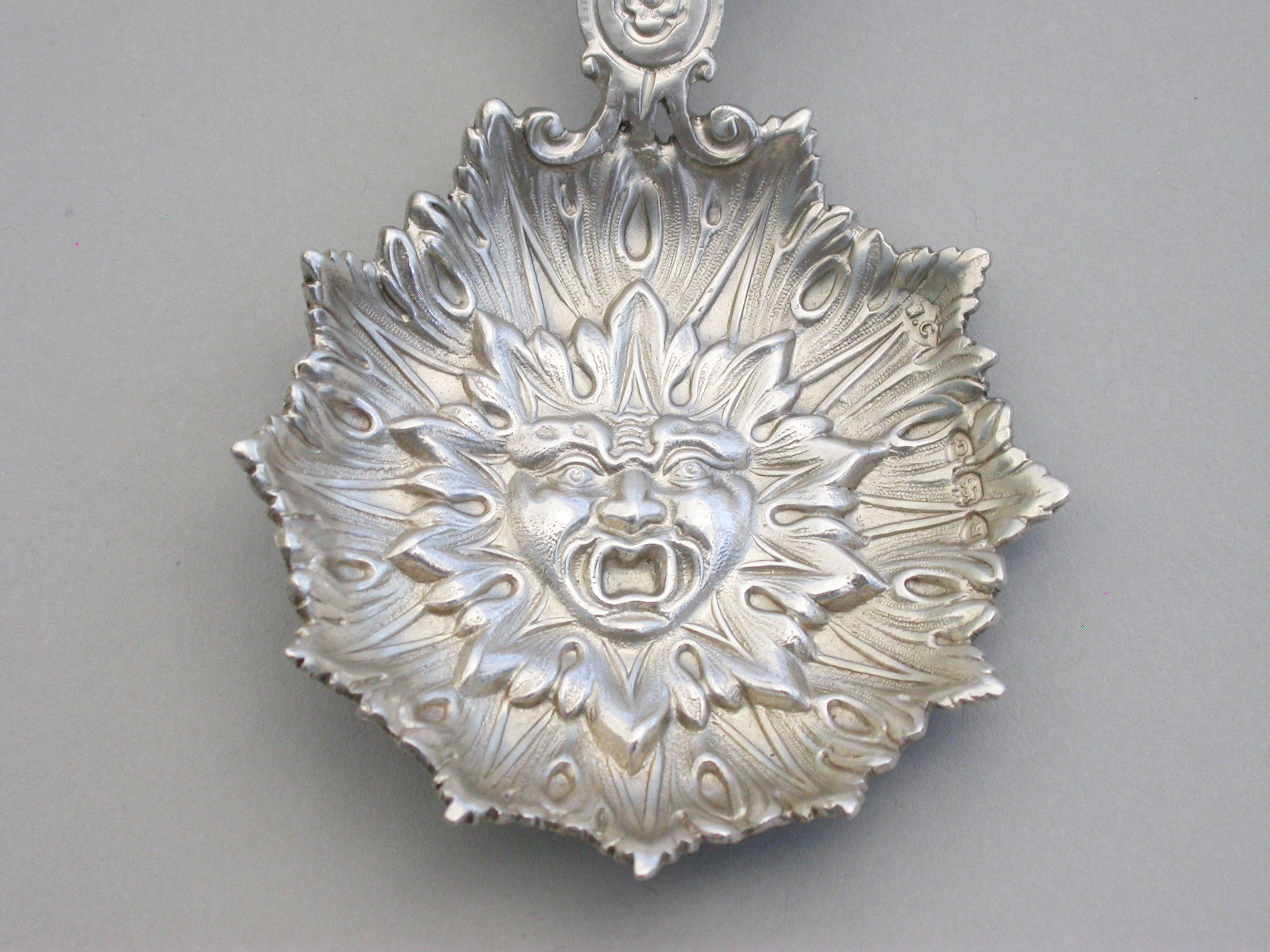 A rare late Victorian silver Caddy Spoon with cast and pierced architectural handle, the die-stamped bowl with central grotesque mask head amongst acanthus leaves shaped in the form of a sun burst.