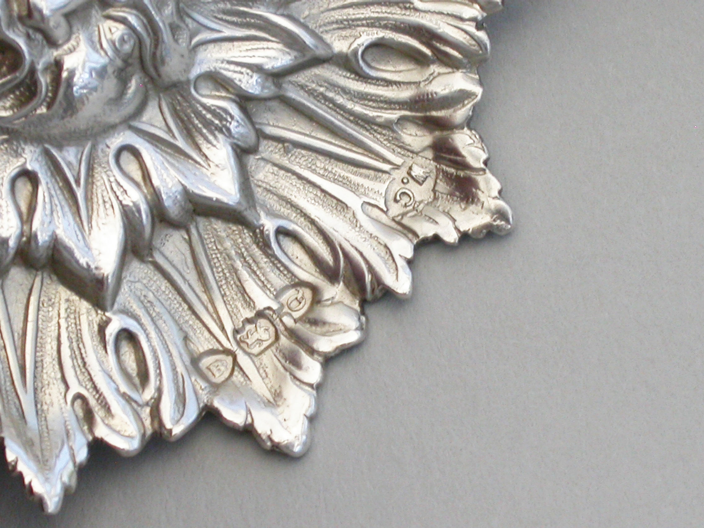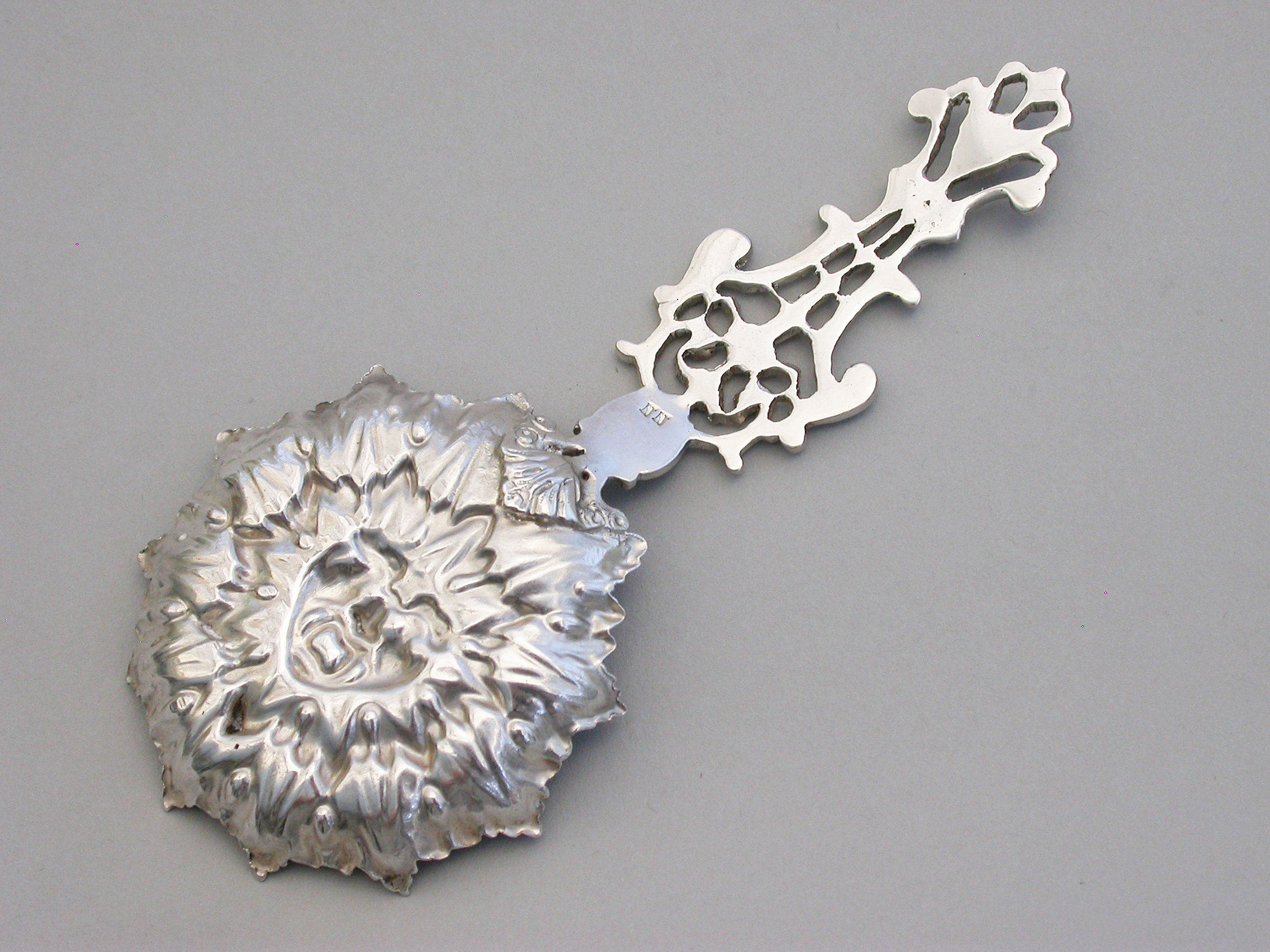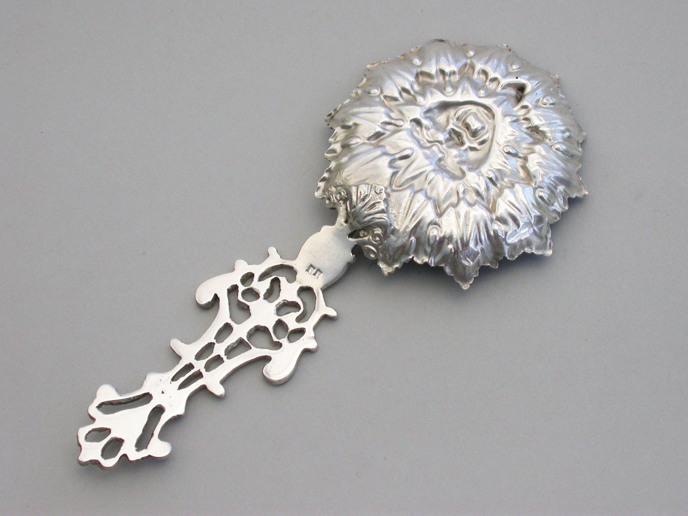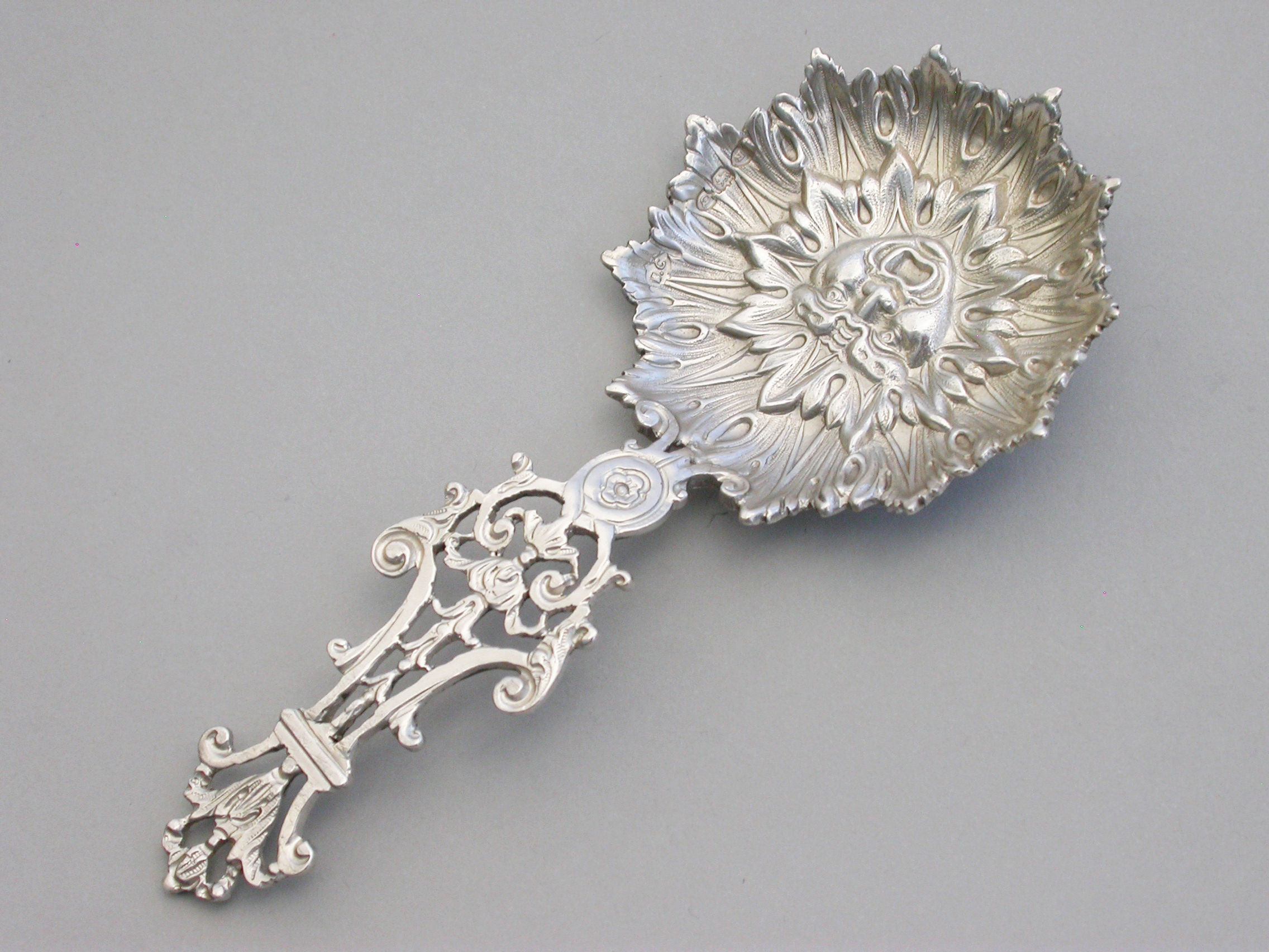 A rare late Victorian silver Caddy Spoon with cast and pierced architectural handle, the die-stamped bowl with central grotesque mask head amongst acanthus leaves shaped in the form of a sun burst.