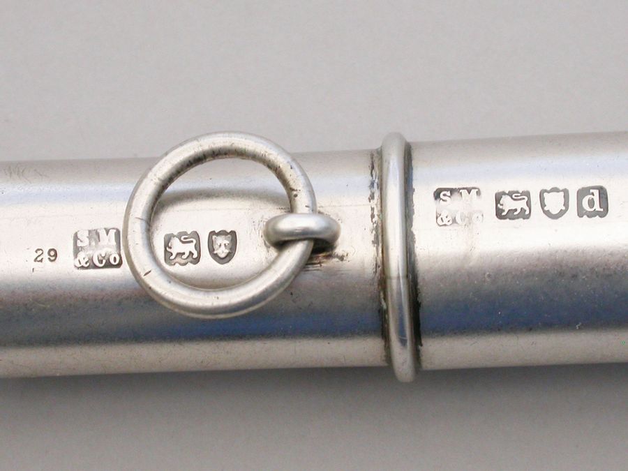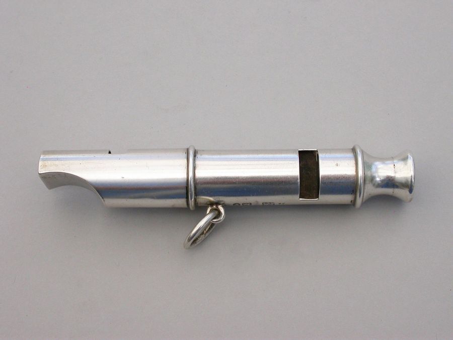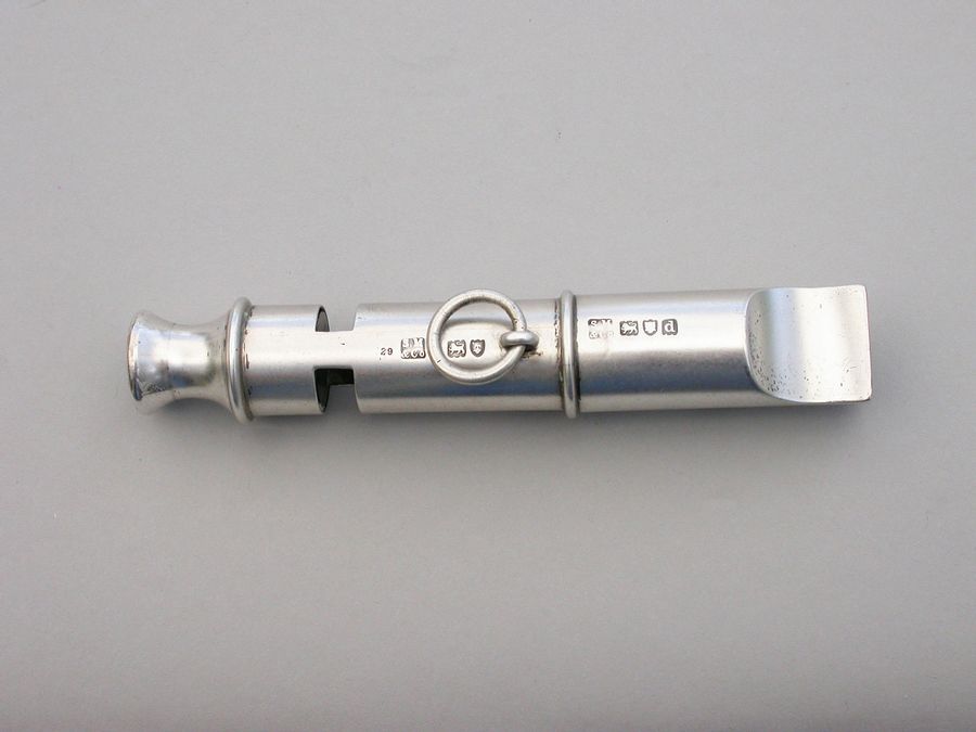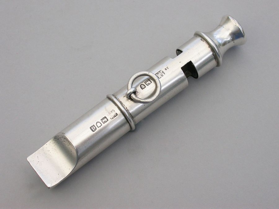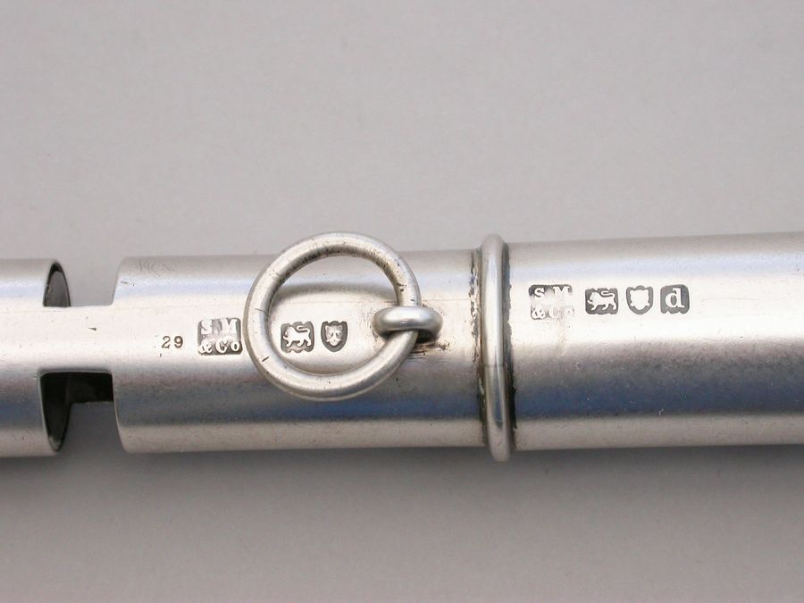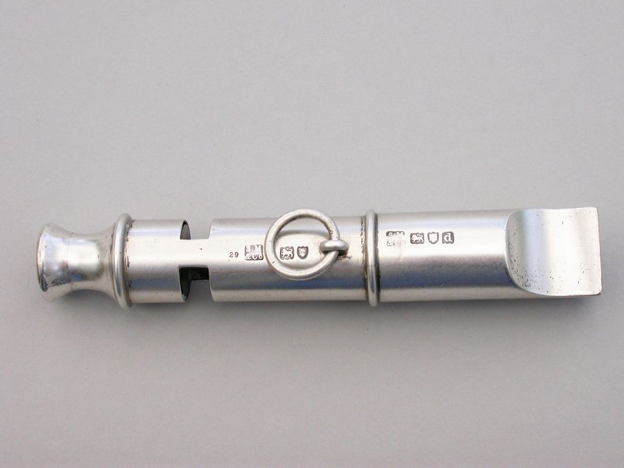A rare late Victorian double ended silver Police Whistle with attached chain ring. A copy of the 'Metropolitan' Police Whistle designed and patented by J Hudson & Co, of 13 Barr Street, Birmingham.