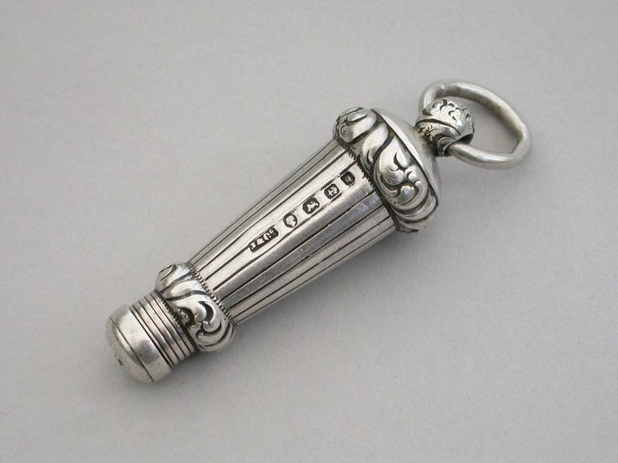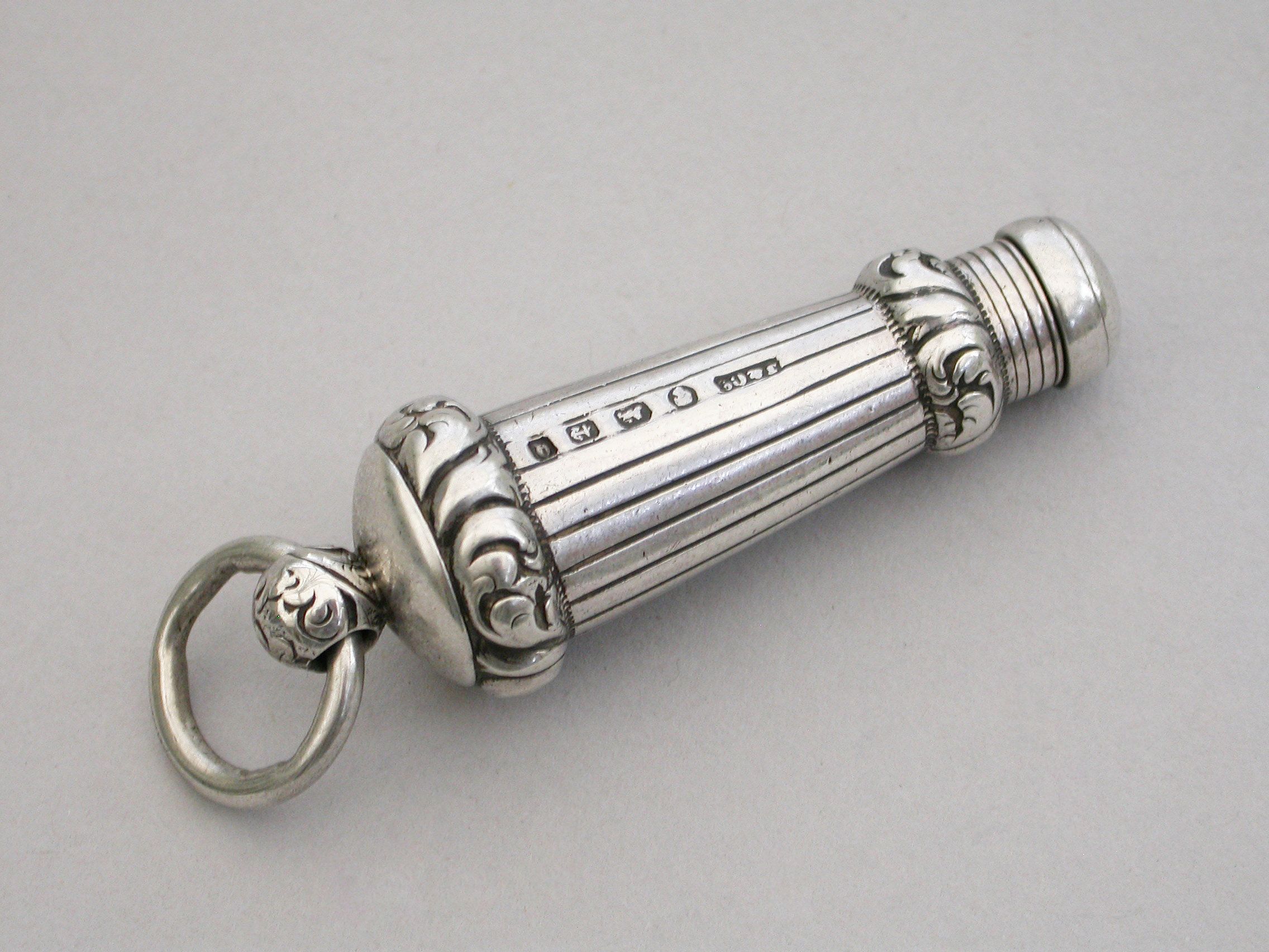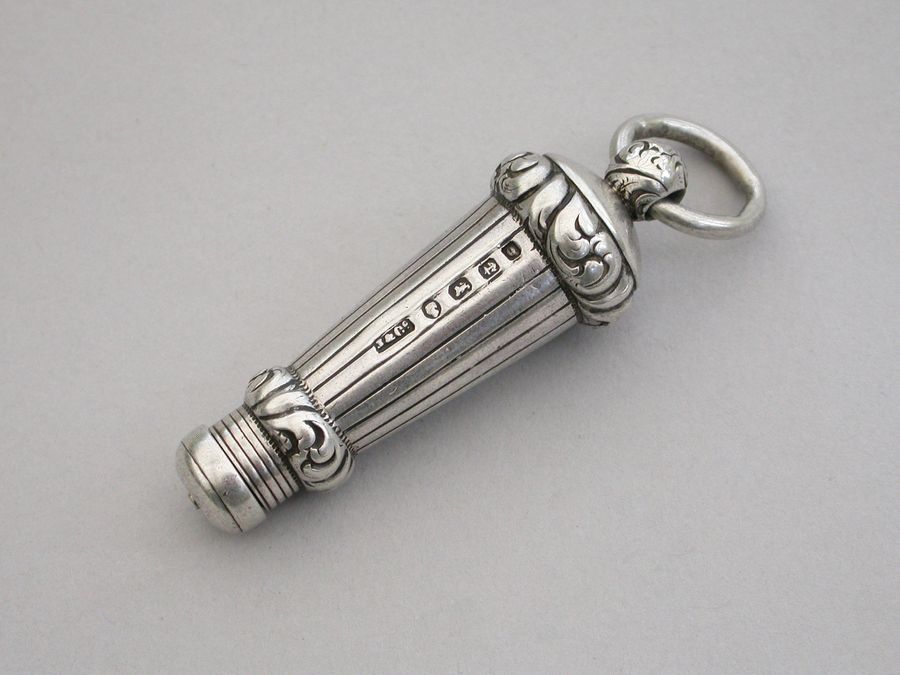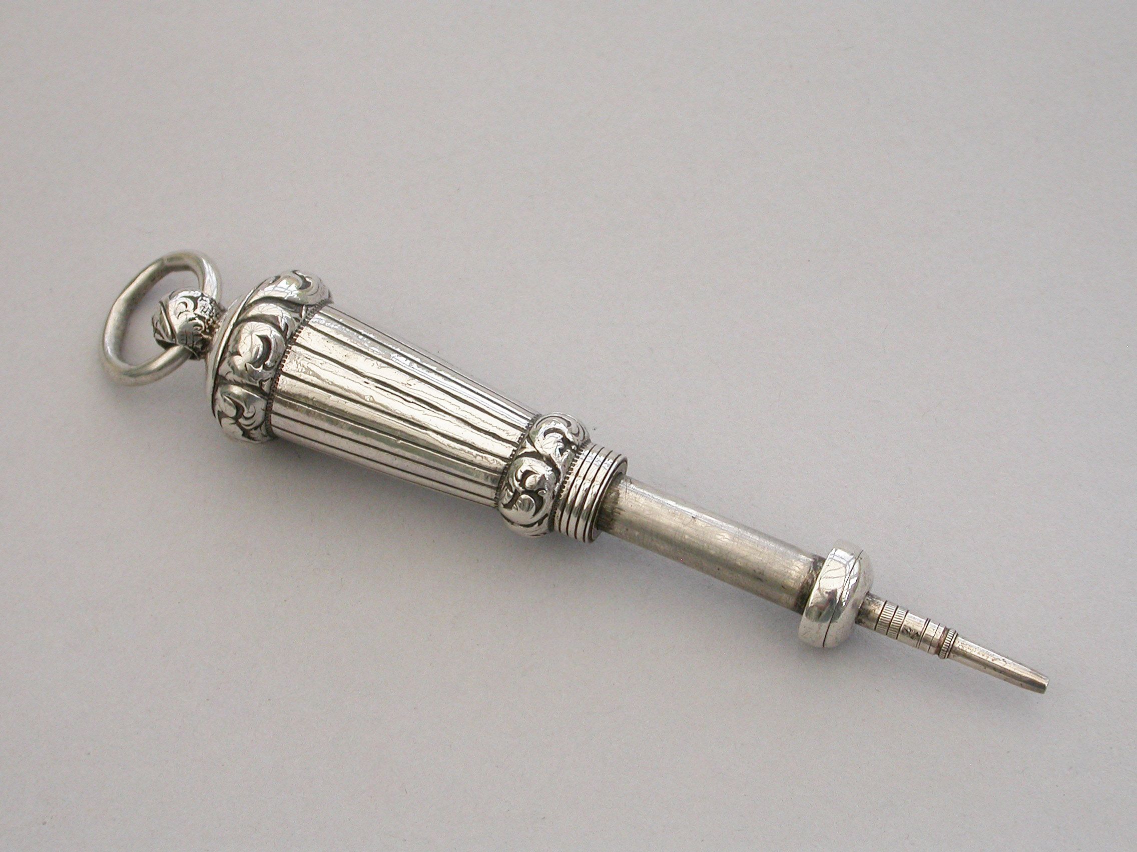 A rare mid Victorian novelty silver telescopic Propelling Pencil made in the form of a Military Whistle, with tapering reeded body and raised foliate scroll chased bands, attached suspension ring.