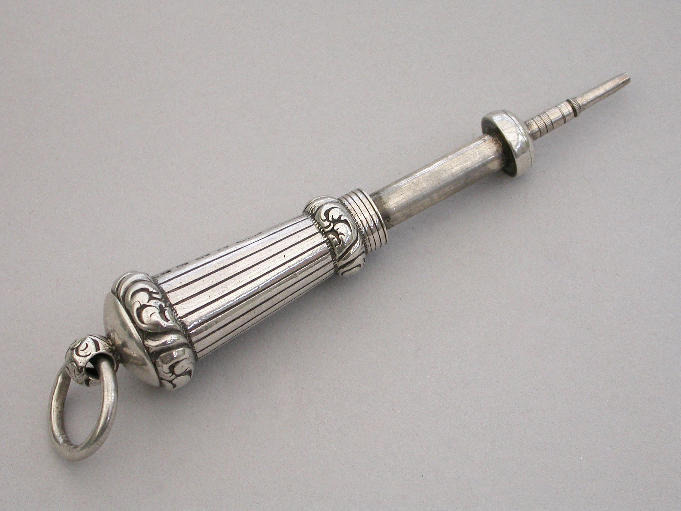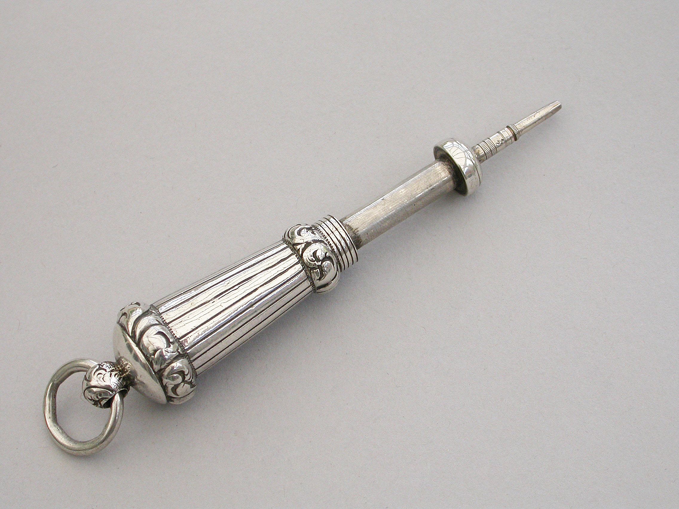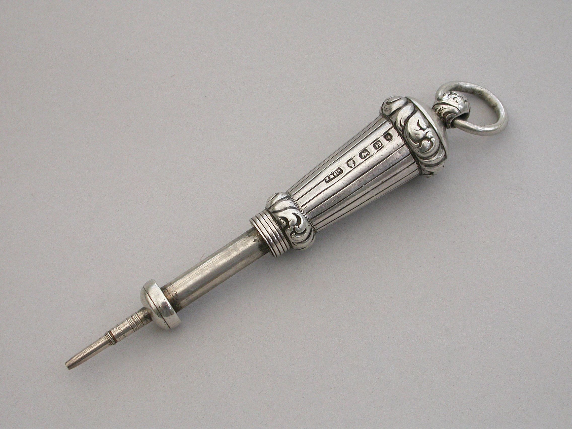 A rare mid Victorian novelty silver telescopic Propelling Pencil made in the form of a Military Whistle, with tapering reeded body and raised foliate scroll chased bands, attached suspension ring.