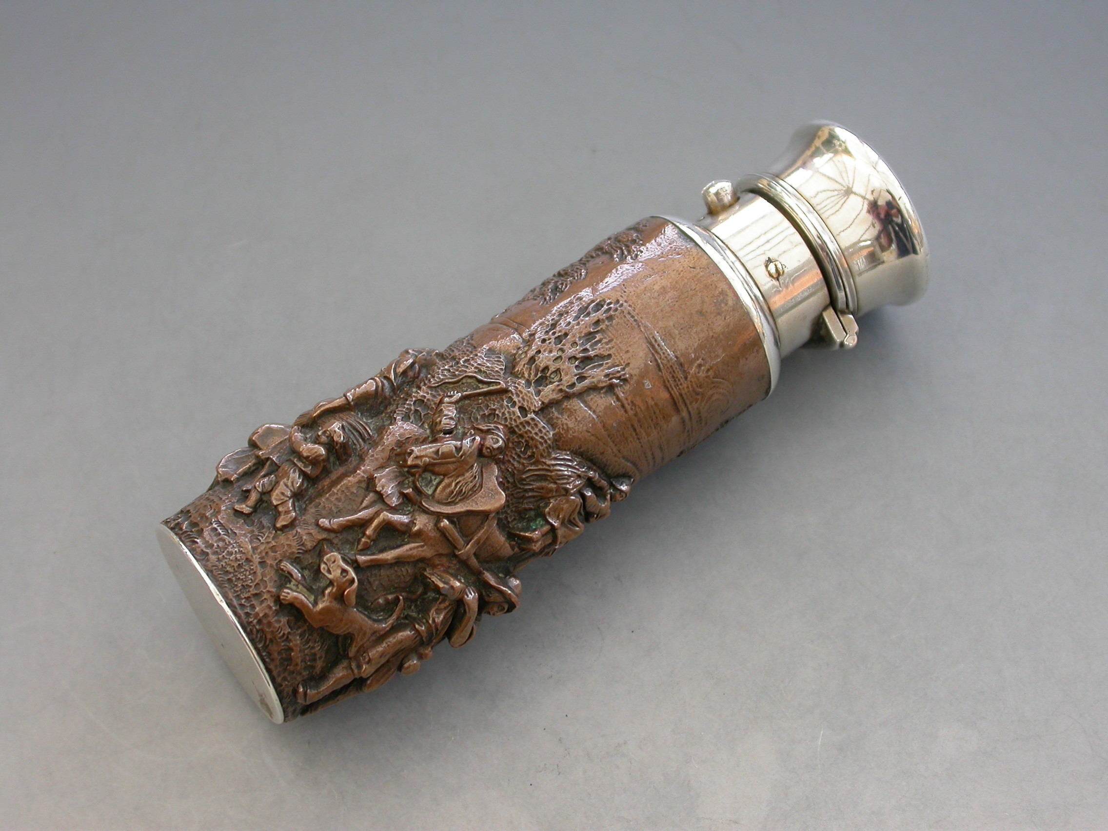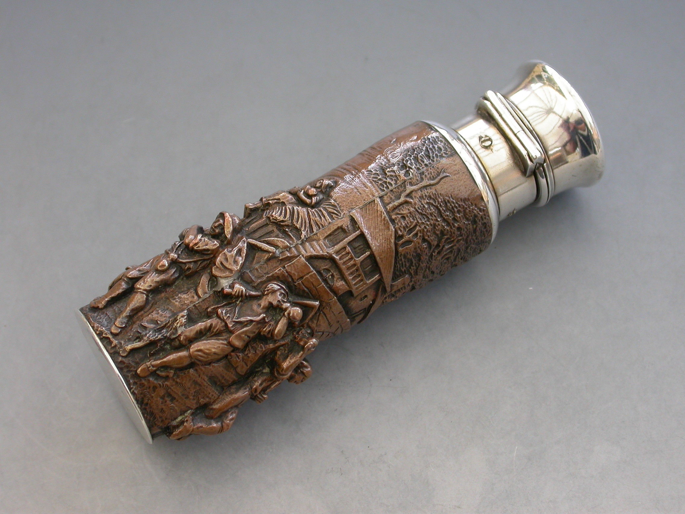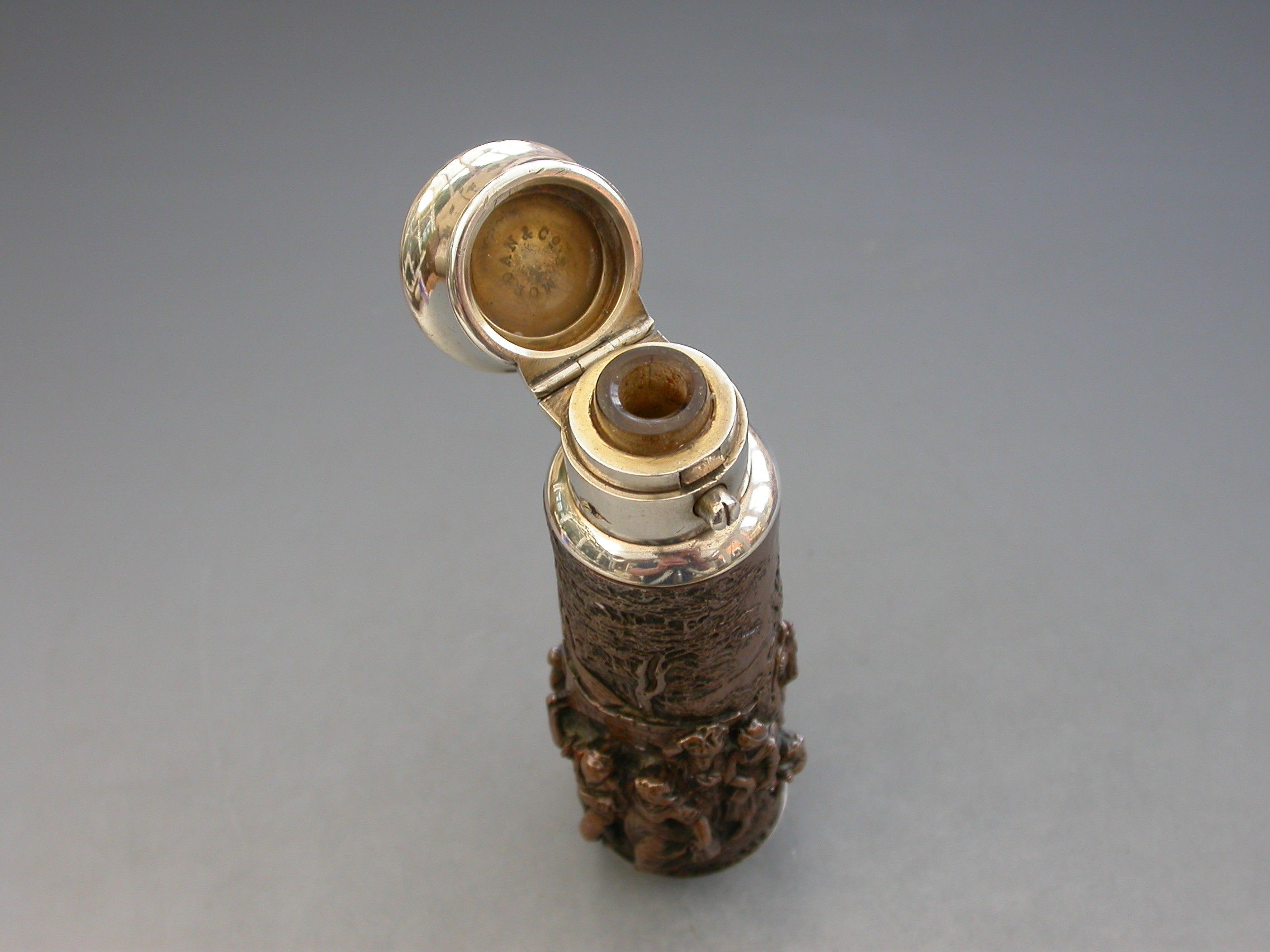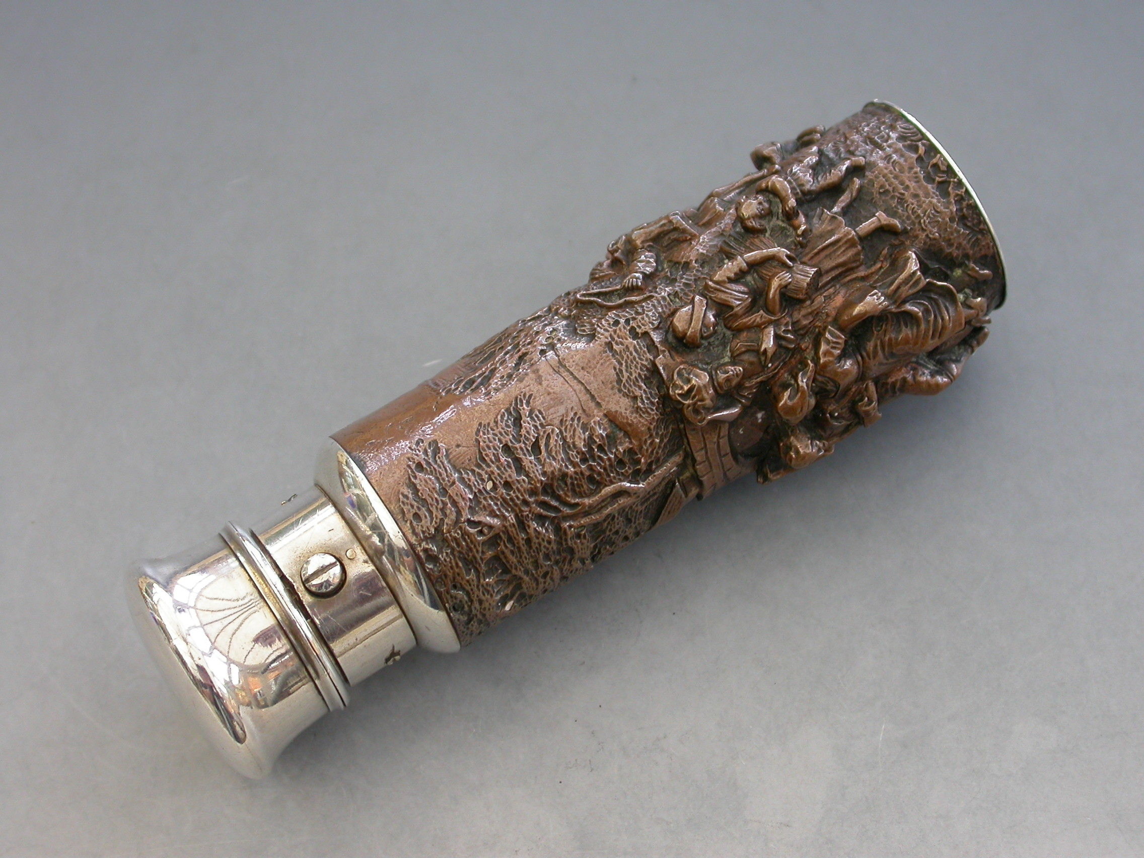 An unusual Victorian silver mounted Scent Bottle with electrotyped copper body depicting reveling peasants in landscape scenes in high relief. Spring push-button cover.