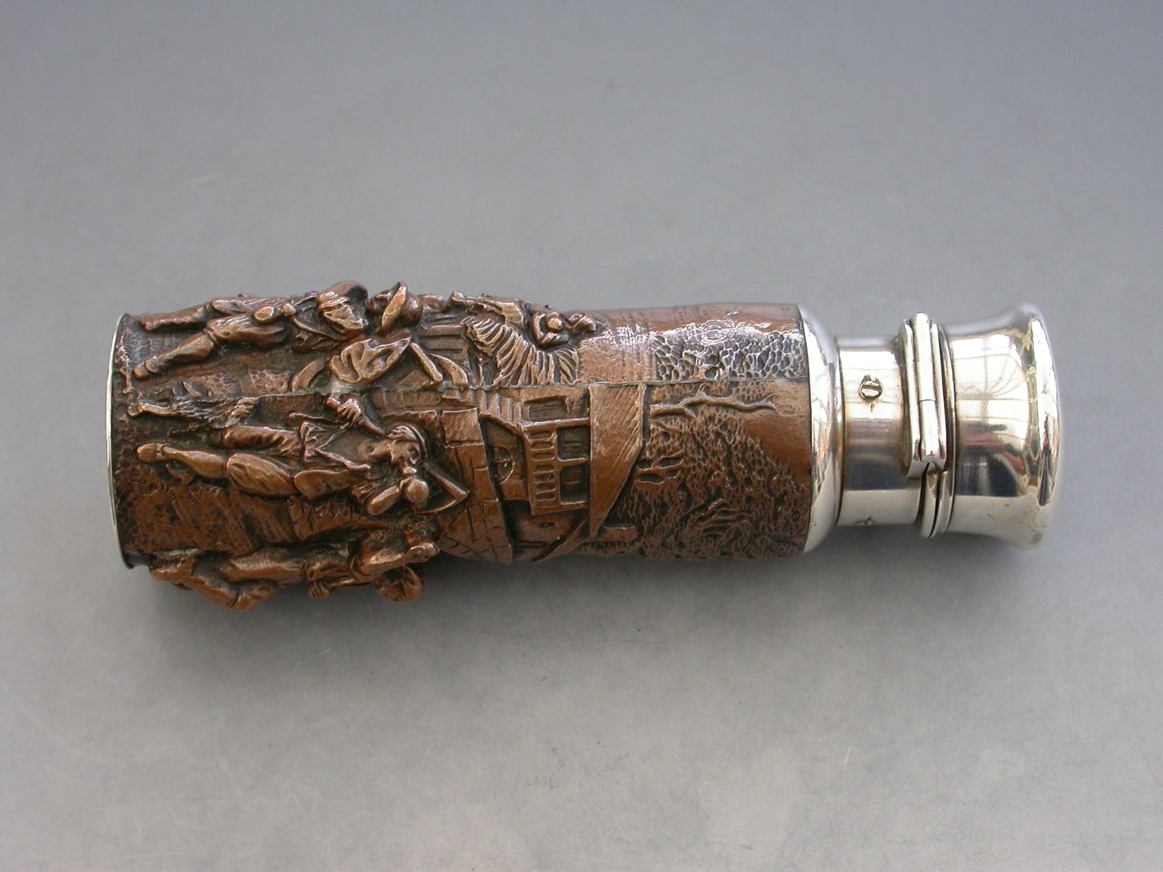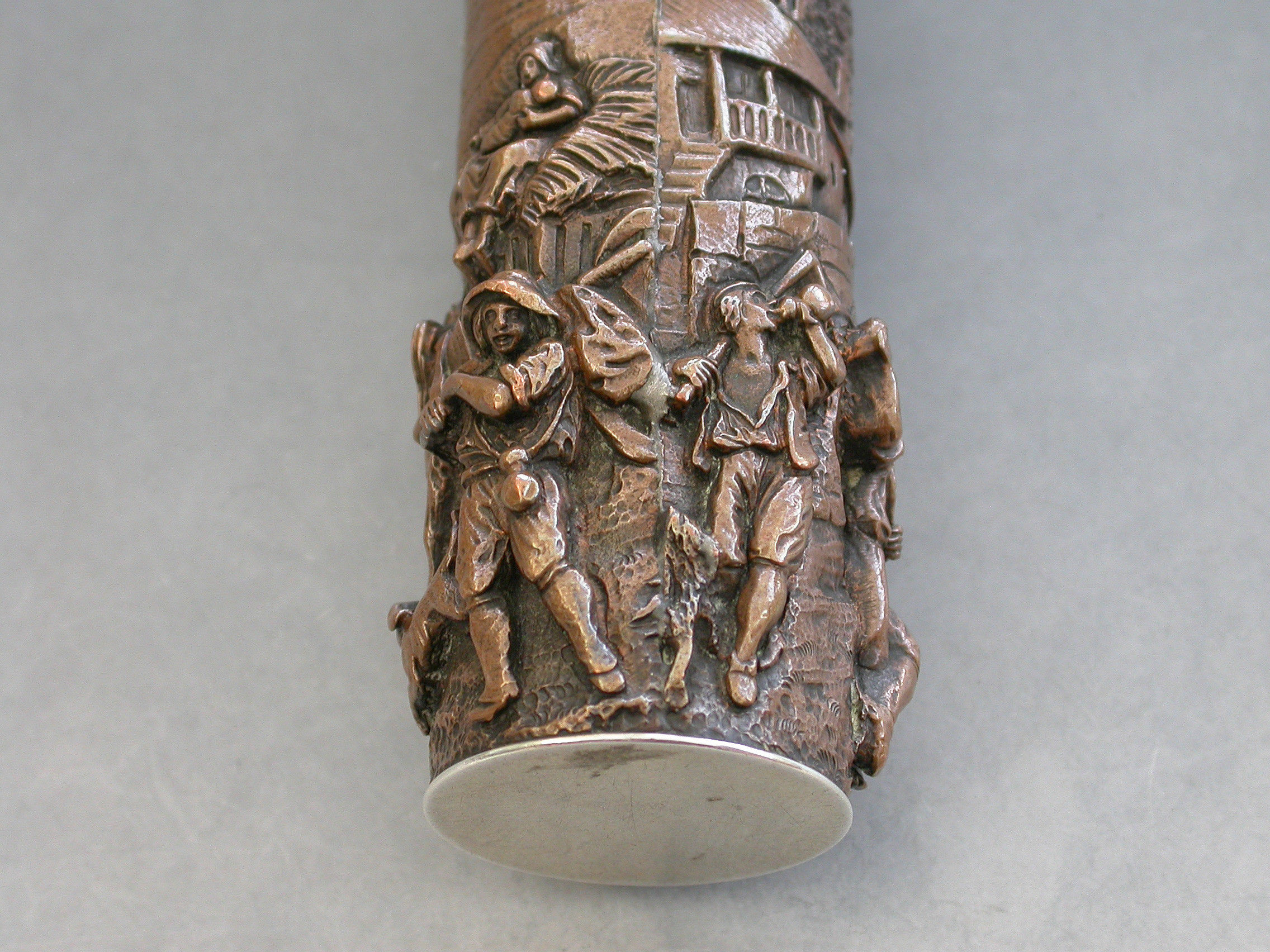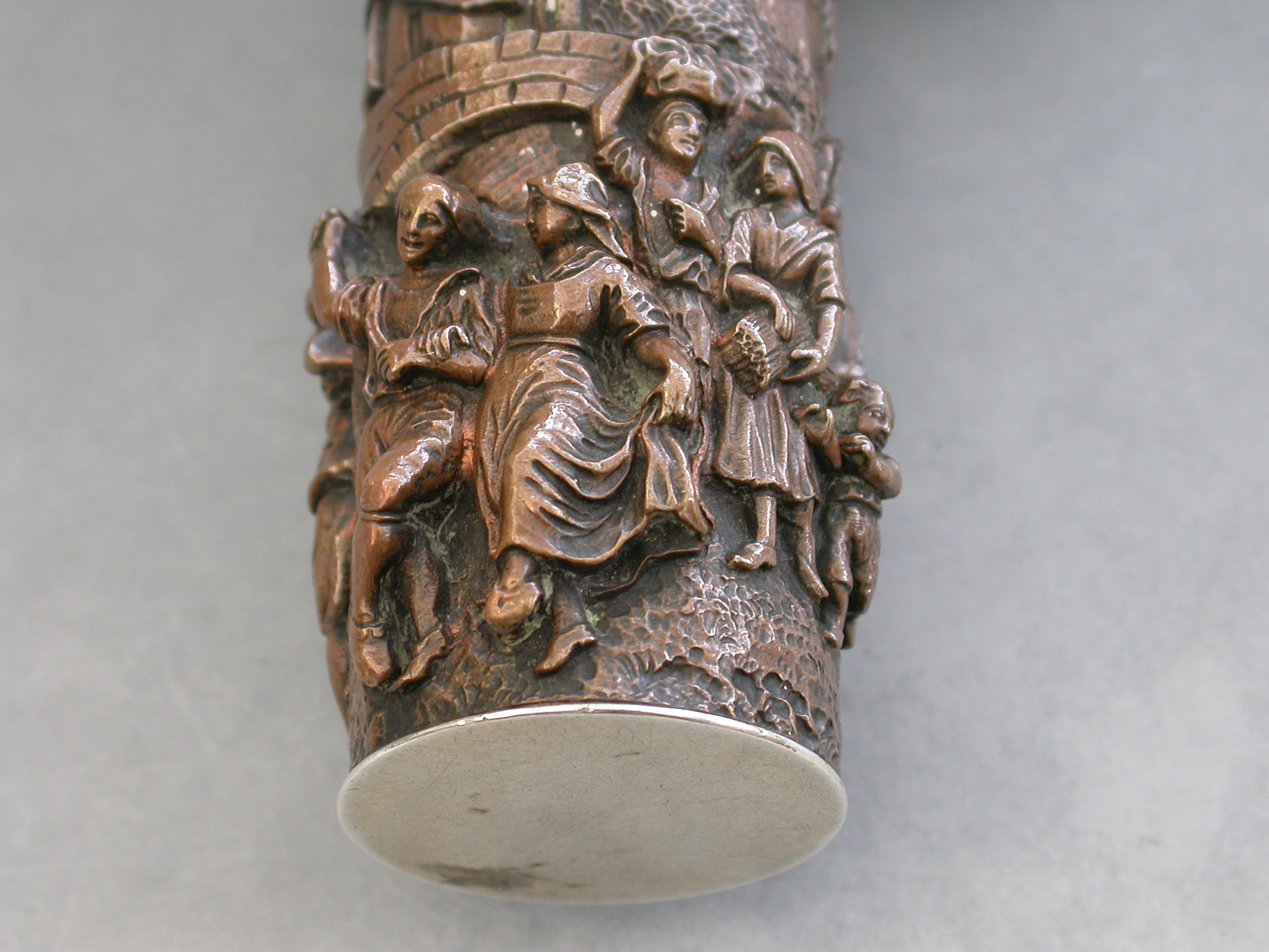 An unusual Victorian silver mounted Scent Bottle with electrotyped copper body depicting reveling peasants in landscape scenes in high relief. Spring push-button cover.