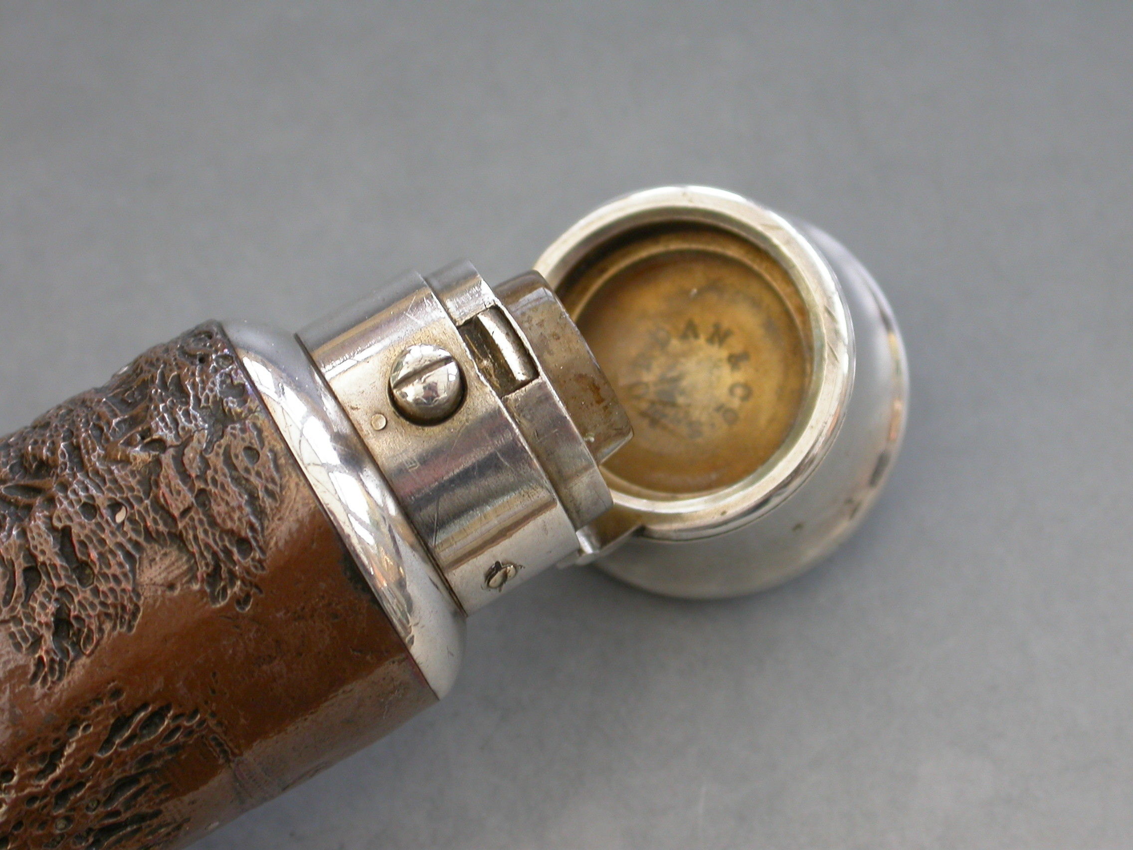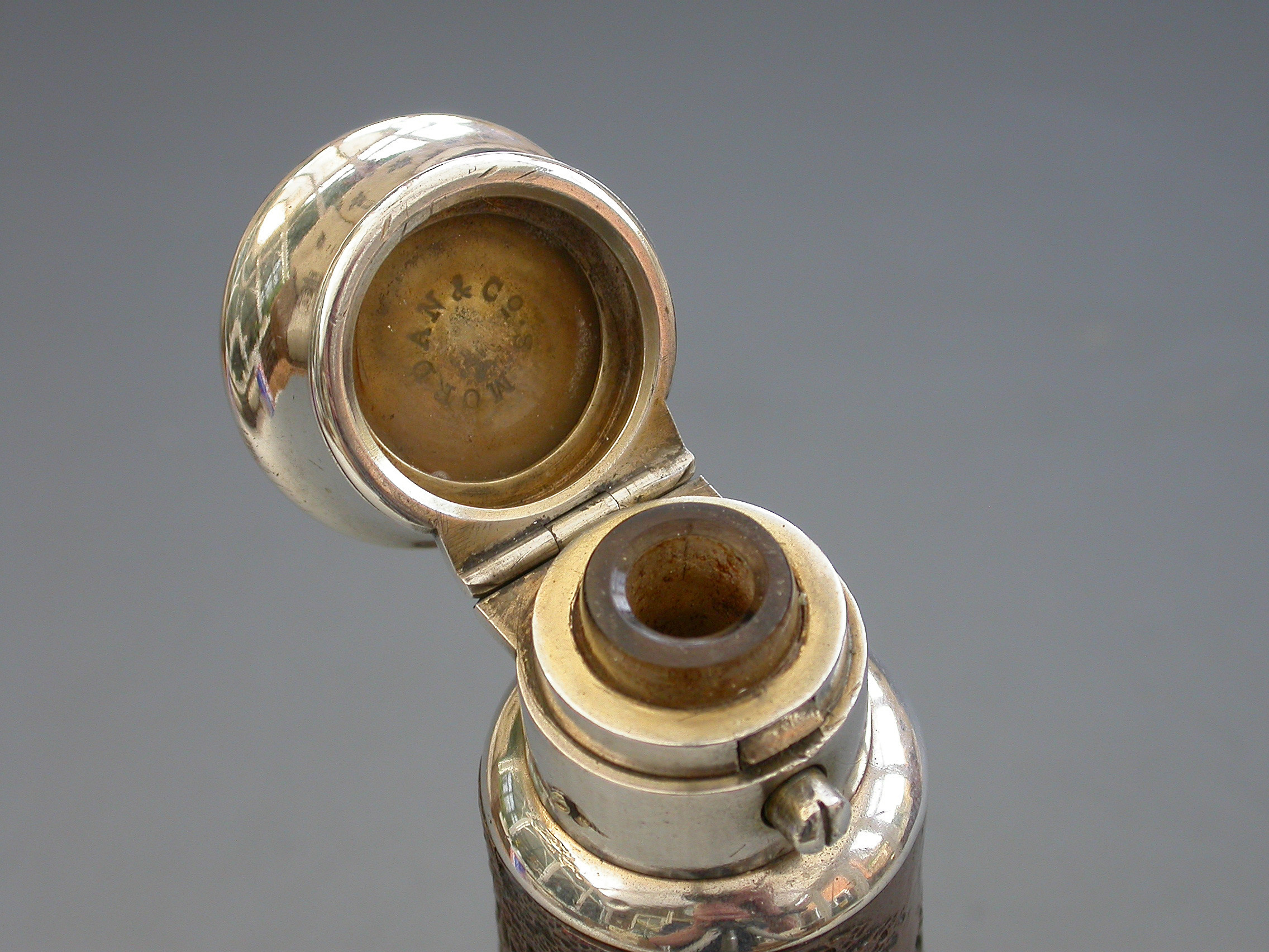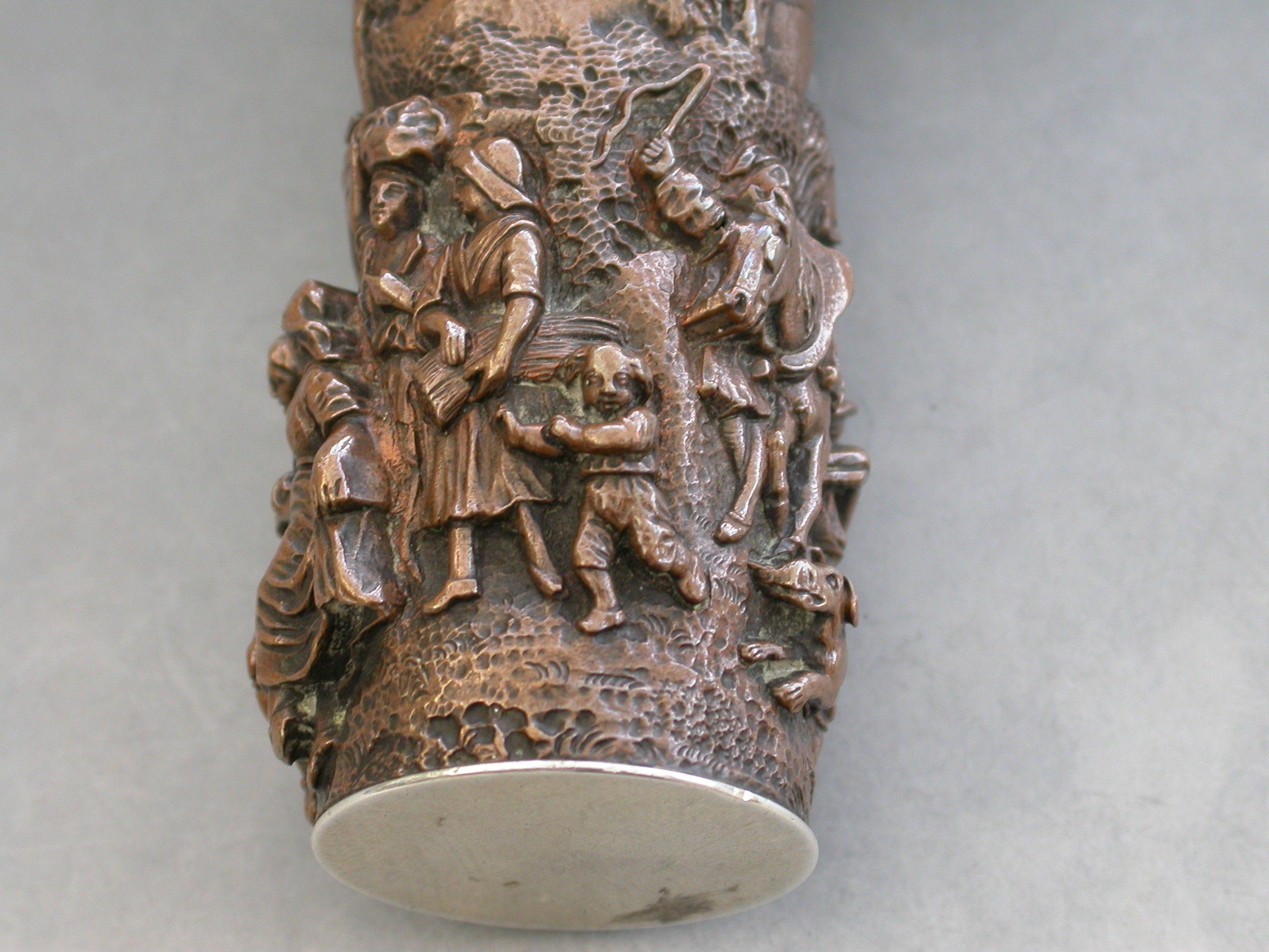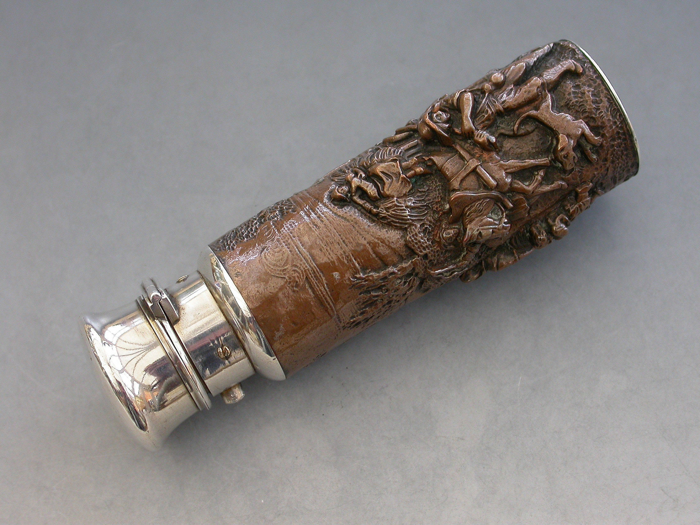 An unusual Victorian silver mounted Scent Bottle with electrotyped copper body depicting reveling peasants in landscape scenes in high relief. Spring push-button cover.