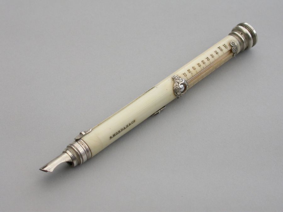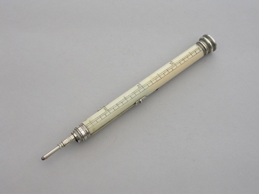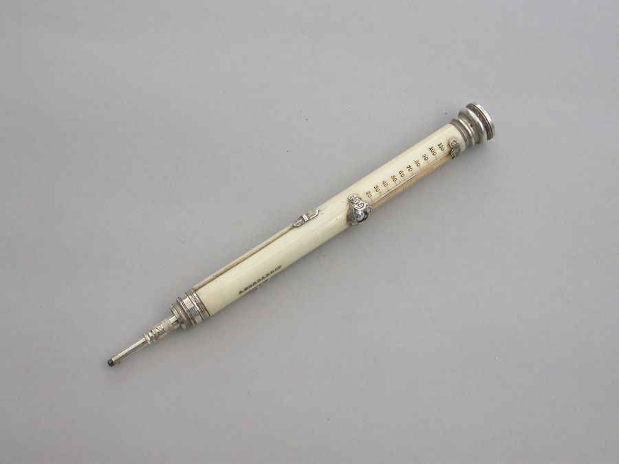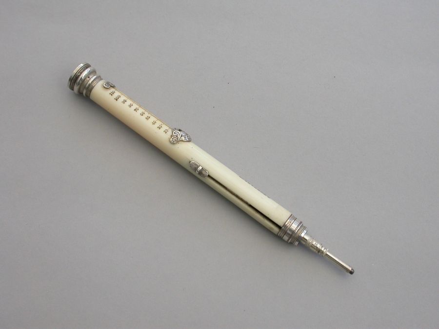A rare Victorian silver mounted ivory combination ""Companion"" Propelling Pencil, Pen, Thermometer, Compass and four inch ruler, with sliding pen and pencil housed within the cylindrical ivory body with inset fully working and calibrated glass mercury thermometer and engraved 4"" ruler. The silver finial set with a working compass.