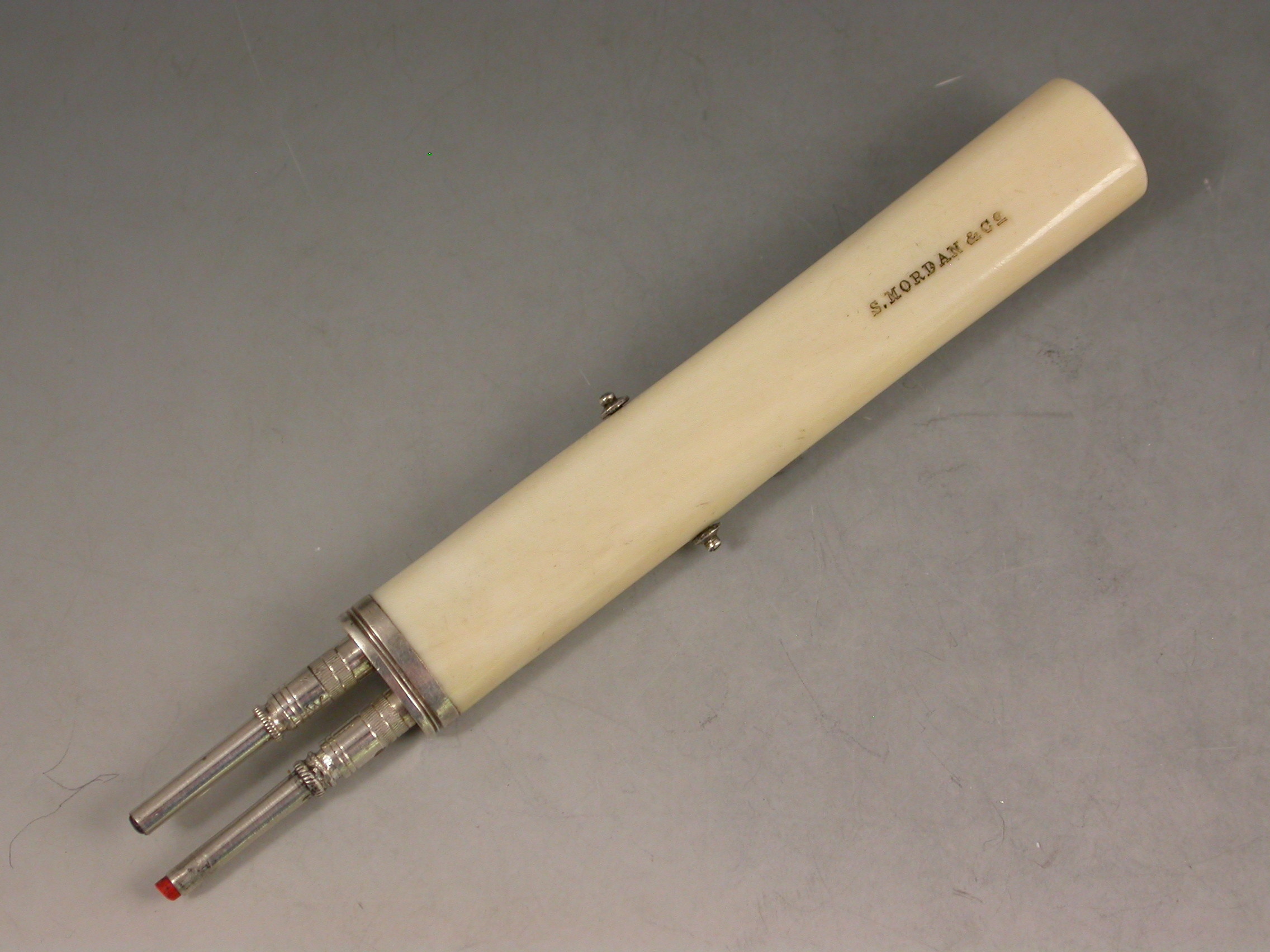 A Victorian silver mounted ivory two colour (red and blue) sliding Propelling Pencil, the flat rounded ivory body stamped : S Mordan & Co. A separate slider button on each side to extend the pencils independently.