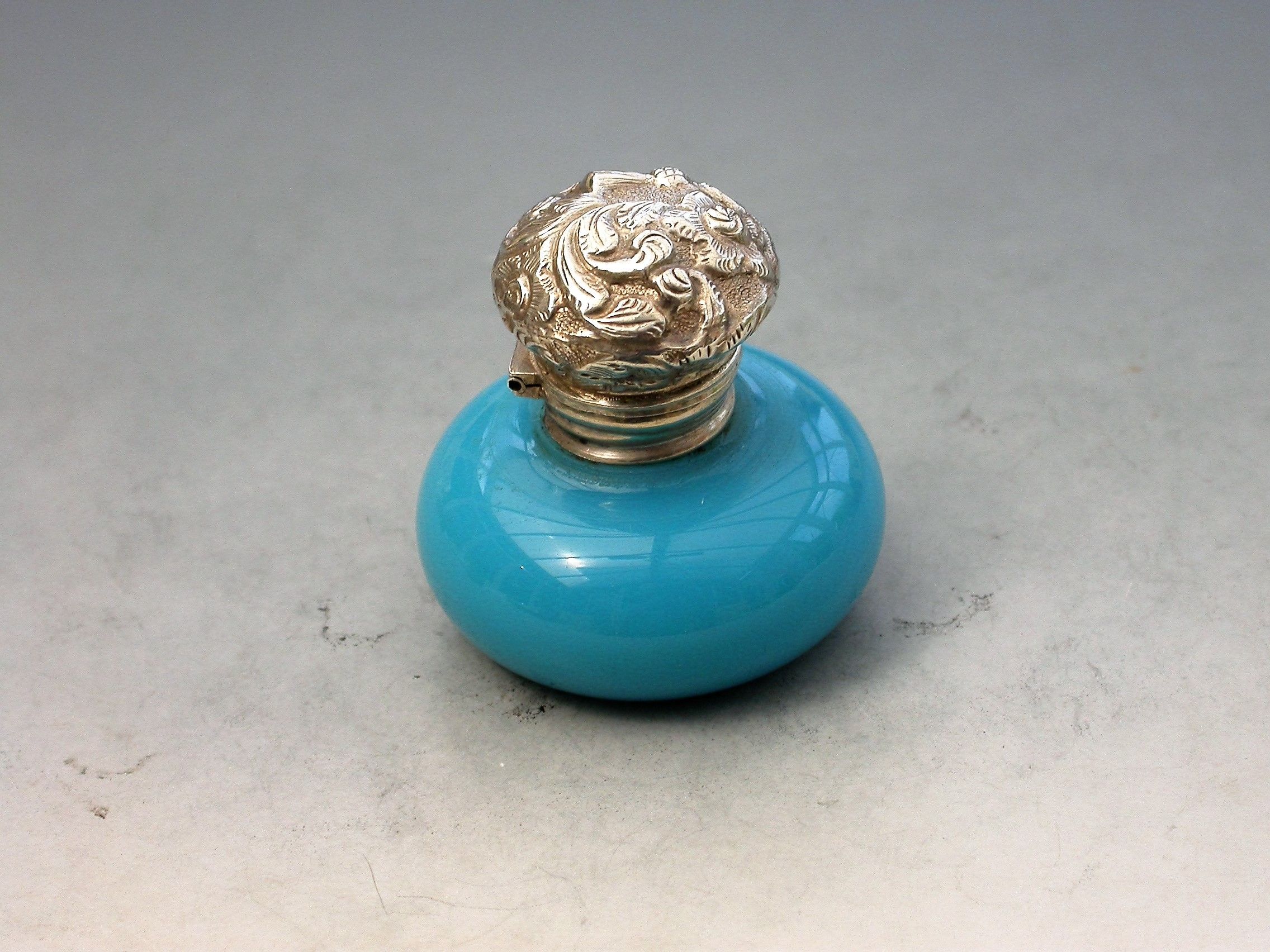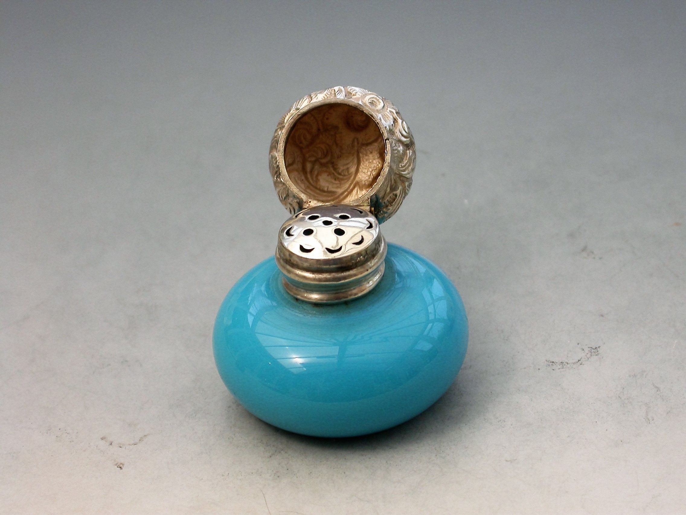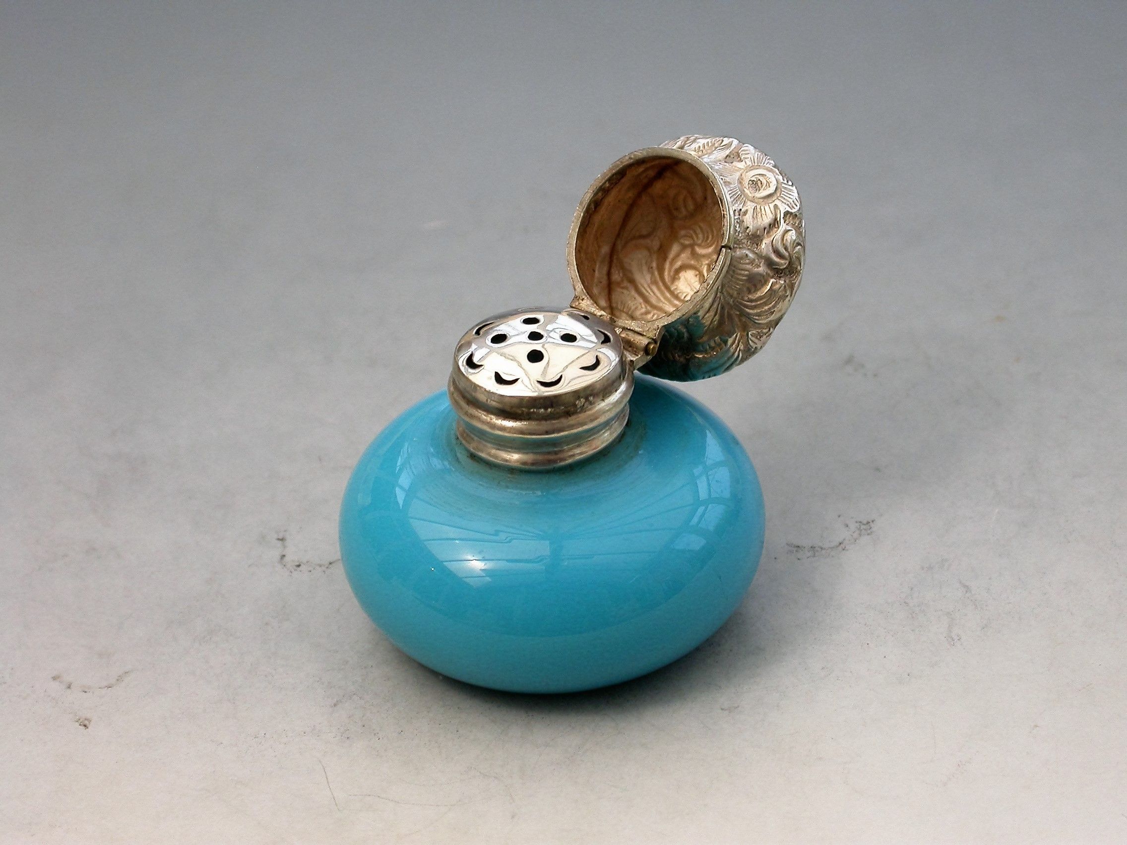 A Victorian silver mounted opaque turquoise glass Vinaigrette / Scent Bottle, the silver top chased with flowers and scrolls hinges open to reveal a pierced grille.