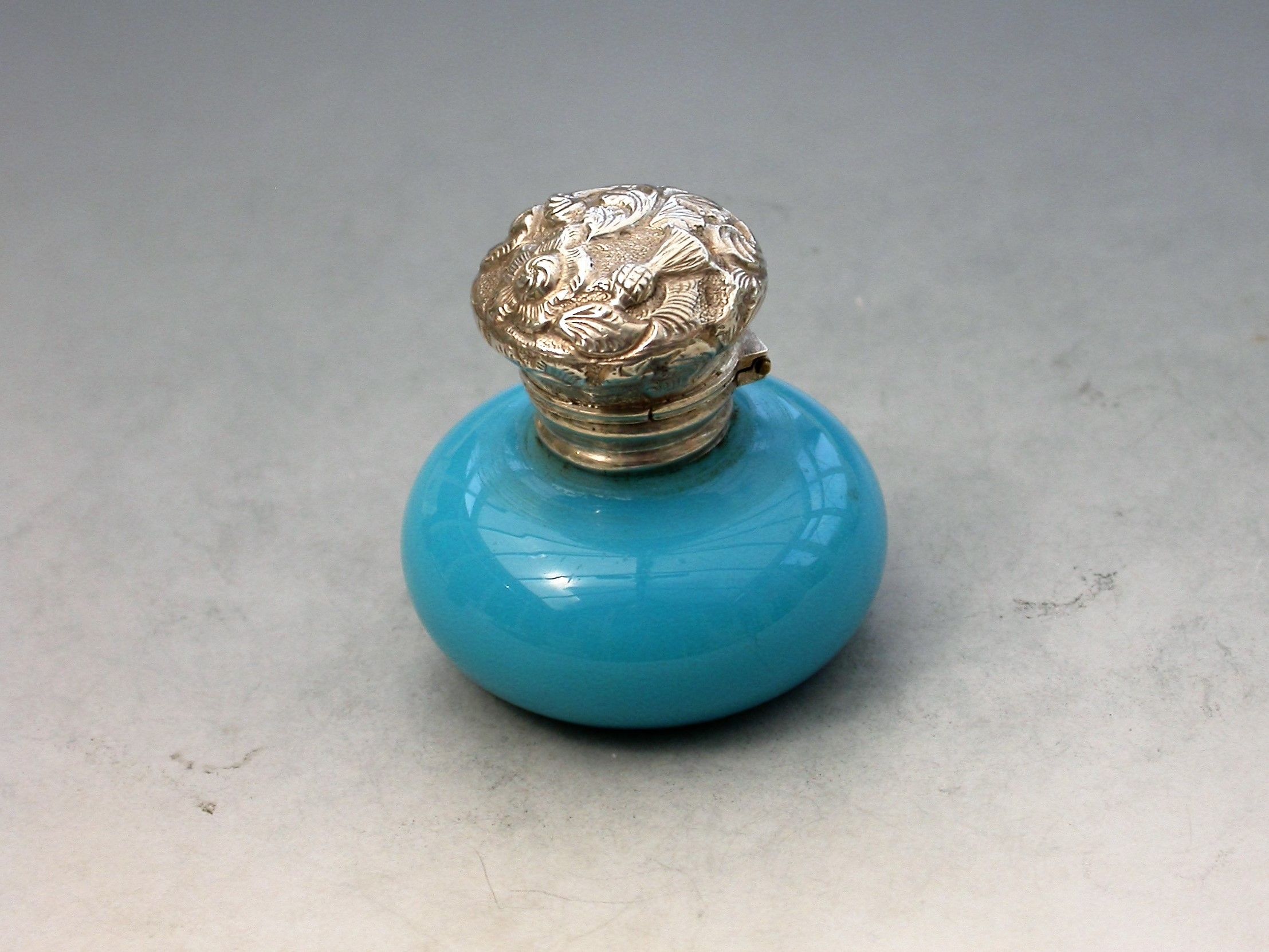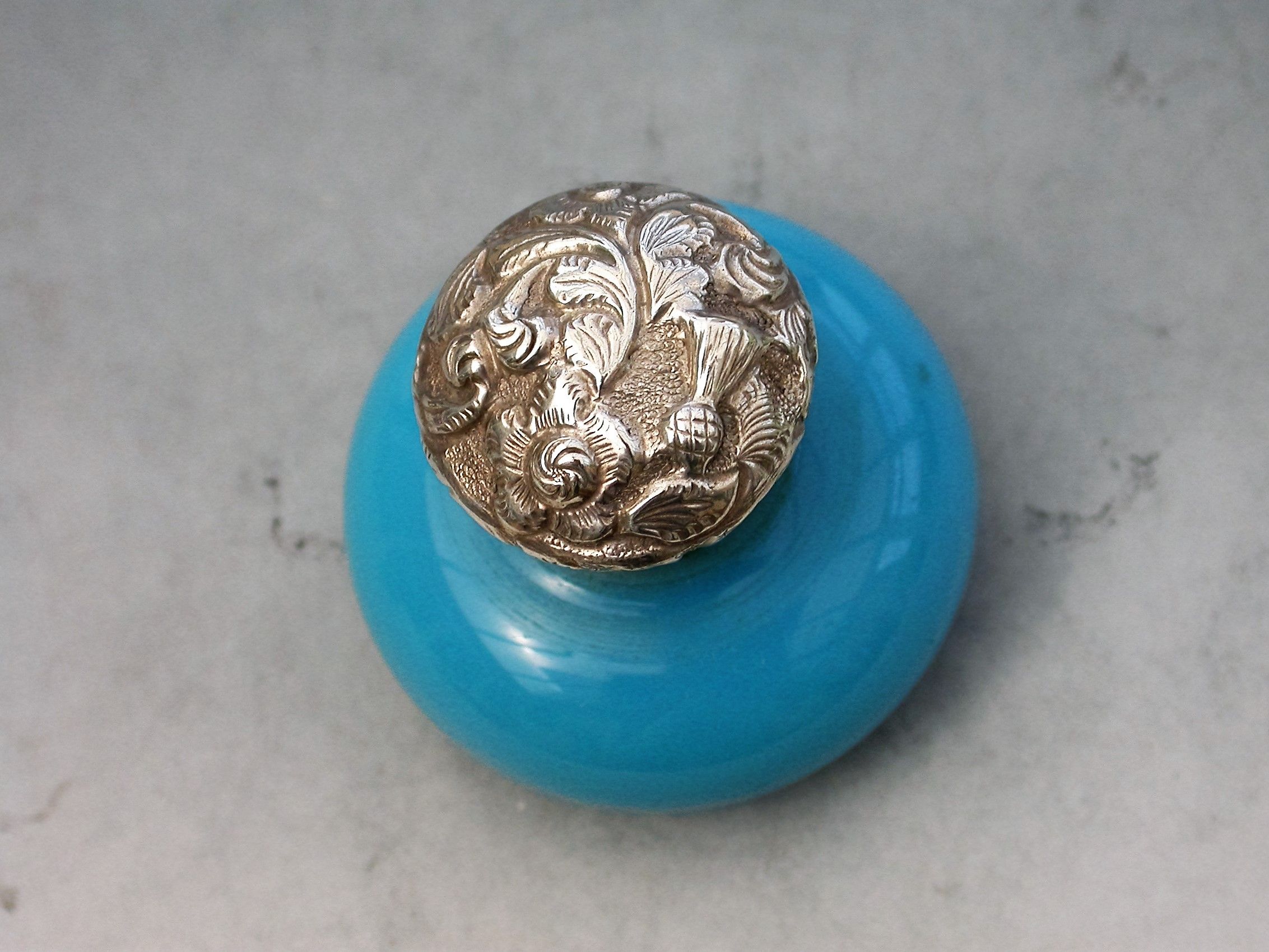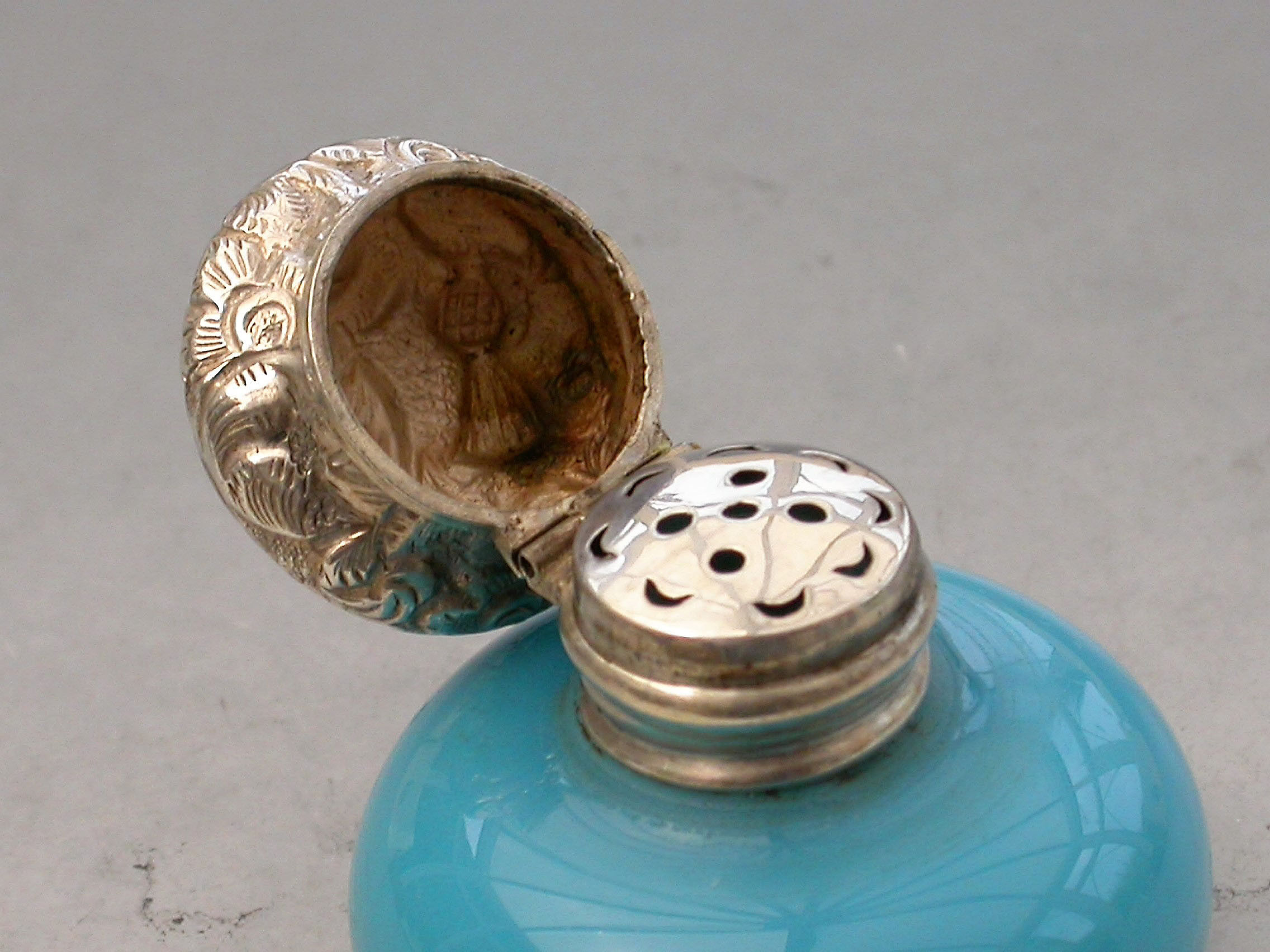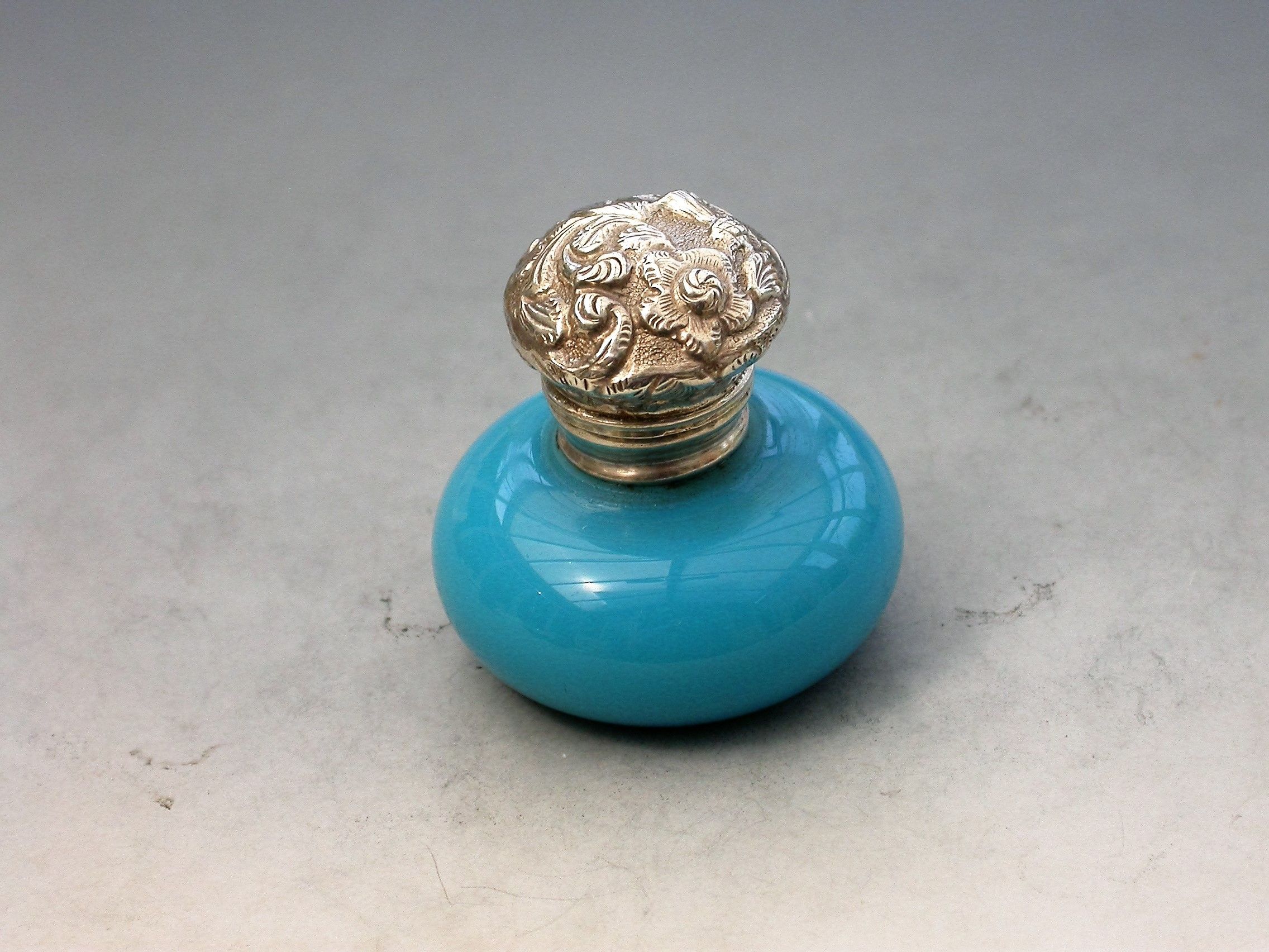 A Victorian silver mounted opaque turquoise glass Vinaigrette / Scent Bottle, the silver top chased with flowers and scrolls hinges open to reveal a pierced grille.