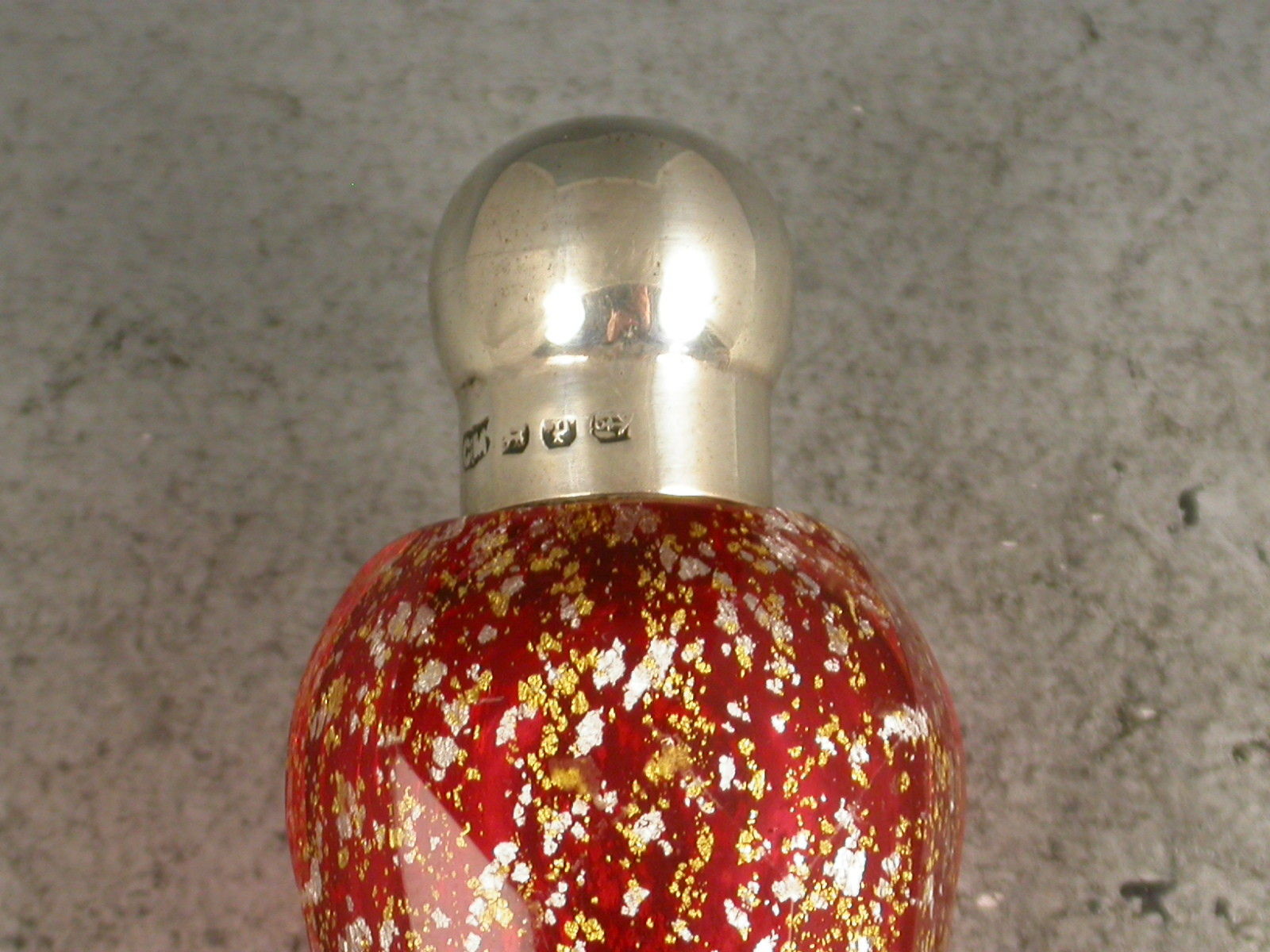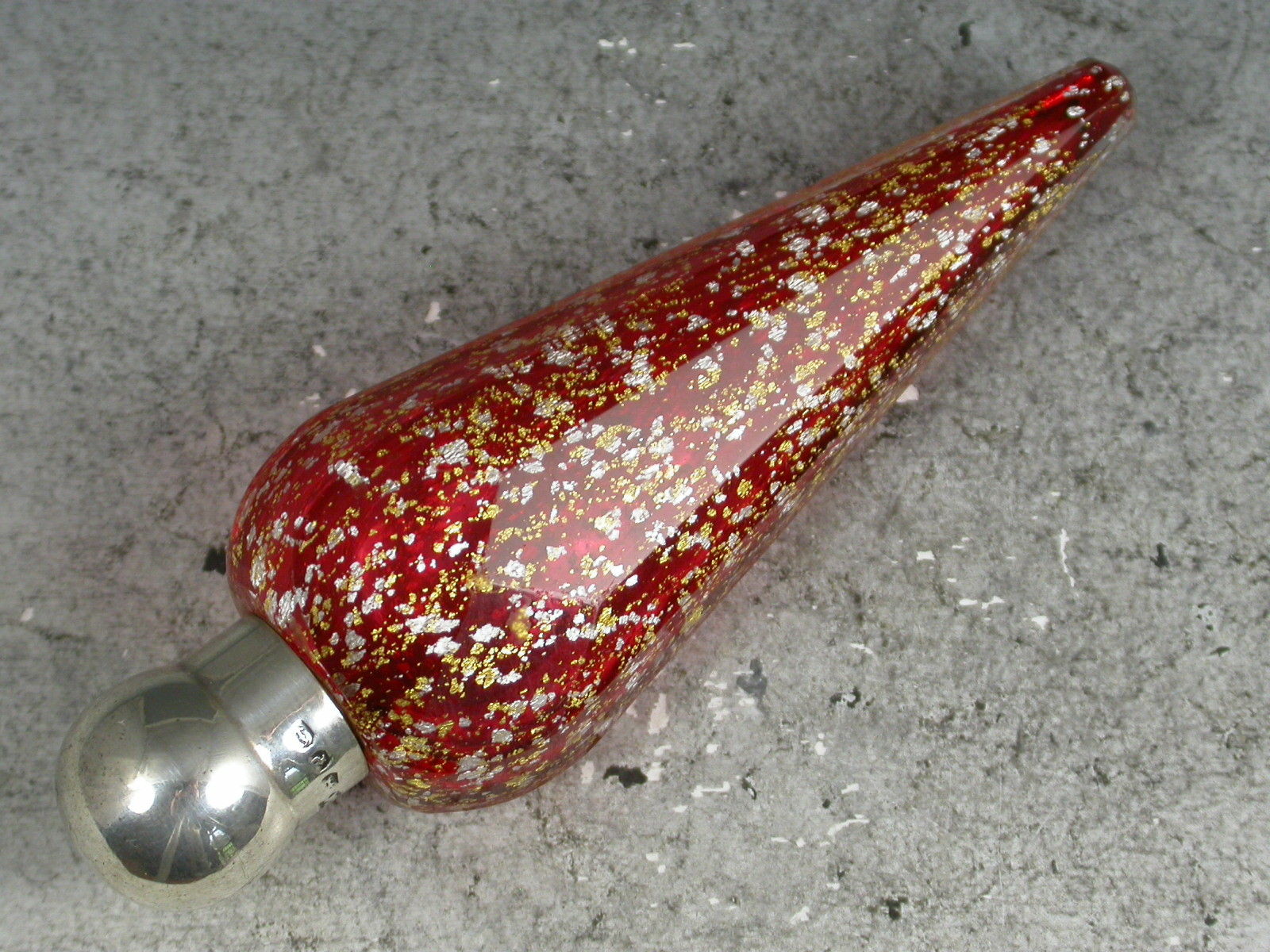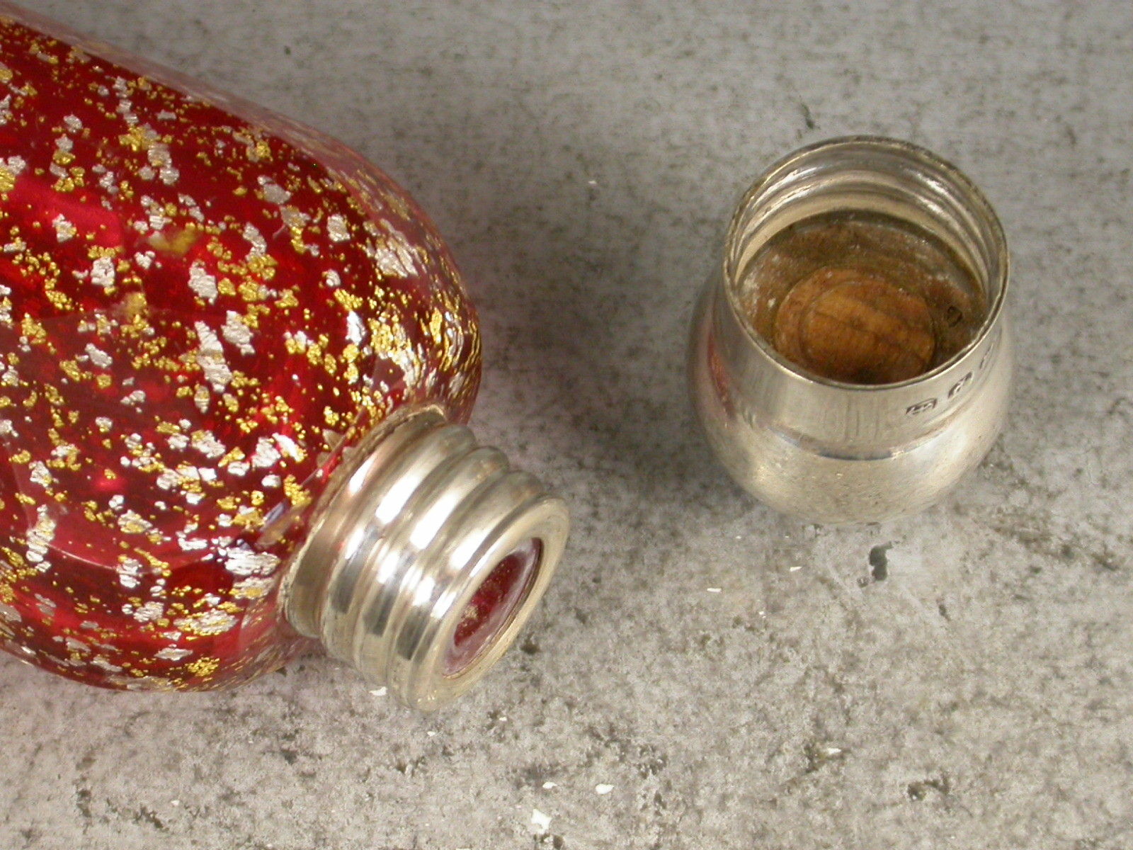 A good Victorian silver mounted ruby glass Scent Bottle of conical form with faceted sides, the glass encasing fragments of gold and silver leaf, probably made in Stourbridge c1880 - 1900. The silver top by Charles May, Birmingham, 1890.